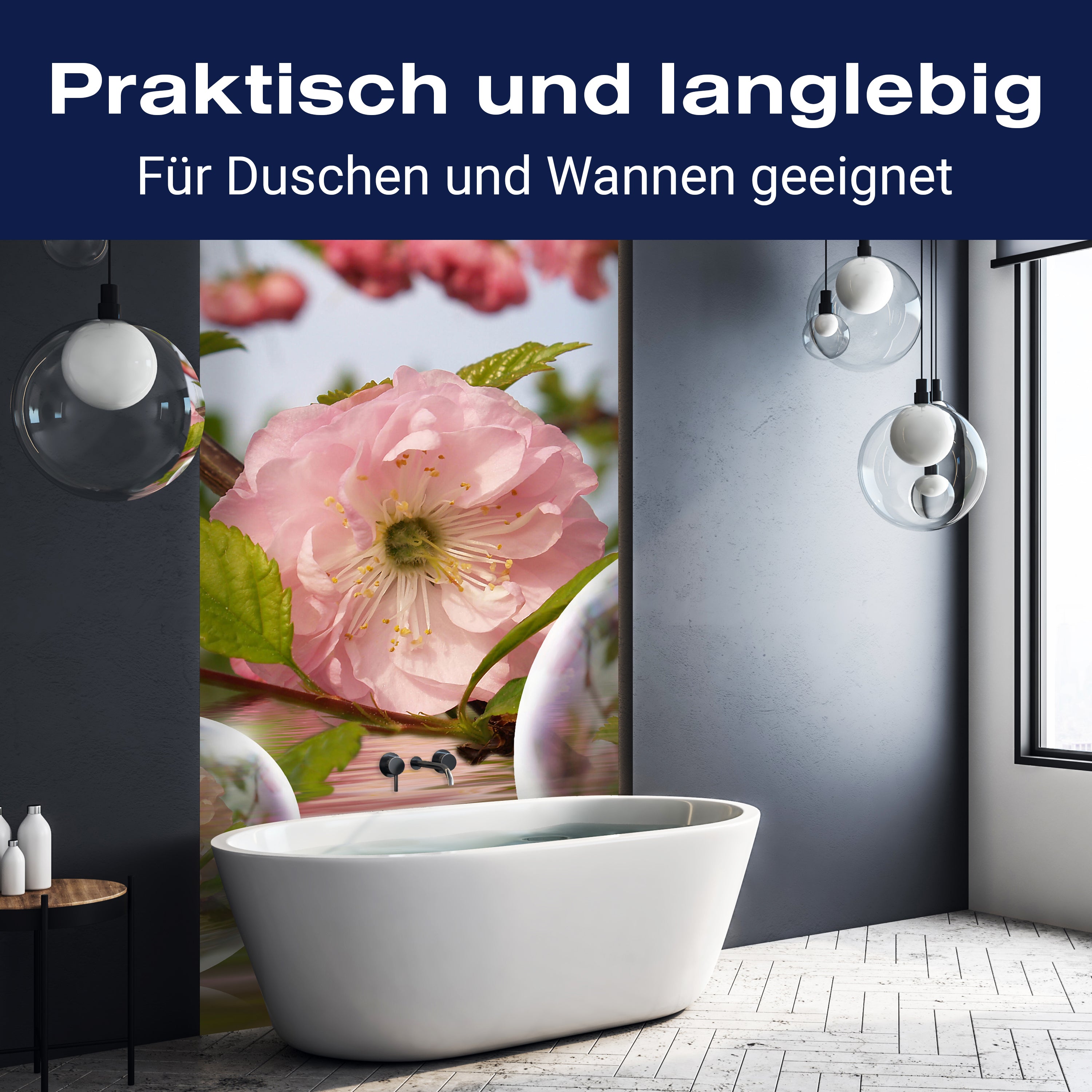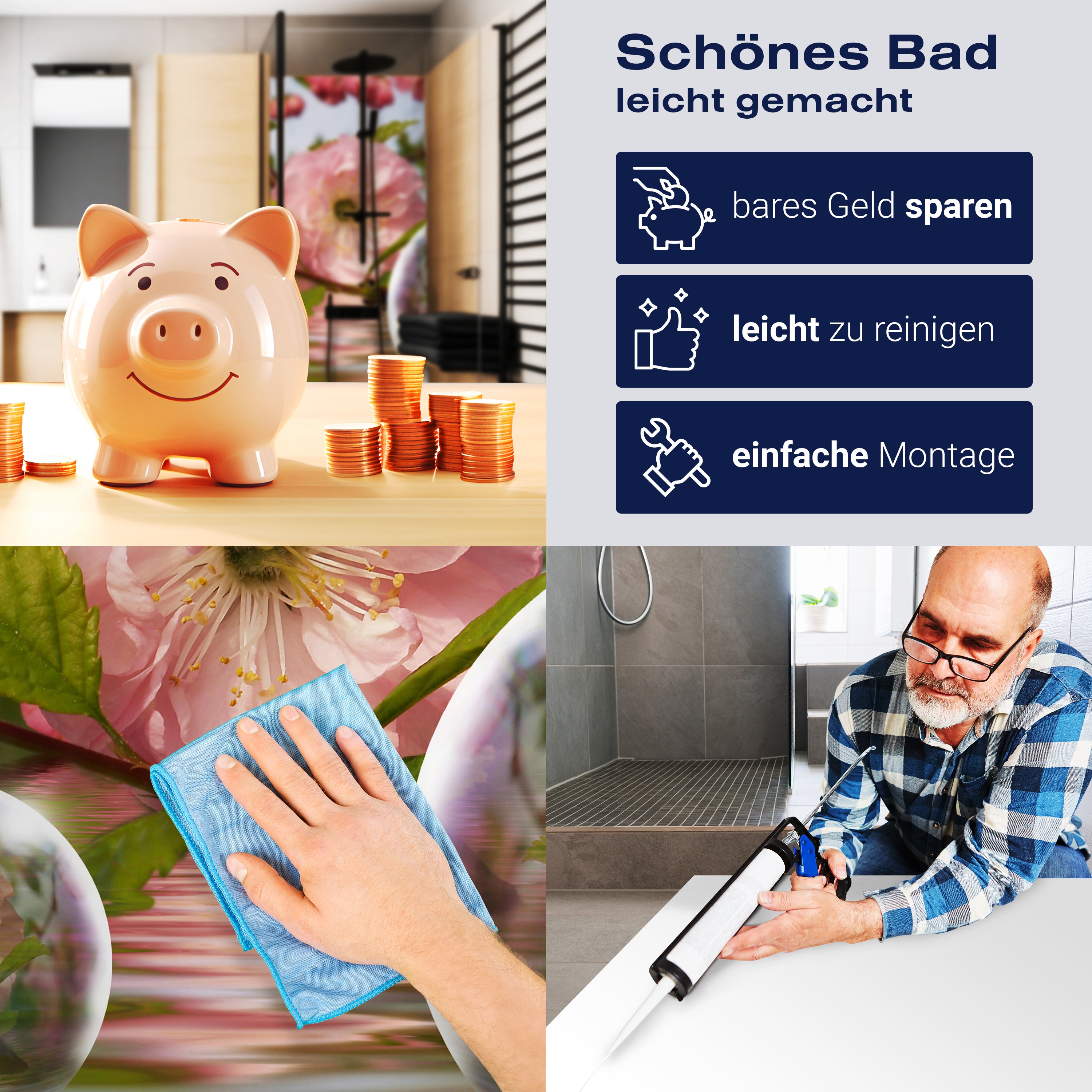 Vergiss die Tage, an denen Spritzer und Flecken deine Dusche ruiniert haben. Mit der Duschrückwand 'Seifenblasen' gehören solche Sorgen der Vergangenheit an. Das hochwertige Material sorgt dafür, dass deine Dusche gegen Wasser und andere alltägliche Missgeschicke resistent ist. Ein einfacher Wisch, und sie sieht aus wie neu – ohne den Einsatz von aggressiven Reinigungsmitteln.