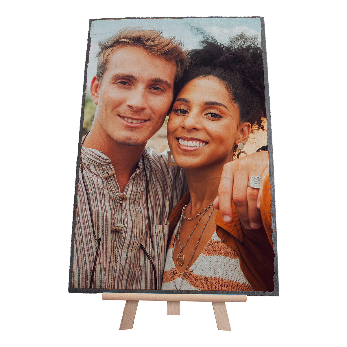 Die Schieferplatte mit Staffelei ist nicht nur ein Bild, sondern eine Liebeserklärung in jedem Detail. Das rustikale Schiefermaterial verleiht eurem Foto eine authentische und zeitlose Note. Jede Schieferplatte erzählt eine Geschichte – eure Geschichte. Ein besonderes Geschenk, das nicht nur die Augen, sondern auch die Herzen berührt.