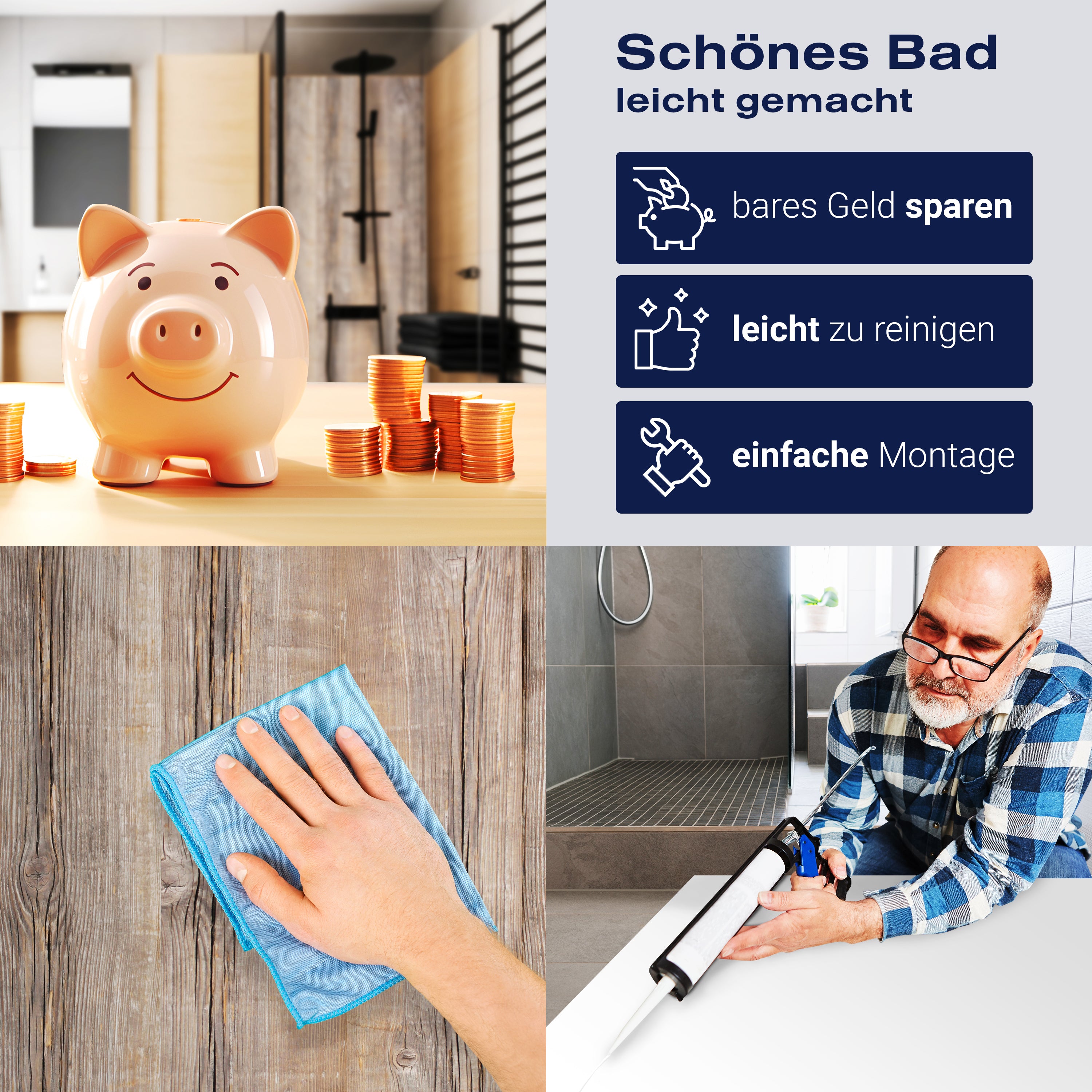Die Reinigung Deiner Duschwand war noch nie so einfach. In einer Welt, in der Zeit ein kostbares Gut ist, verstehen wir, wie wichtig es ist, Reinigungsprozesse so effizient und mühelos wie möglich zu gestalten. Unsere Duschwände sind speziell dafür entworfen, Dein Leben leichter zu machen. Dank der glatten Oberfläche und der widerstandsfähigen Beschichtung lassen sich Spritzer und Flecken ohne großen Aufwand entfernen – ein schneller Wisch mit einem handelsüblichen Lappen, Spül- oder Wischtuch, und Deine Rückwand sieht aus wie neu.