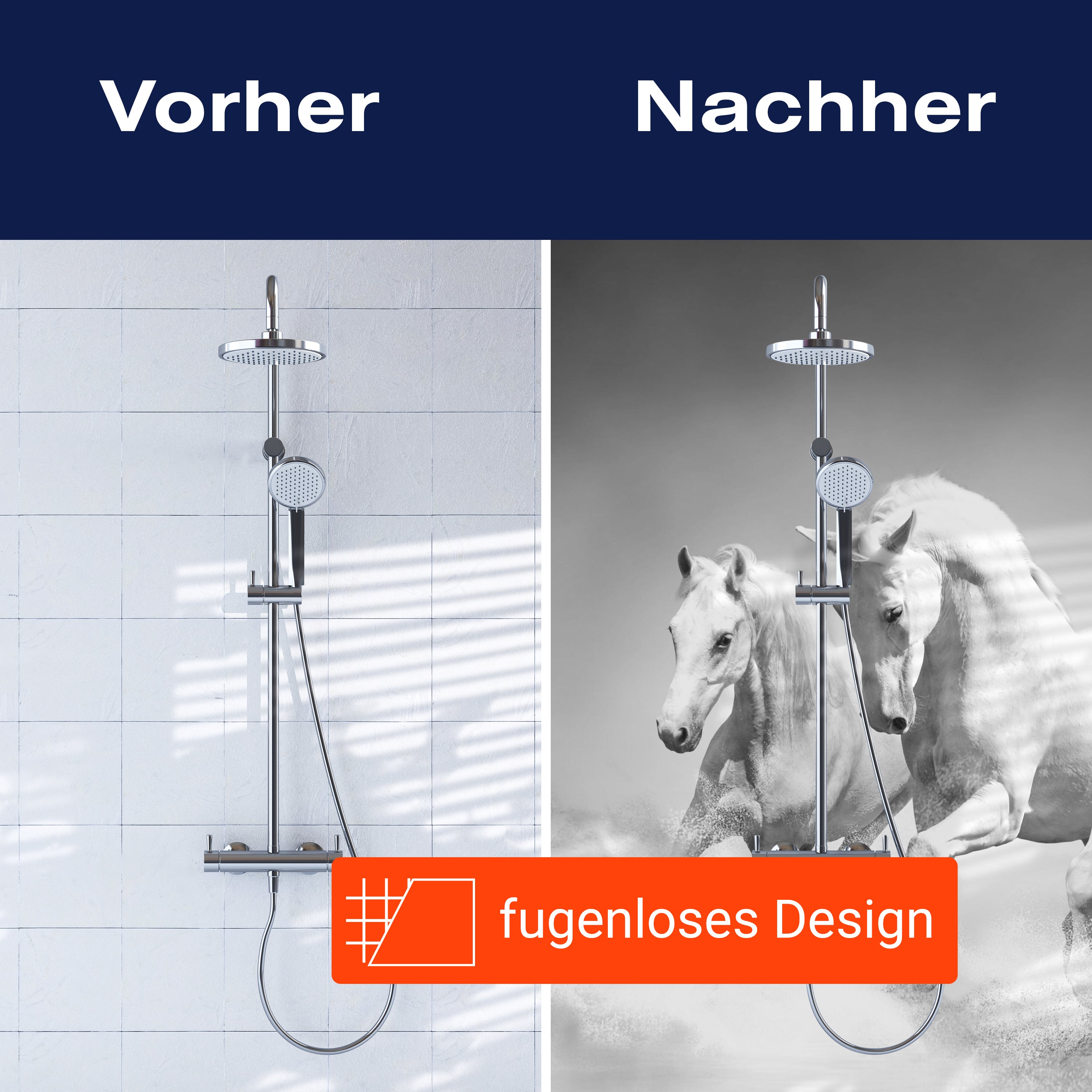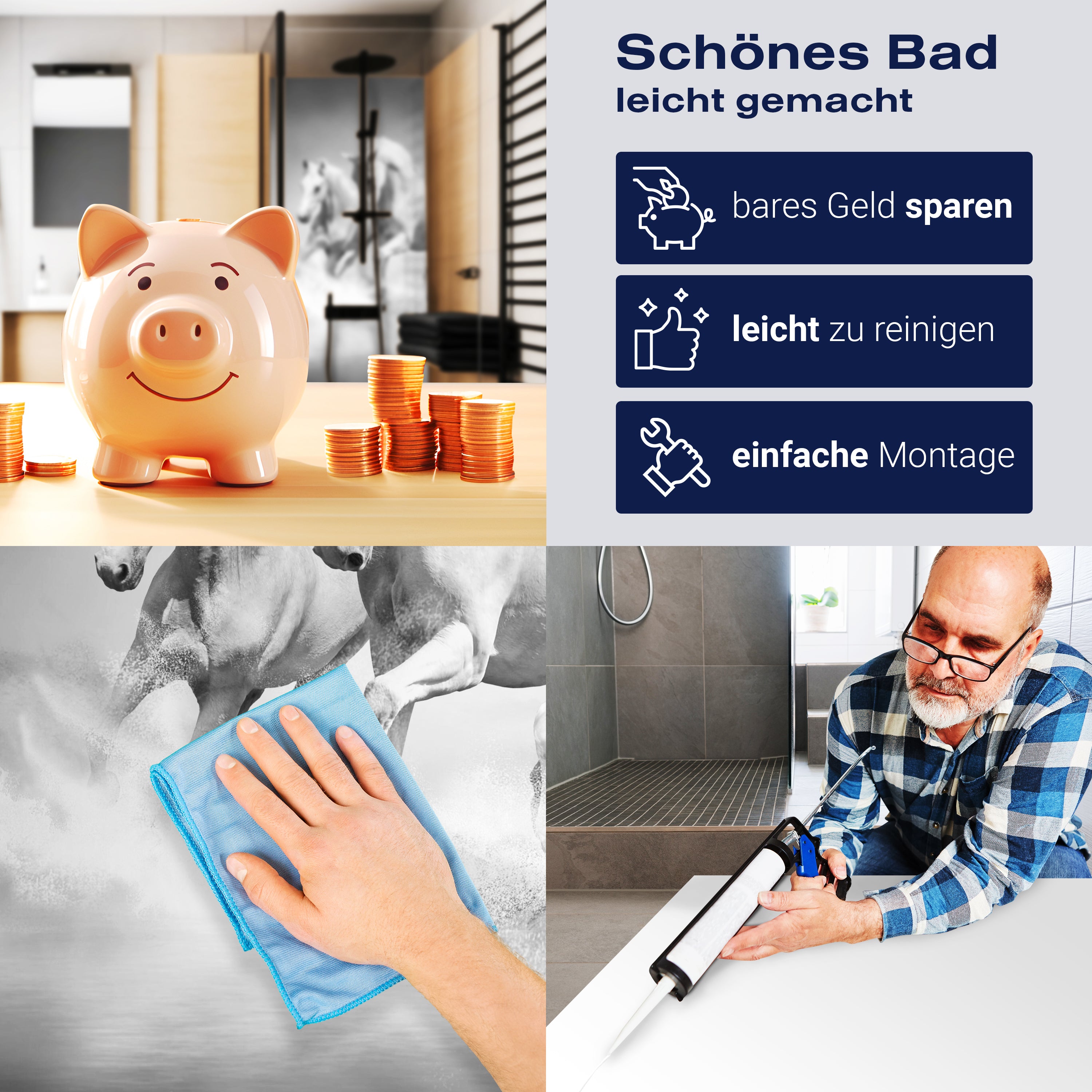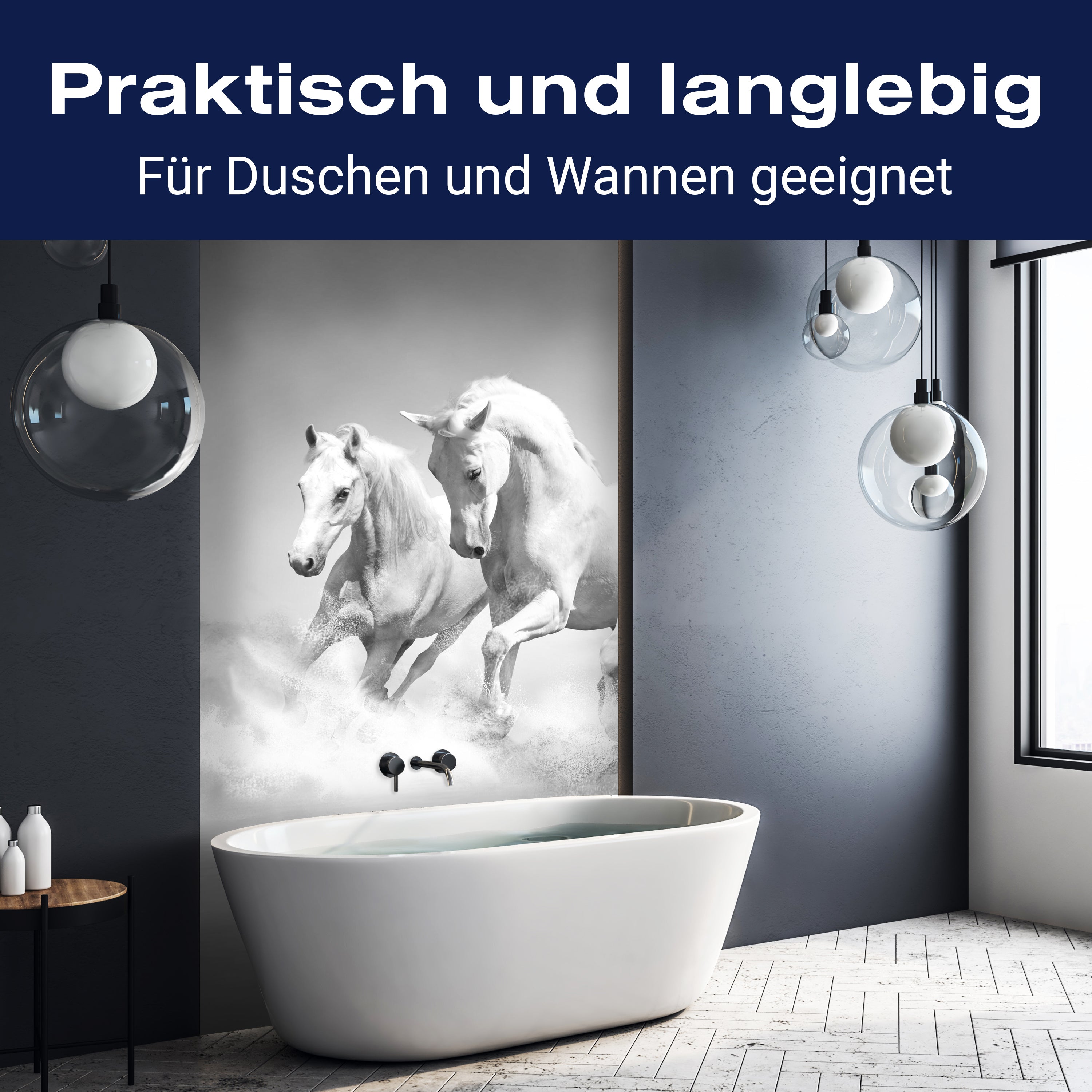 Bist du es leid, auf die langweiligen, schwer zu reinigende Fliesen in deiner Dusche zu schauen? Stell dir vor, wie dein Bad mit einer stilvollen, modernen Rückwand zum Leben erwacht! Unsere Duschwand 'weiße Traumpferde' ist nicht nur ein optisches Highlight, sondern auch praktisch und pflegeleicht.