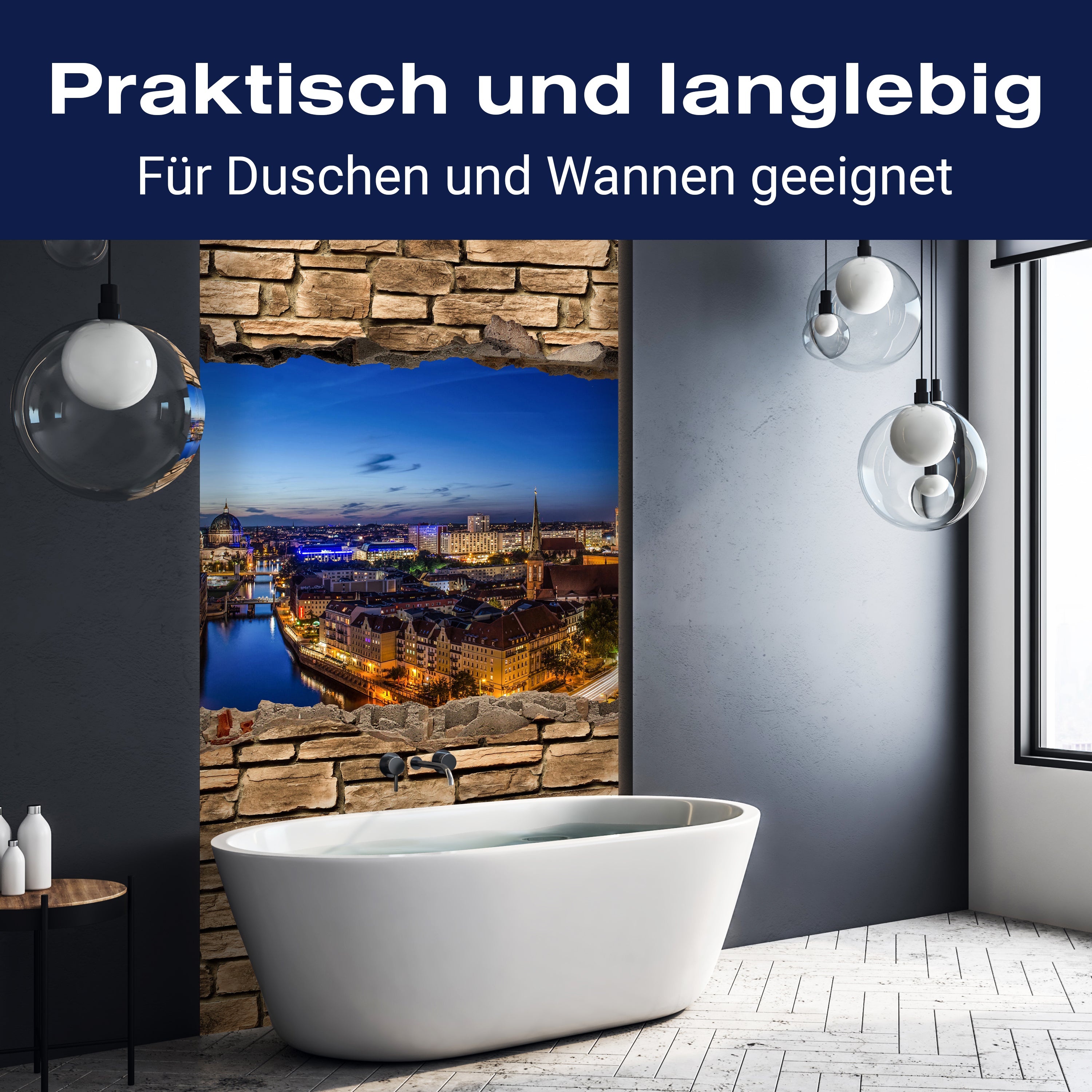 Vergiss die Tage, an denen Spritzer und Flecken deine Dusche ruiniert haben. Mit der Duschrückwand '3D Berlin bei Nacht - Steinmauer' gehören solche Sorgen der Vergangenheit an. Das hochwertige Material sorgt dafür, dass deine Dusche gegen Wasser und andere alltägliche Missgeschicke resistent ist. Ein einfacher Wisch, und sie sieht aus wie neu – ohne den Einsatz von aggressiven Reinigungsmitteln.