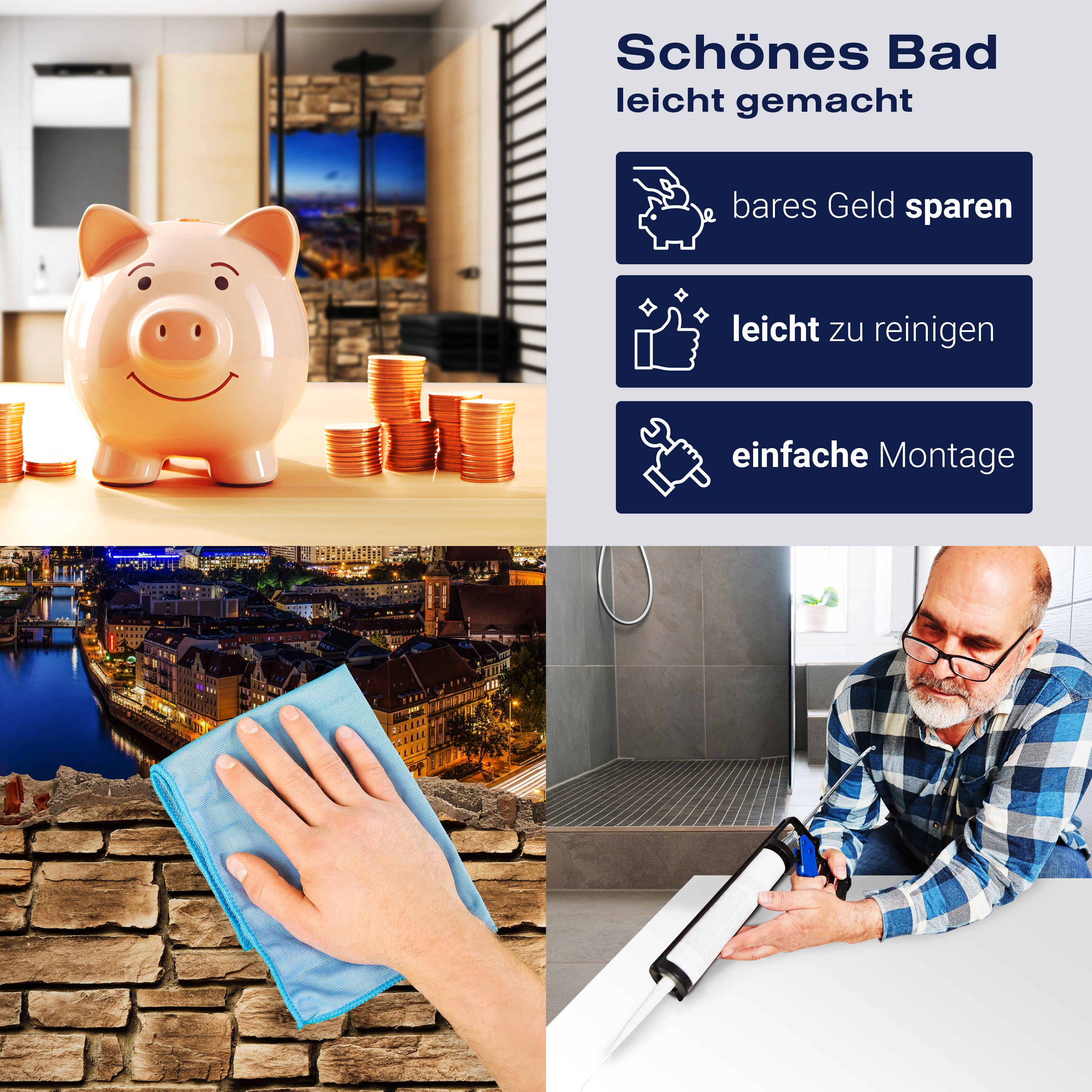 Die Reinigung Deiner Duschwand war noch nie so einfach. In einer Welt, in der Zeit ein kostbares Gut ist, verstehen wir, wie wichtig es ist, Reinigungsprozesse so effizient und mühelos wie möglich zu gestalten. Unsere Duschwände sind speziell dafür entworfen, Dein Leben leichter zu machen. Dank der glatten Oberfläche und der widerstandsfähigen Beschichtung lassen sich Spritzer und Flecken ohne großen Aufwand entfernen – ein schneller Wisch mit einem handelsüblichen Lappen, Spül- oder Wischtuch, und Deine Rückwand sieht aus wie neu.