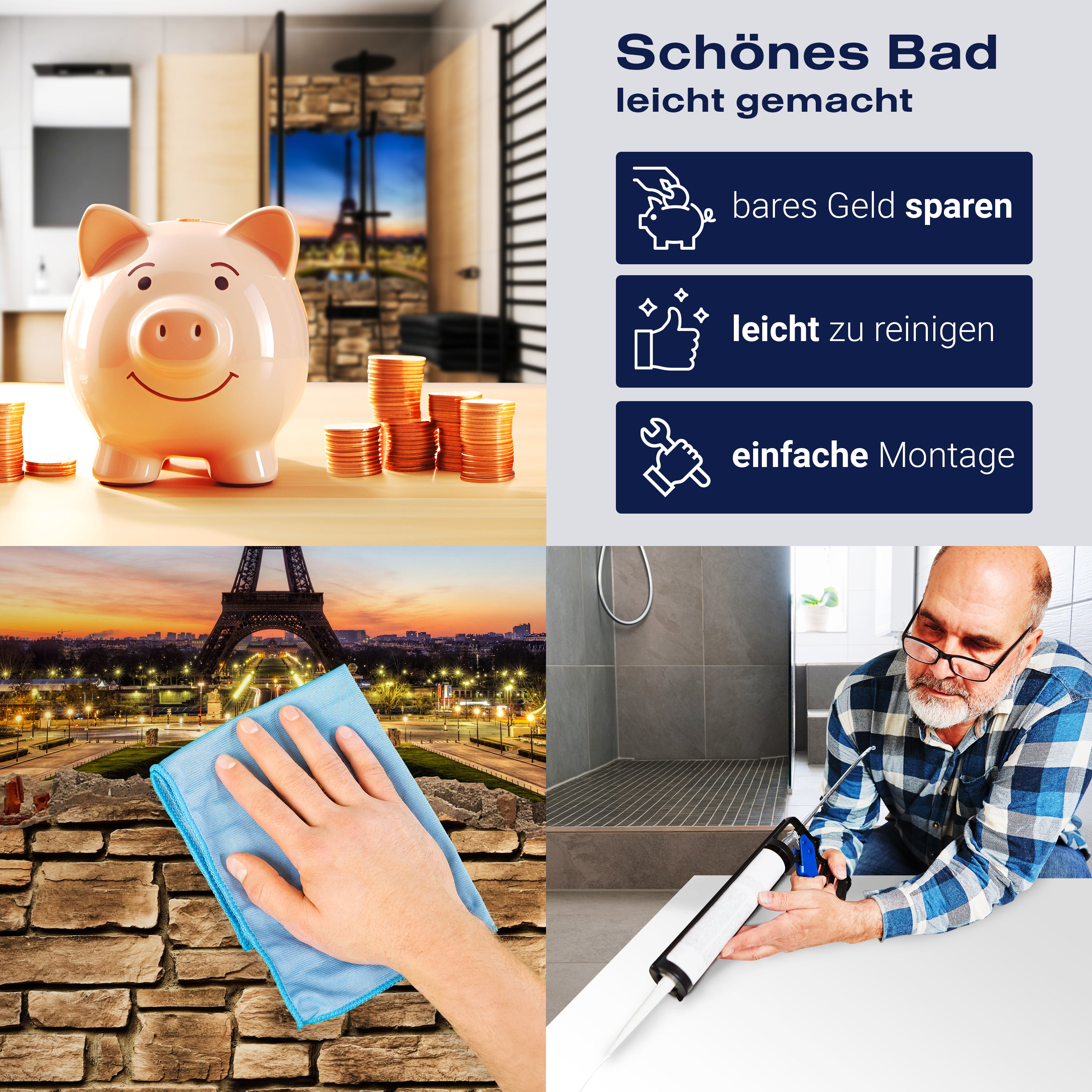 Vergiss die Tage, an denen Spritzer und Flecken deine Dusche ruiniert haben. Mit der Duschrückwand '3D Eiffelturm bei Nacht Frankreich - Steinmauer' gehören solche Sorgen der Vergangenheit an. Das hochwertige Material sorgt dafür, dass deine Dusche gegen Wasser und andere alltägliche Missgeschicke resistent ist. Ein einfacher Wisch, und sie sieht aus wie neu – ohne den Einsatz von aggressiven Reinigungsmitteln.