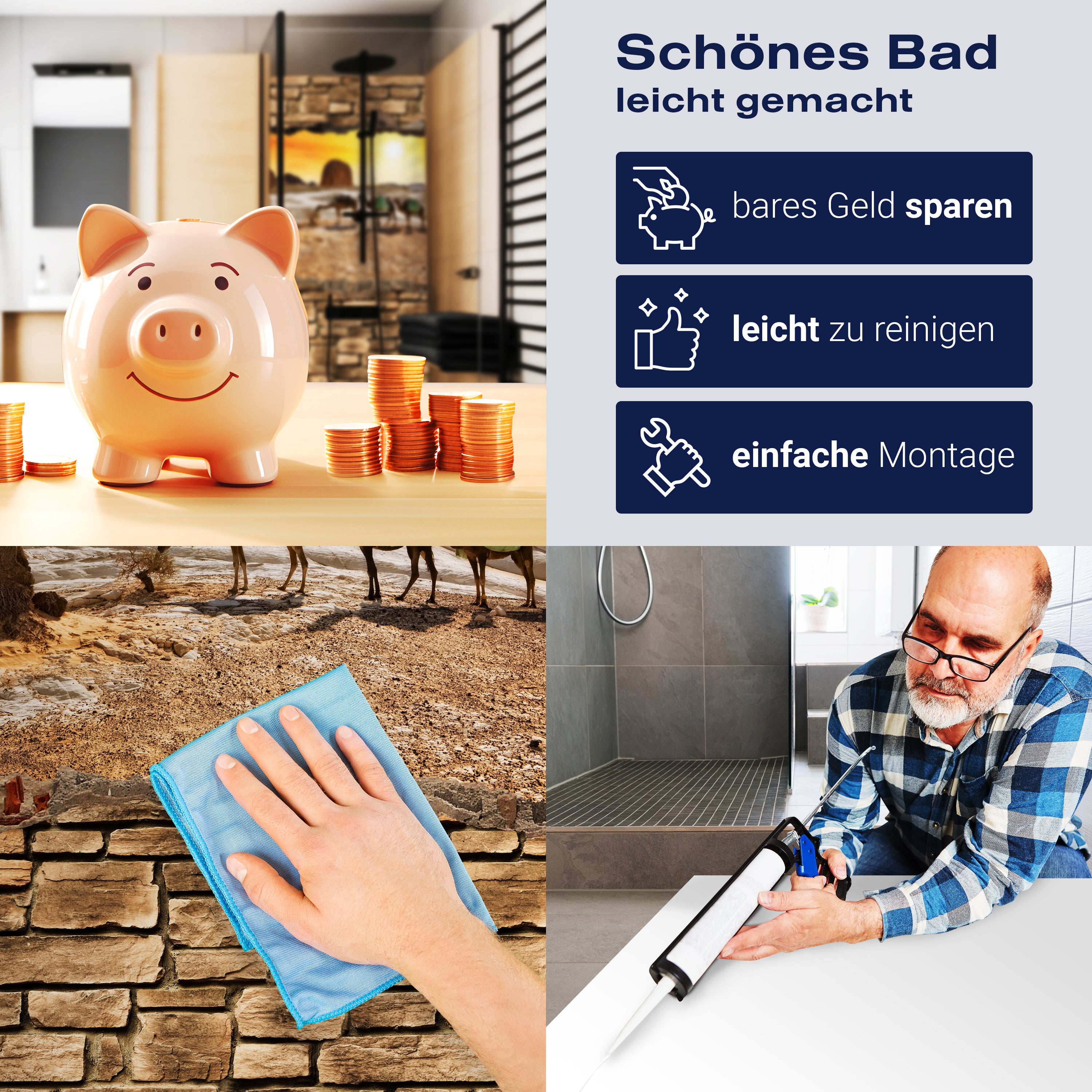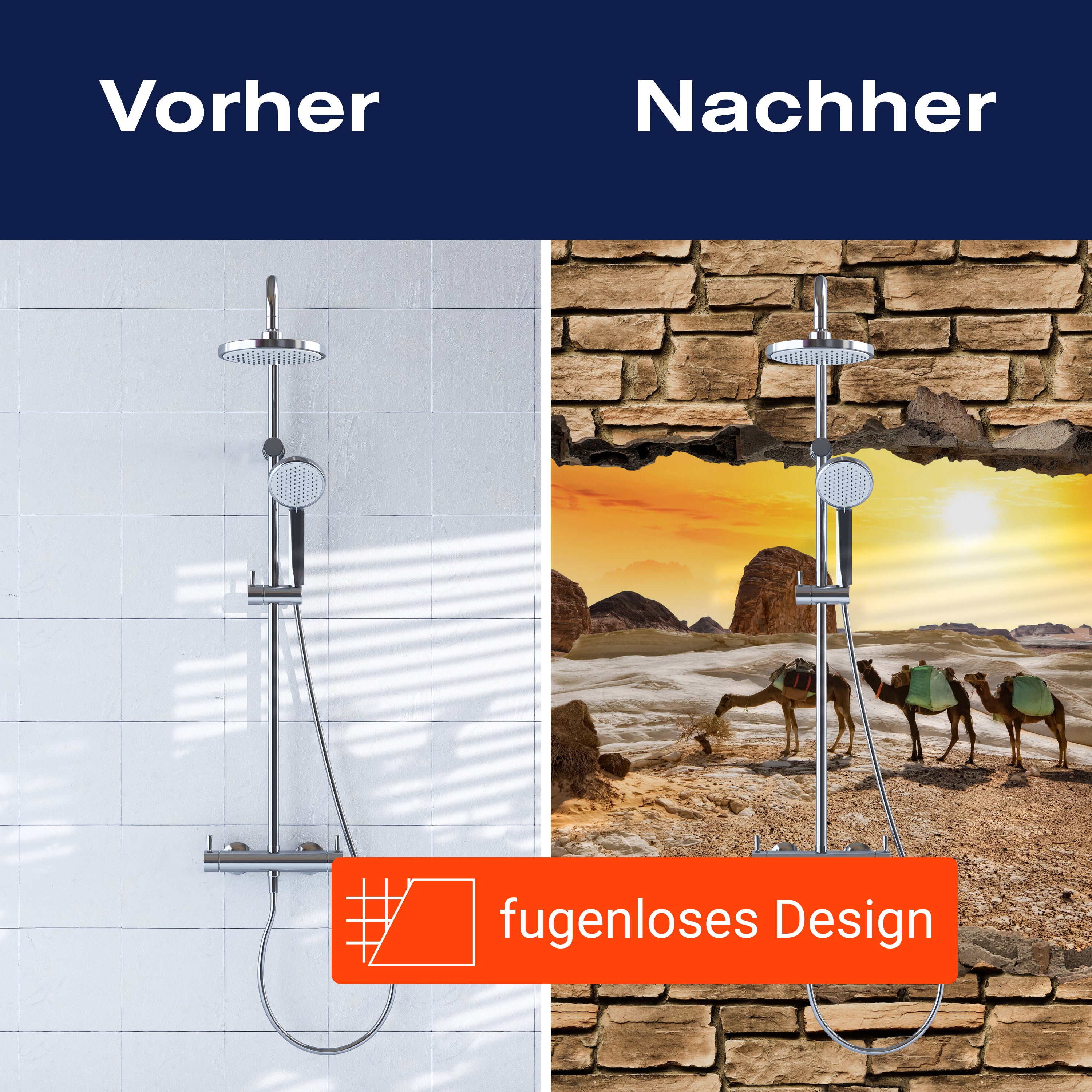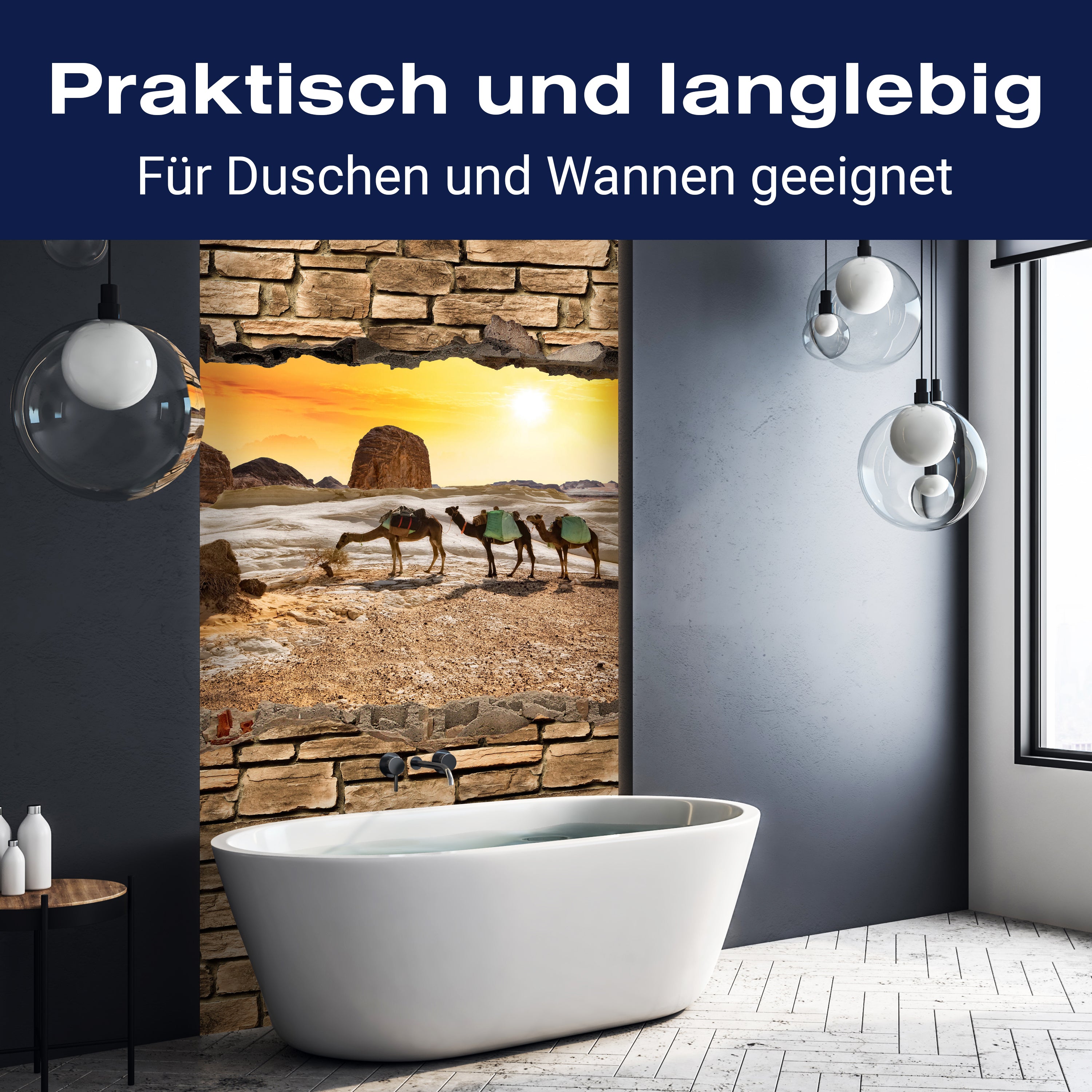 Bist du es leid, auf die langweiligen, schwer zu reinigende Fliesen in deiner Dusche zu schauen? Stell dir vor, wie dein Bad mit einer stilvollen, modernen Rückwand zum Leben erwacht! Unsere Duschwand '3D Kamele in der Wüste - Steinmauer' ist nicht nur ein optisches Highlight, sondern auch praktisch und pflegeleicht.