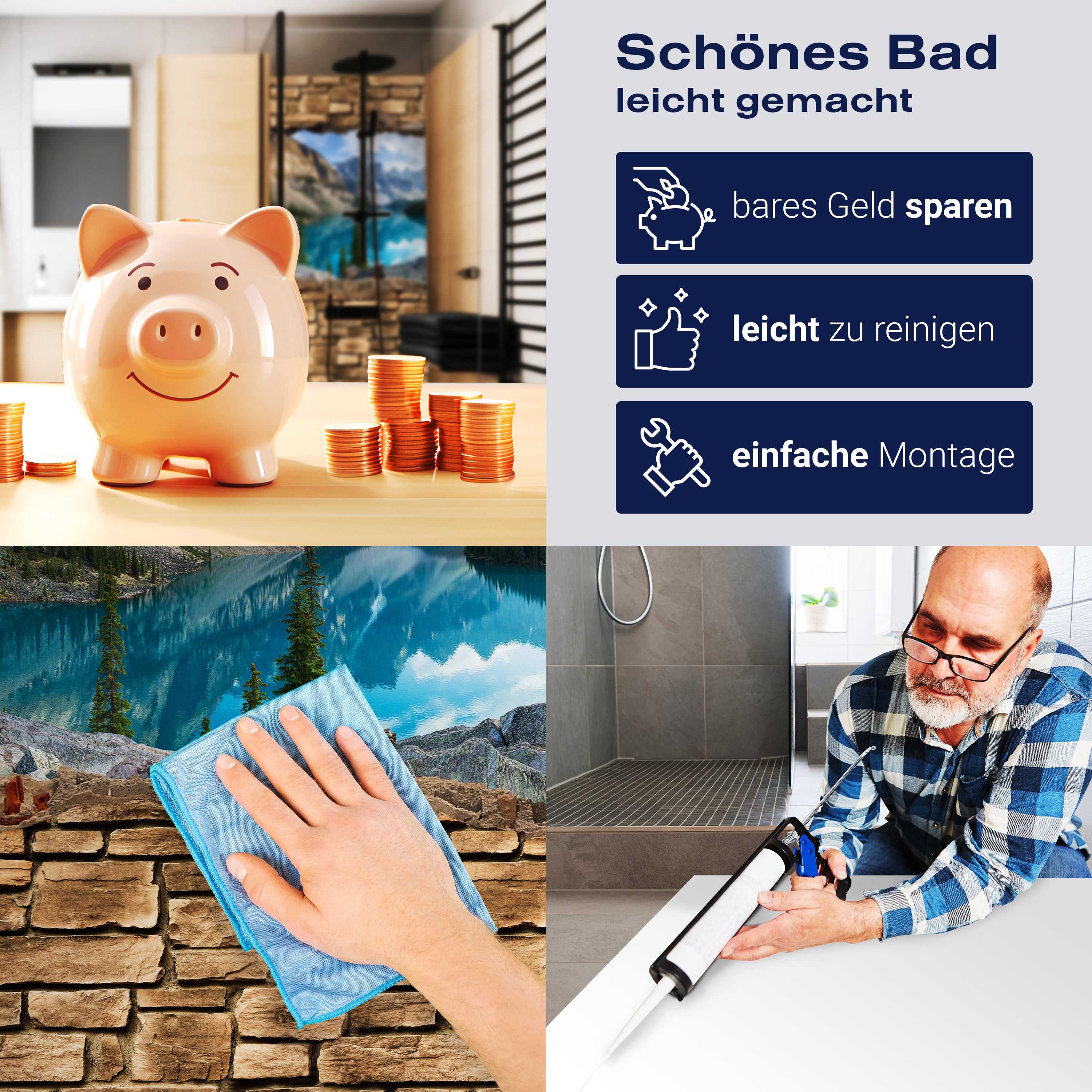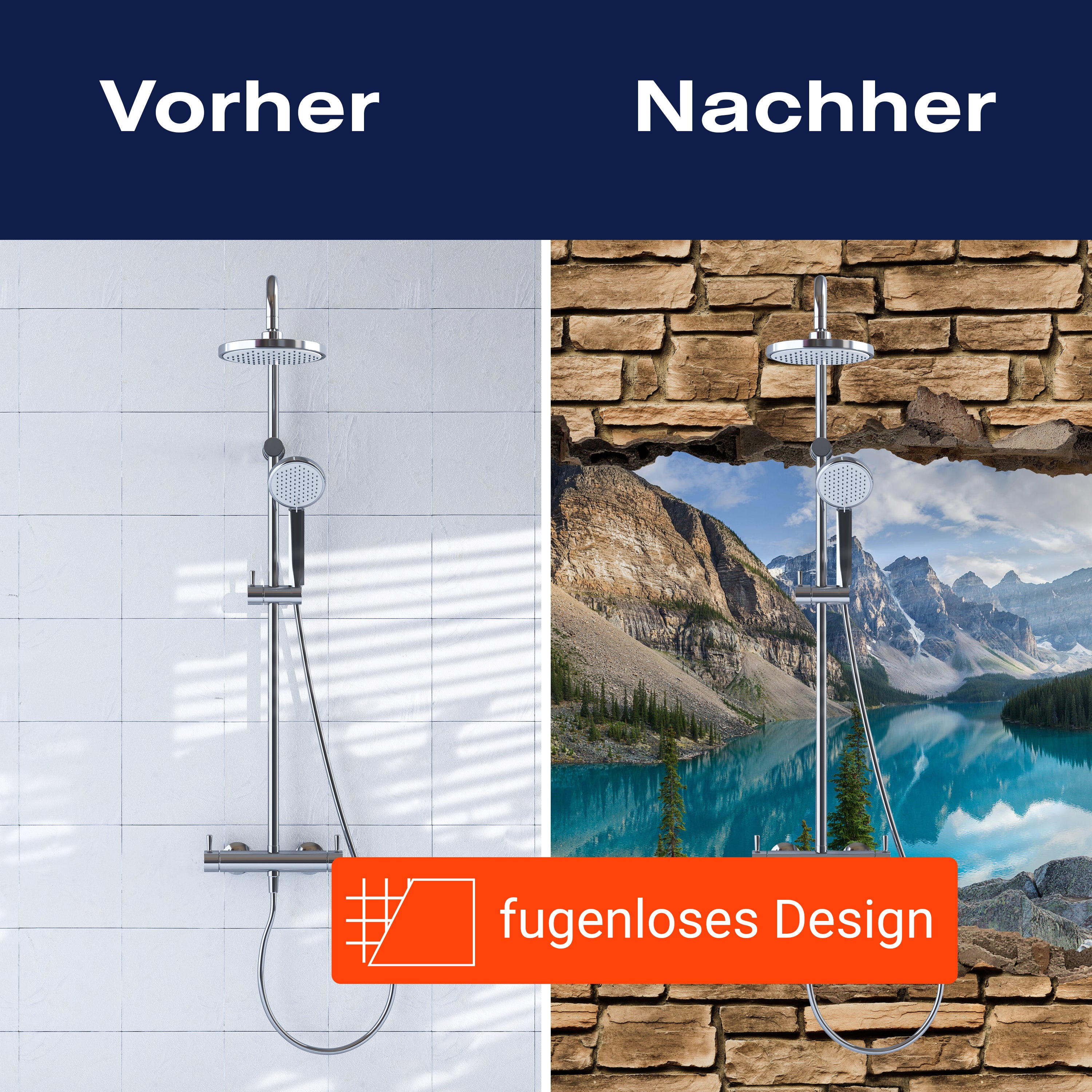Bist du es leid, auf die langweiligen, schwer zu reinigende Fliesen in deiner Dusche zu schauen? Stell dir vor, wie dein Bad mit einer stilvollen, modernen Rückwand zum Leben erwacht! Unsere Duschwand '3D Moraine lake rocky mountain panorama - Steinmauer' ist nicht nur ein optisches Highlight, sondern auch praktisch und pflegeleicht.
