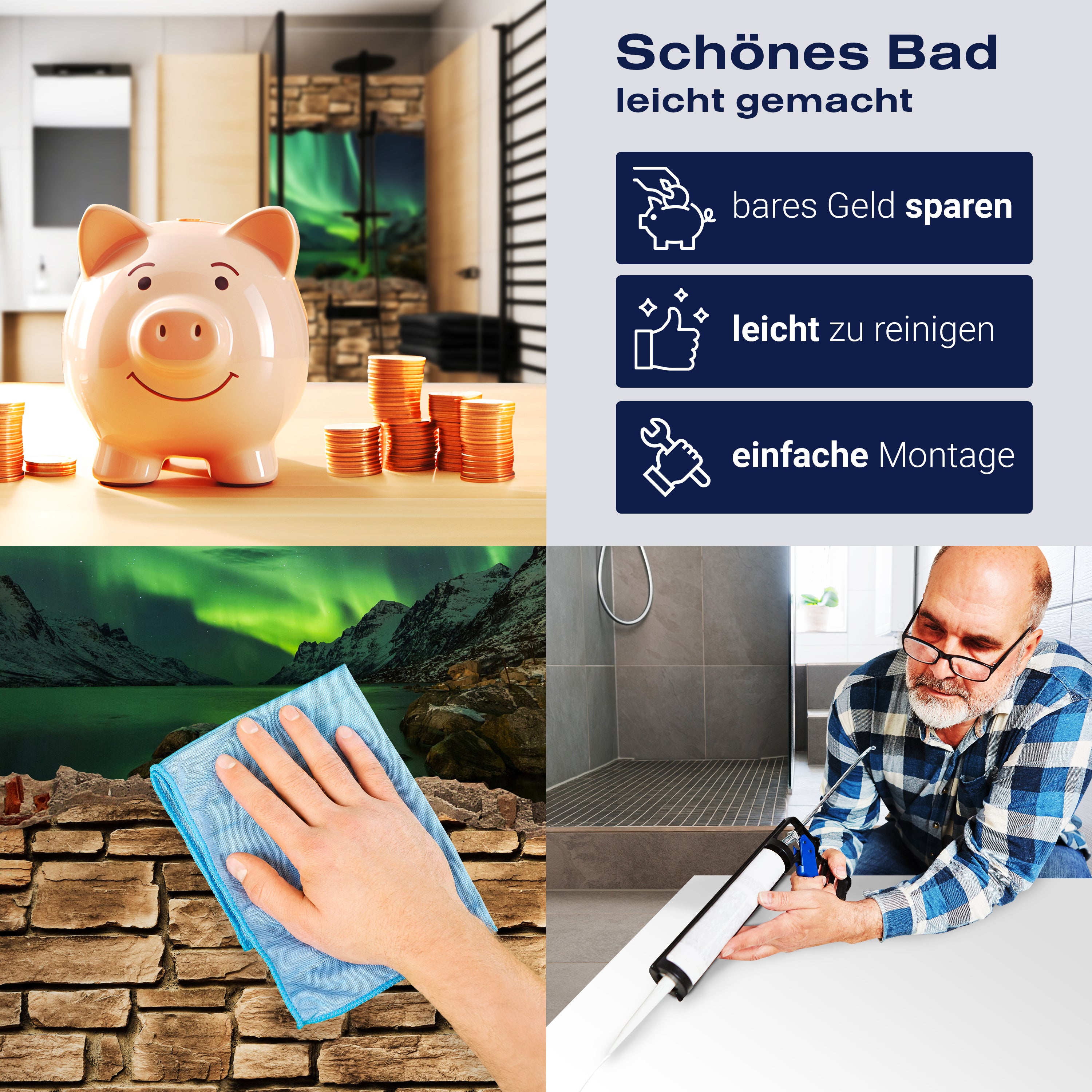 Vergiss die Tage, an denen Spritzer und Flecken deine Dusche ruiniert haben. Mit der Duschrückwand '3D Optik - Aurora Borealis Tromsö - Steinmauer' gehören solche Sorgen der Vergangenheit an. Das hochwertige Material sorgt dafür, dass deine Dusche gegen Wasser und andere alltägliche Missgeschicke resistent ist. Ein einfacher Wisch, und sie sieht aus wie neu – ohne den Einsatz von aggressiven Reinigungsmitteln.