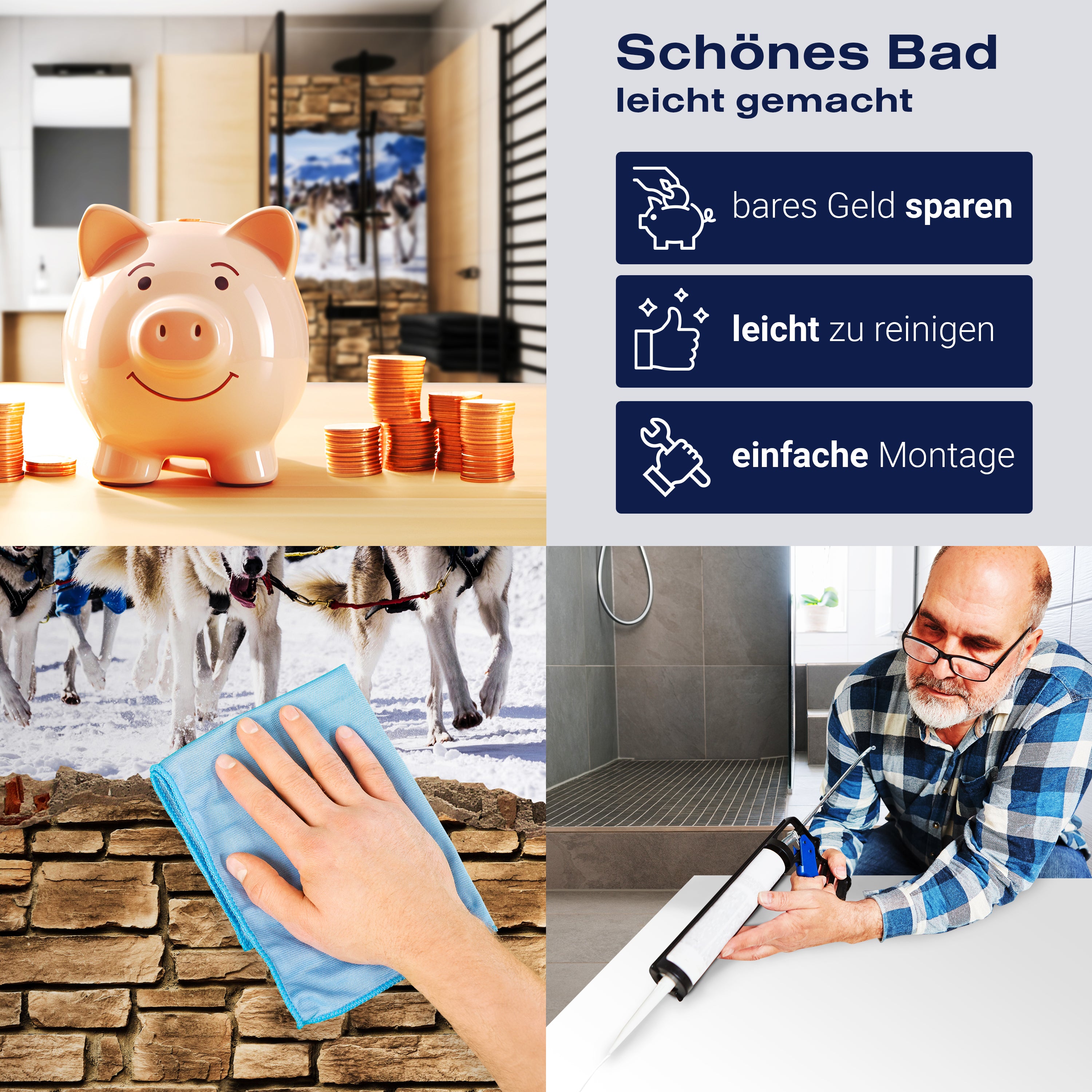 Bist du es leid, auf die langweiligen, schwer zu reinigende Fliesen in deiner Dusche zu schauen? Stell dir vor, wie dein Bad mit einer stilvollen, modernen Rückwand zum Leben erwacht! Unsere Duschwand '3D Schlittenhunde Racing - Steinmauer' ist nicht nur ein optisches Highlight, sondern auch praktisch und pflegeleicht.