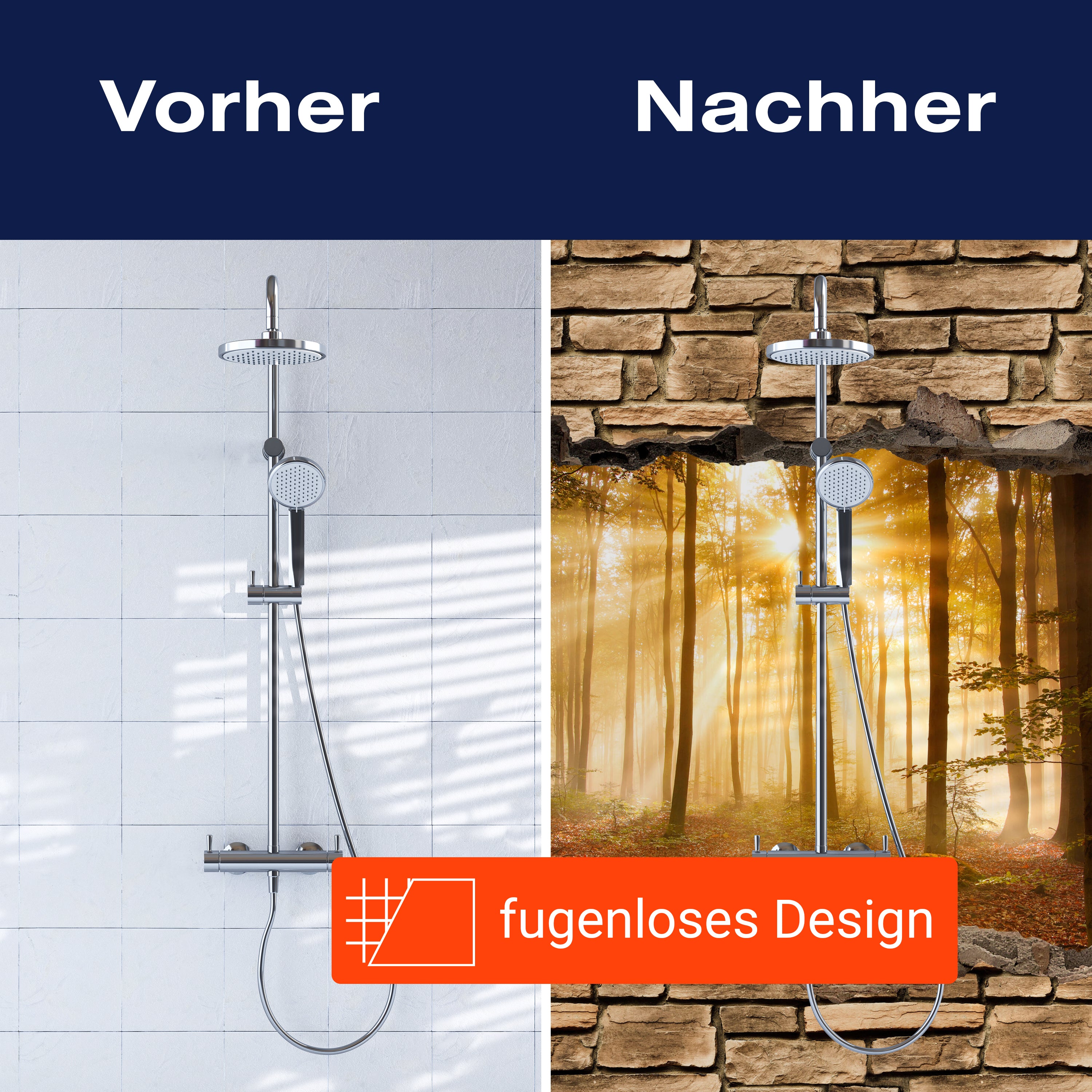 Bist du es leid, auf die langweiligen, schwer zu reinigende Fliesen in deiner Dusche zu schauen? Stell dir vor, wie dein Bad mit einer stilvollen, modernen Rückwand zum Leben erwacht! Unsere Duschwand '3D Wald am Morgen - Steinmauer' ist nicht nur ein optisches Highlight, sondern auch praktisch und pflegeleicht.