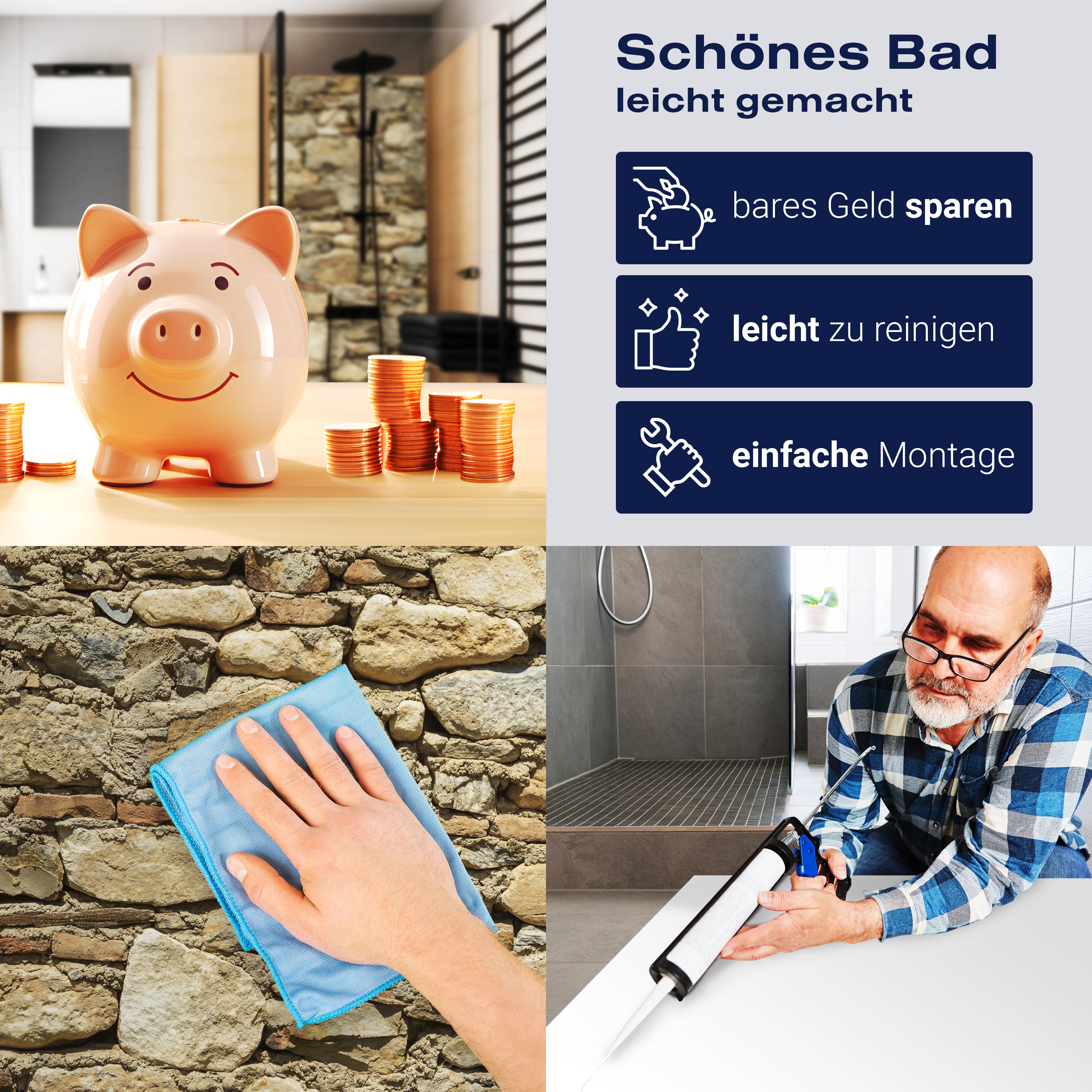 Die Reinigung Deiner Duschwand war noch nie so einfach. In einer Welt, in der Zeit ein kostbares Gut ist, verstehen wir, wie wichtig es ist, Reinigungsprozesse so effizient und mühelos wie möglich zu gestalten. Unsere Duschwände sind speziell dafür entworfen, Dein Leben leichter zu machen. Dank der glatten Oberfläche und der widerstandsfähigen Beschichtung lassen sich Spritzer und Flecken ohne großen Aufwand entfernen – ein schneller Wisch mit einem handelsüblichen Lappen, Spül- oder Wischtuch, und Deine Rückwand sieht aus wie neu.