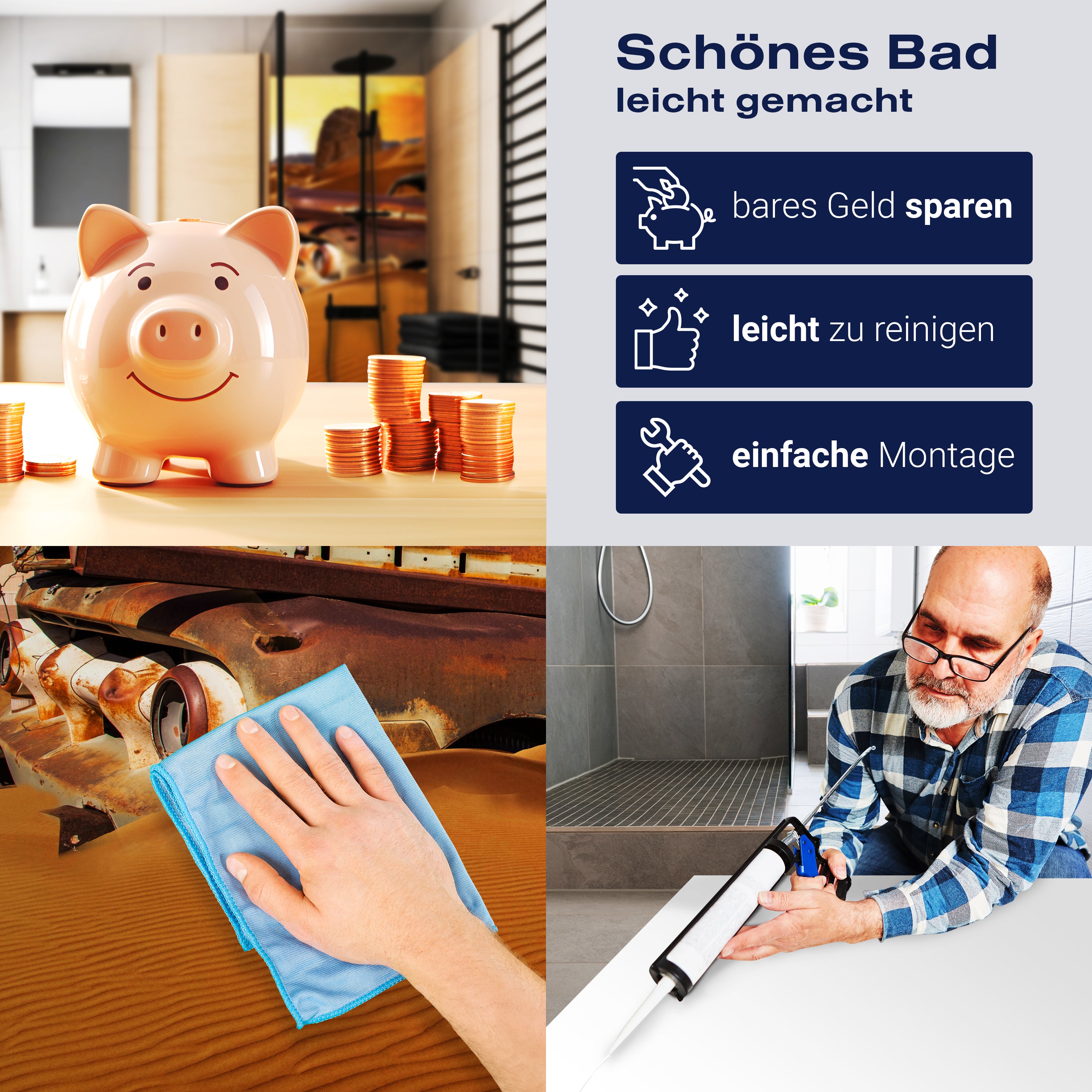 Die Reinigung Deiner Duschwand war noch nie so einfach. In einer Welt, in der Zeit ein kostbares Gut ist, verstehen wir, wie wichtig es ist, Reinigungsprozesse so effizient und mühelos wie möglich zu gestalten. Unsere Duschwände sind speziell dafür entworfen, Dein Leben leichter zu machen. Dank der glatten Oberfläche und der widerstandsfähigen Beschichtung lassen sich Spritzer und Flecken ohne großen Aufwand entfernen – ein schneller Wisch mit einem handelsüblichen Lappen, Spül- oder Wischtuch, und Deine Rückwand sieht aus wie neu.
