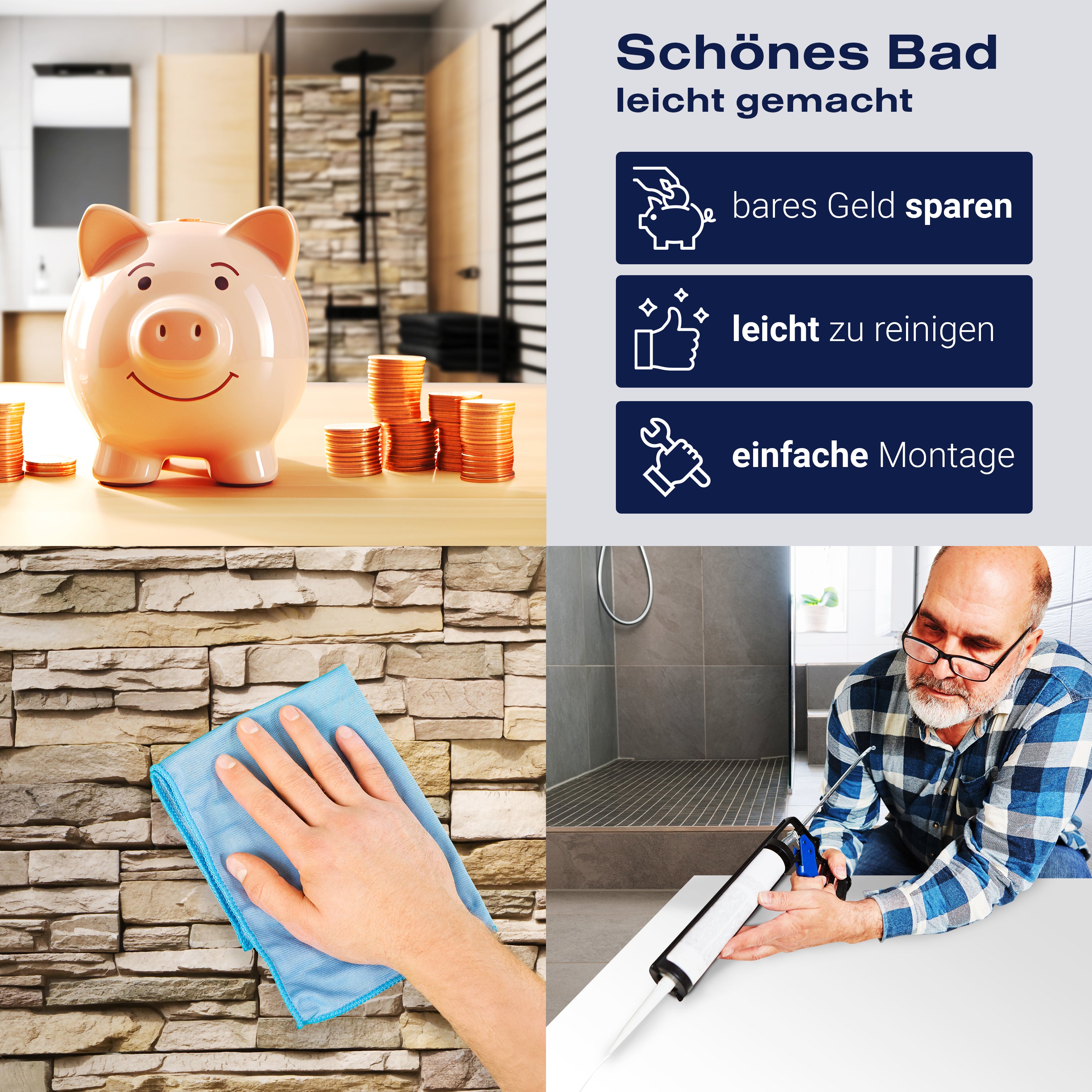 Die Reinigung Deiner Duschwand war noch nie so einfach. In einer Welt, in der Zeit ein kostbares Gut ist, verstehen wir, wie wichtig es ist, Reinigungsprozesse so effizient und mühelos wie möglich zu gestalten. Unsere Duschwände sind speziell dafür entworfen, Dein Leben leichter zu machen. Dank der glatten Oberfläche und der widerstandsfähigen Beschichtung lassen sich Spritzer und Flecken ohne großen Aufwand entfernen – ein schneller Wisch mit einem handelsüblichen Lappen, Spül- oder Wischtuch, und Deine Rückwand sieht aus wie neu.