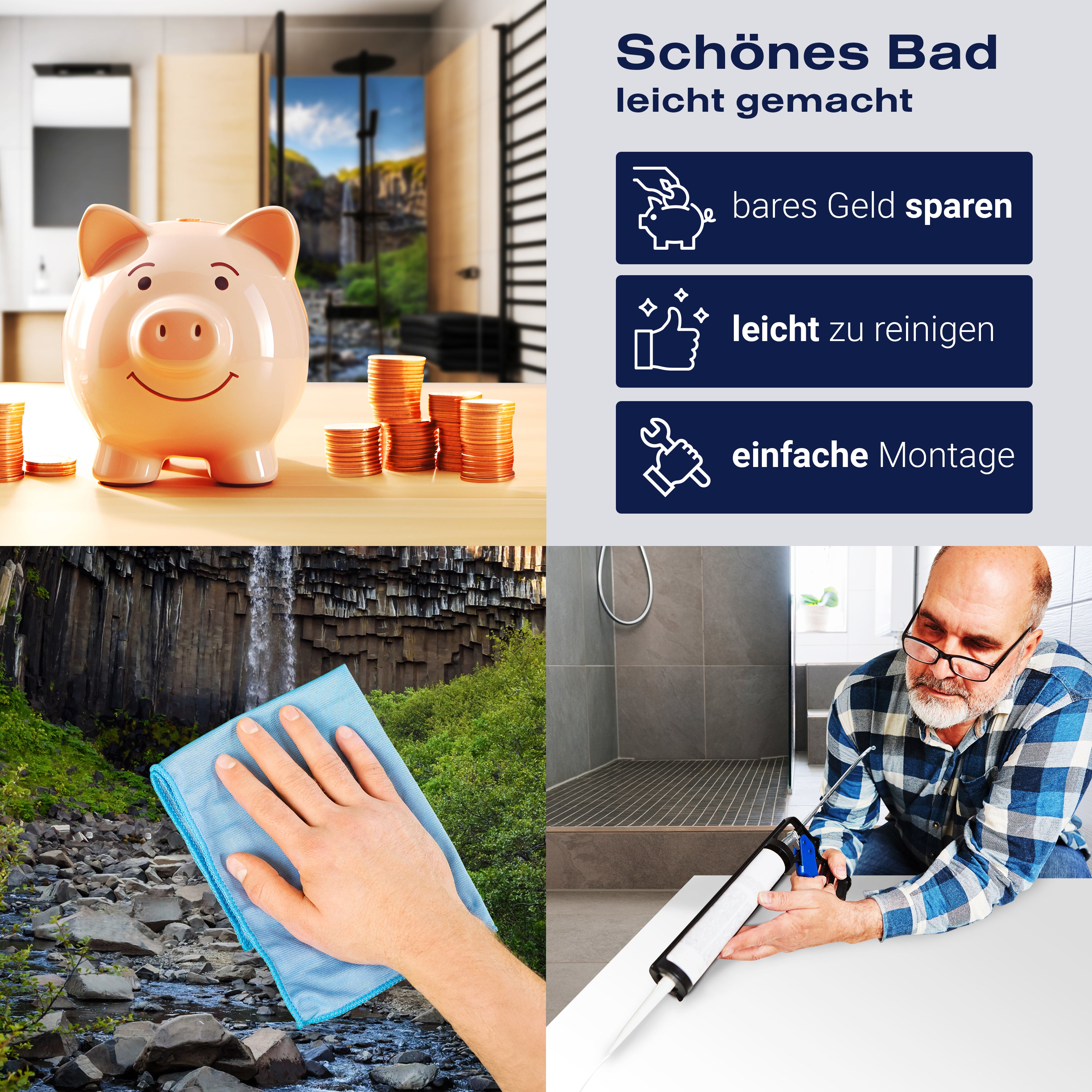 Vergiss die Tage, an denen Spritzer und Flecken deine Dusche ruiniert haben. Mit der Duschrückwand 'Basaltsäulenwasserfall Island' gehören solche Sorgen der Vergangenheit an. Das hochwertige Material sorgt dafür, dass deine Dusche gegen Wasser und andere alltägliche Missgeschicke resistent ist. Ein einfacher Wisch, und sie sieht aus wie neu – ohne den Einsatz von aggressiven Reinigungsmitteln.