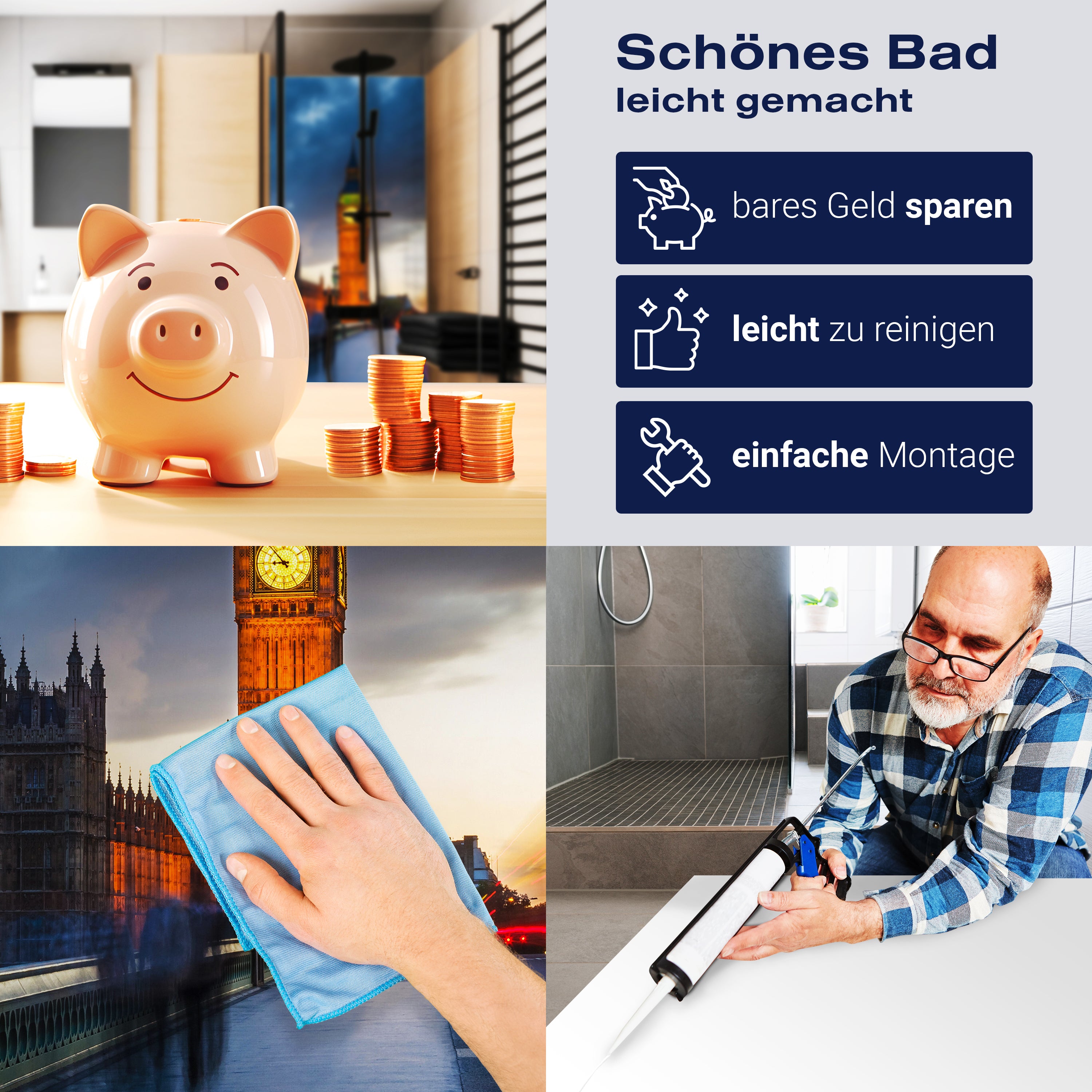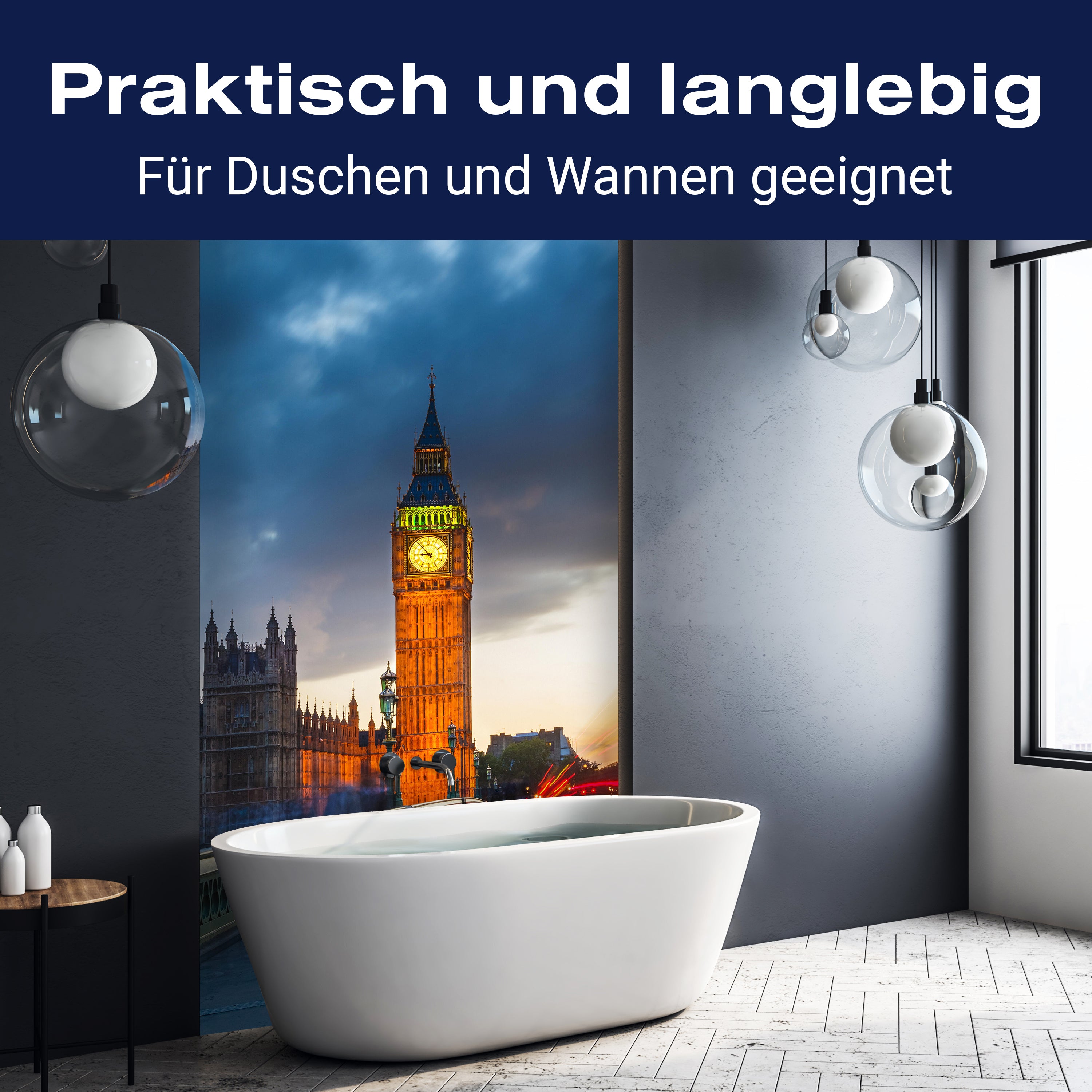 Bist du es leid, auf die langweiligen, schwer zu reinigende Fliesen in deiner Dusche zu schauen? Stell dir vor, wie dein Bad mit einer stilvollen, modernen Rückwand zum Leben erwacht! Unsere Duschwand 'Big Ben bei Nacht' ist nicht nur ein optisches Highlight, sondern auch praktisch und pflegeleicht.