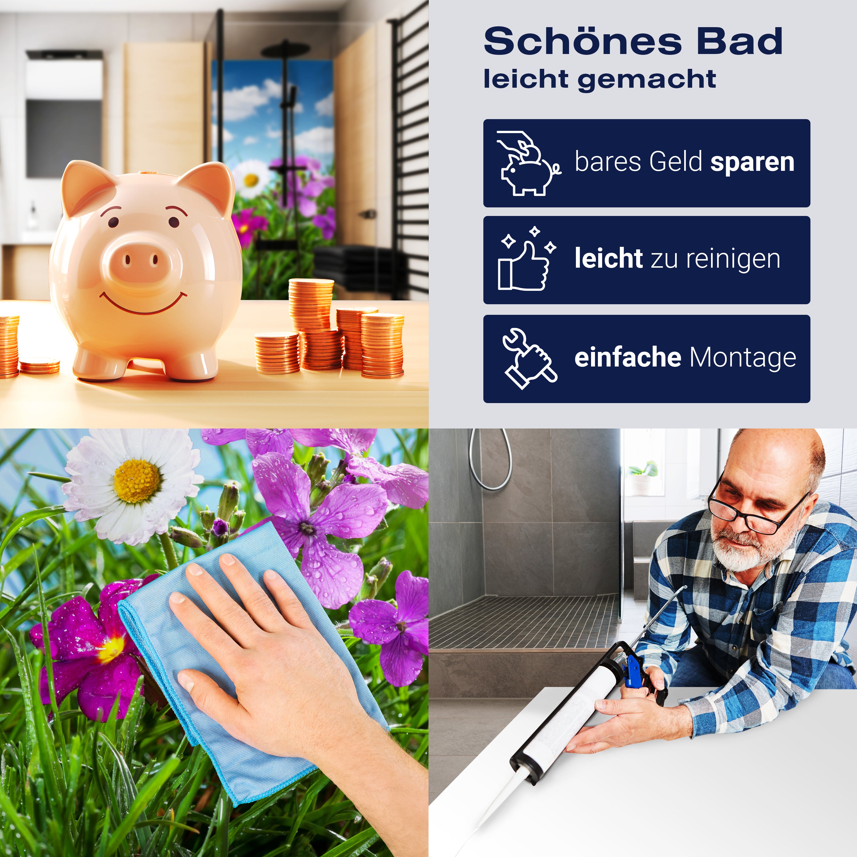 Die Reinigung Deiner Duschwand war noch nie so einfach. In einer Welt, in der Zeit ein kostbares Gut ist, verstehen wir, wie wichtig es ist, Reinigungsprozesse so effizient und mühelos wie möglich zu gestalten. Unsere Duschwände sind speziell dafür entworfen, Dein Leben leichter zu machen. Dank der glatten Oberfläche und der widerstandsfähigen Beschichtung lassen sich Spritzer und Flecken ohne großen Aufwand entfernen – ein schneller Wisch mit einem handelsüblichen Lappen, Spül- oder Wischtuch, und Deine Rückwand sieht aus wie neu.