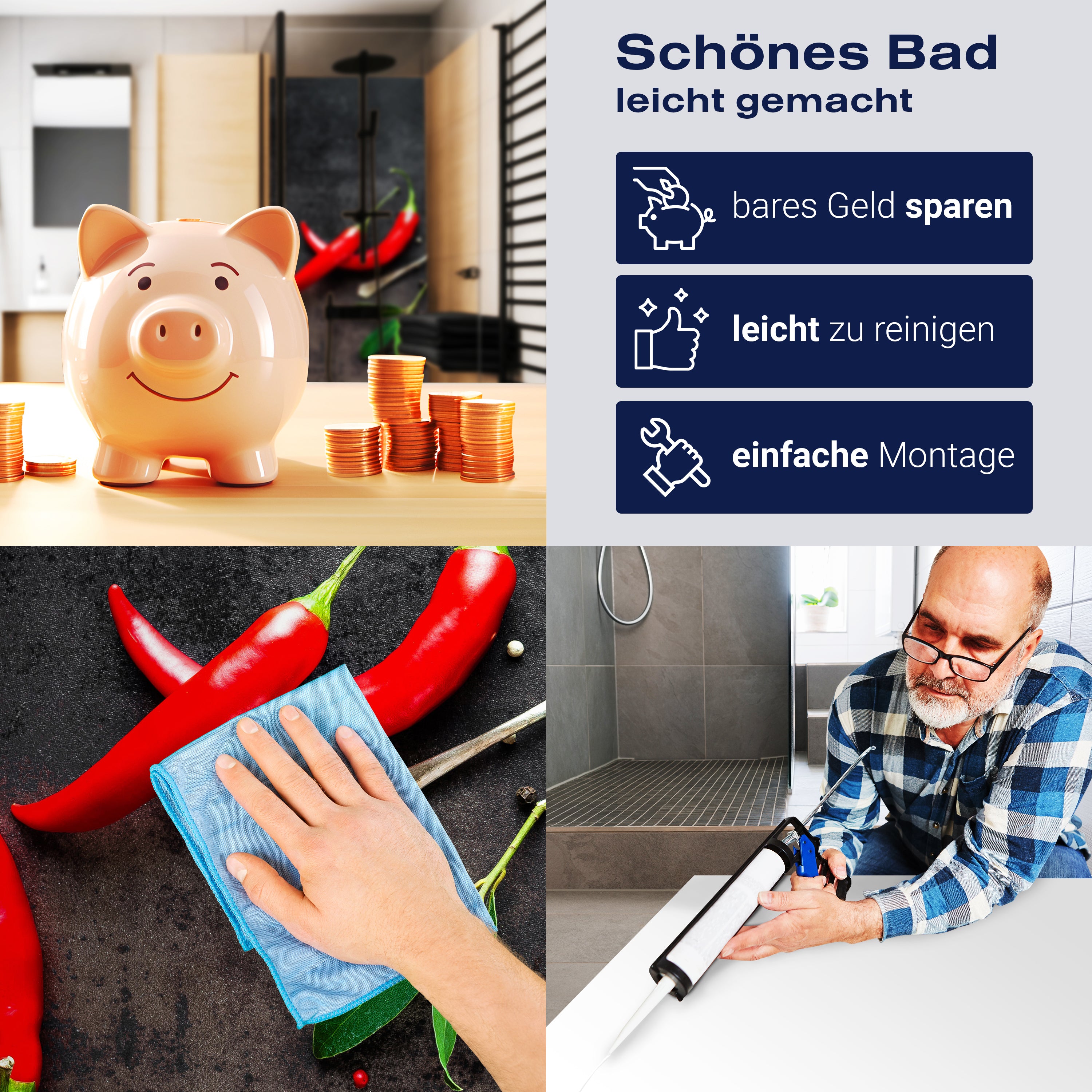 Die Reinigung Deiner Duschwand war noch nie so einfach. In einer Welt, in der Zeit ein kostbares Gut ist, verstehen wir, wie wichtig es ist, Reinigungsprozesse so effizient und mühelos wie möglich zu gestalten. Unsere Duschwände sind speziell dafür entworfen, Dein Leben leichter zu machen. Dank der glatten Oberfläche und der widerstandsfähigen Beschichtung lassen sich Spritzer und Flecken ohne großen Aufwand entfernen – ein schneller Wisch mit einem handelsüblichen Lappen, Spül- oder Wischtuch, und Deine Rückwand sieht aus wie neu.