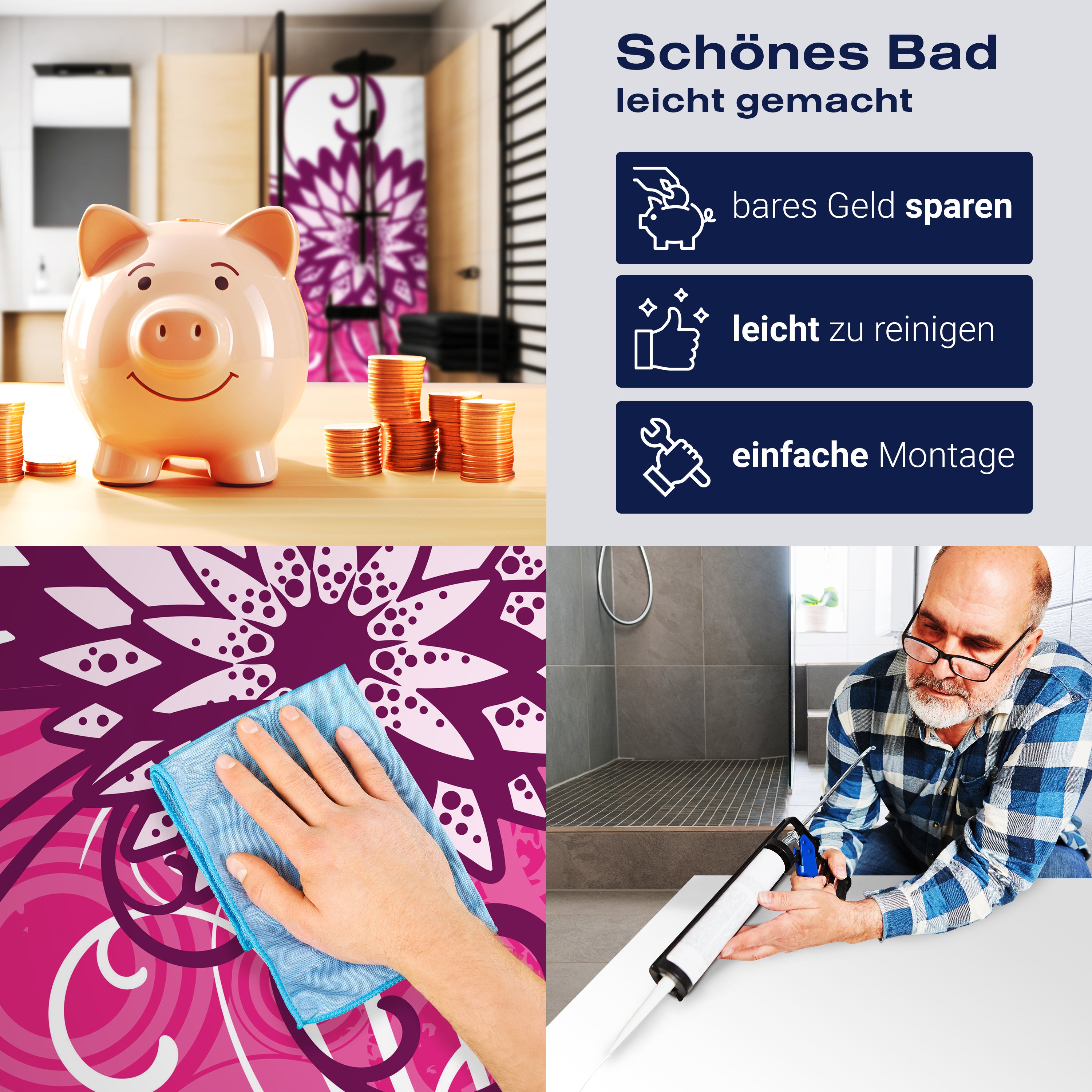 Die Reinigung Deiner Duschwand war noch nie so einfach. In einer Welt, in der Zeit ein kostbares Gut ist, verstehen wir, wie wichtig es ist, Reinigungsprozesse so effizient und mühelos wie möglich zu gestalten. Unsere Duschwände sind speziell dafür entworfen, Dein Leben leichter zu machen. Dank der glatten Oberfläche und der widerstandsfähigen Beschichtung lassen sich Spritzer und Flecken ohne großen Aufwand entfernen – ein schneller Wisch mit einem handelsüblichen Lappen, Spül- oder Wischtuch, und Deine Rückwand sieht aus wie neu.