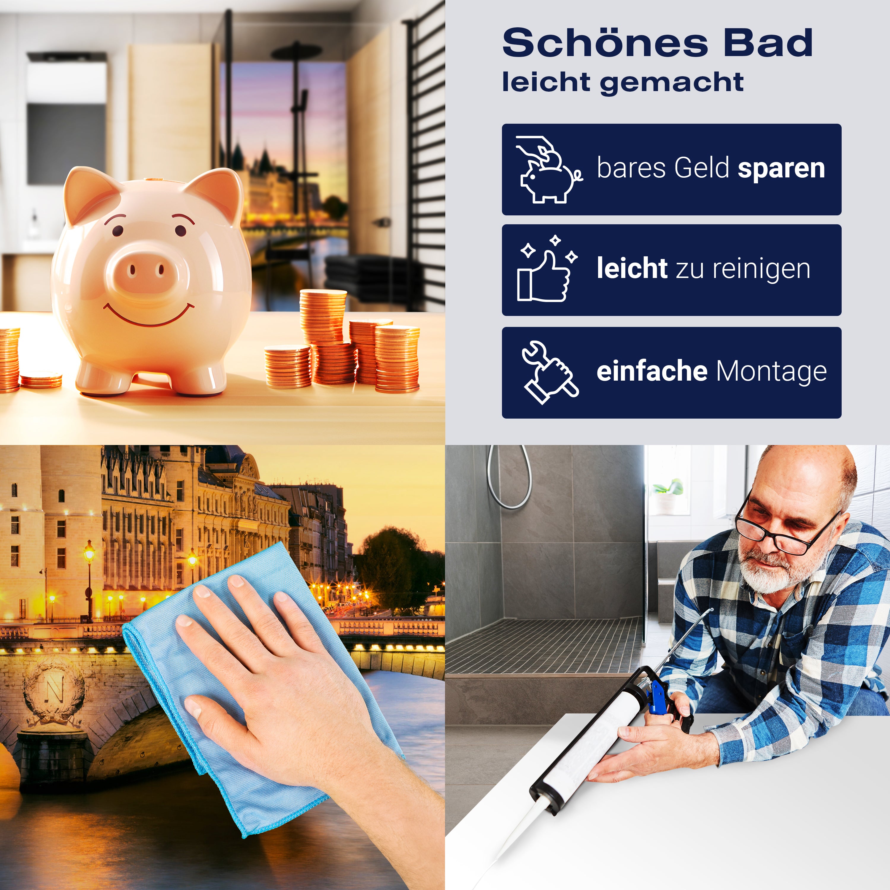 Bist du es leid, auf die langweiligen, schwer zu reinigende Fliesen in deiner Dusche zu schauen? Stell dir vor, wie dein Bad mit einer stilvollen, modernen Rückwand zum Leben erwacht! Unsere Duschwand 'Conciergerie Paris' ist nicht nur ein optisches Highlight, sondern auch praktisch und pflegeleicht.