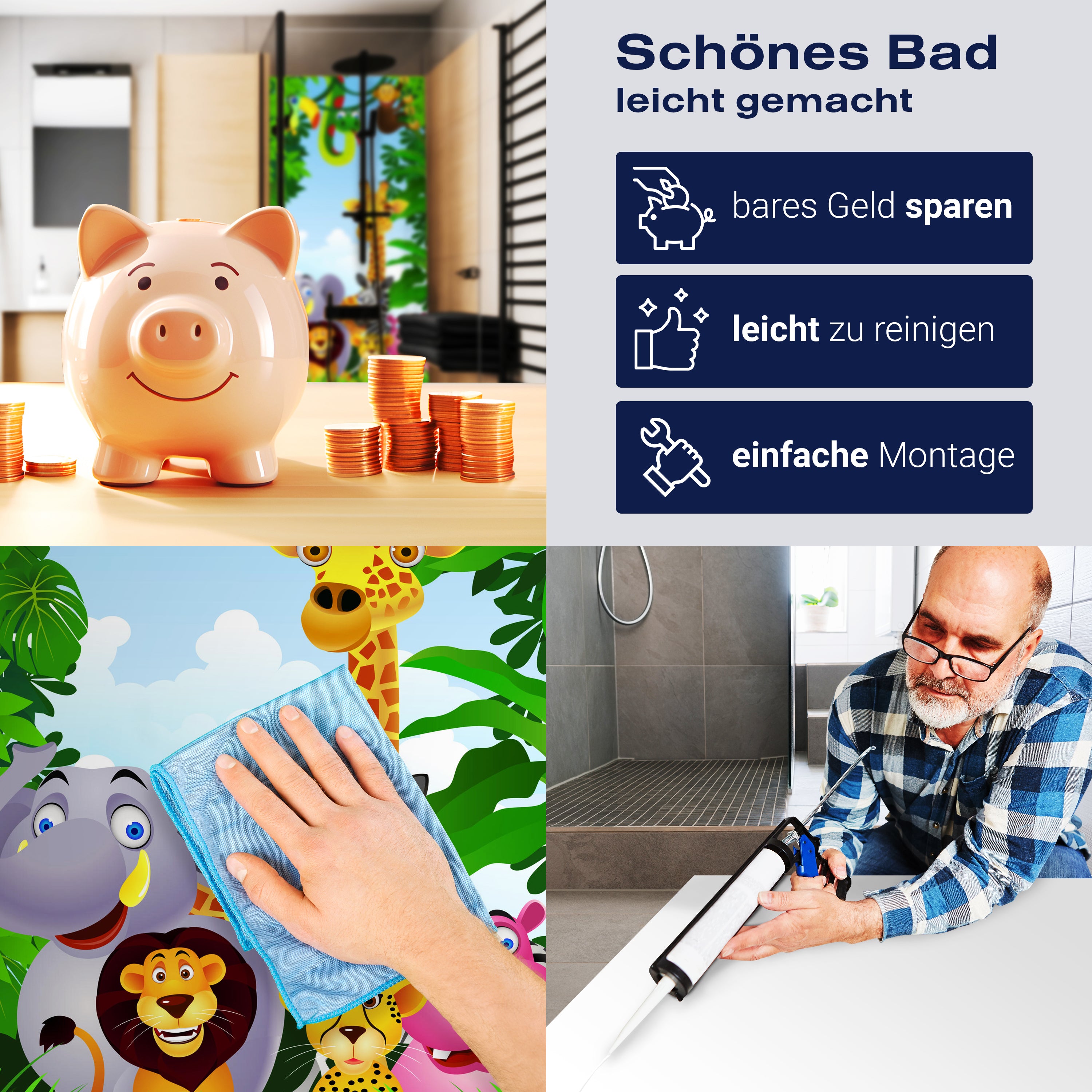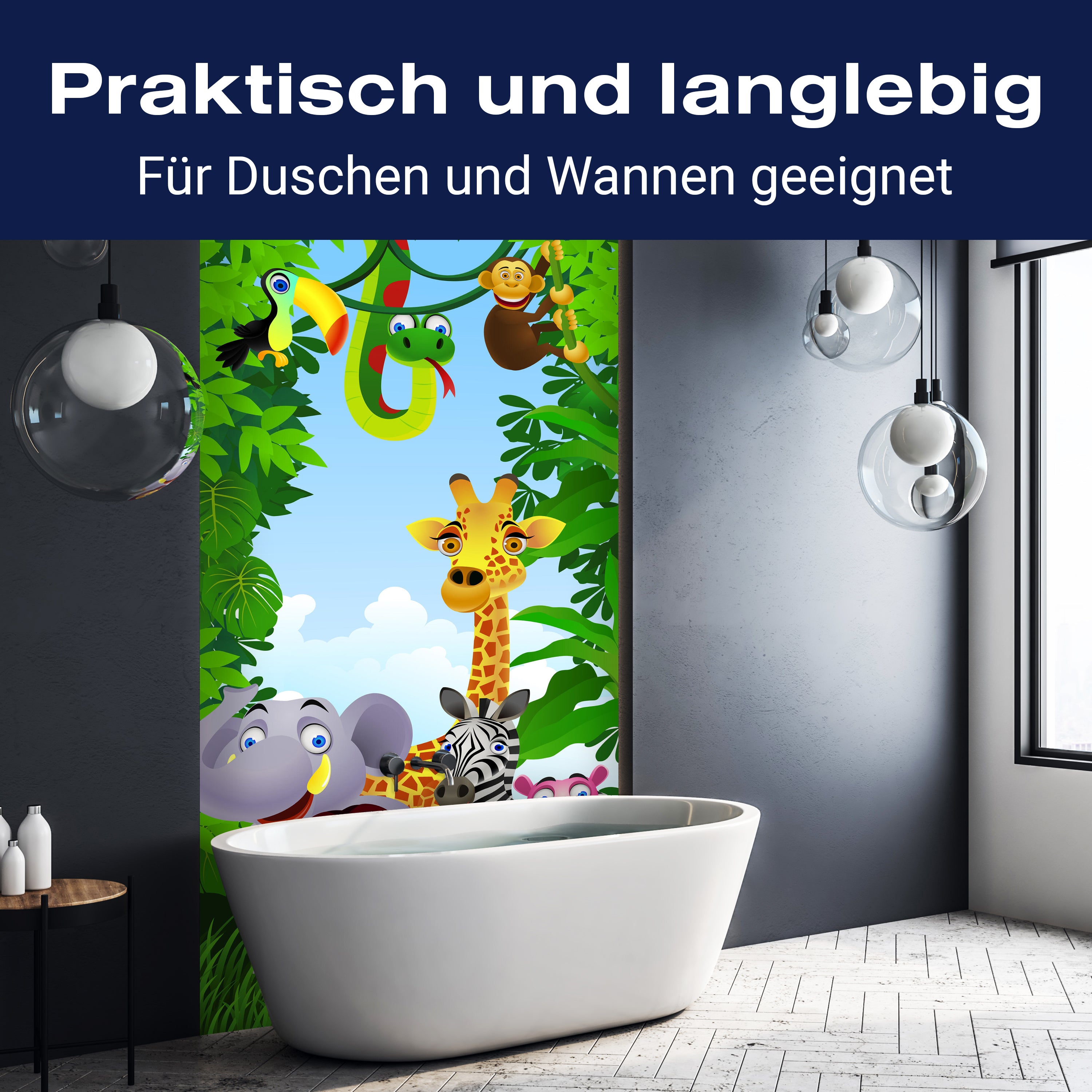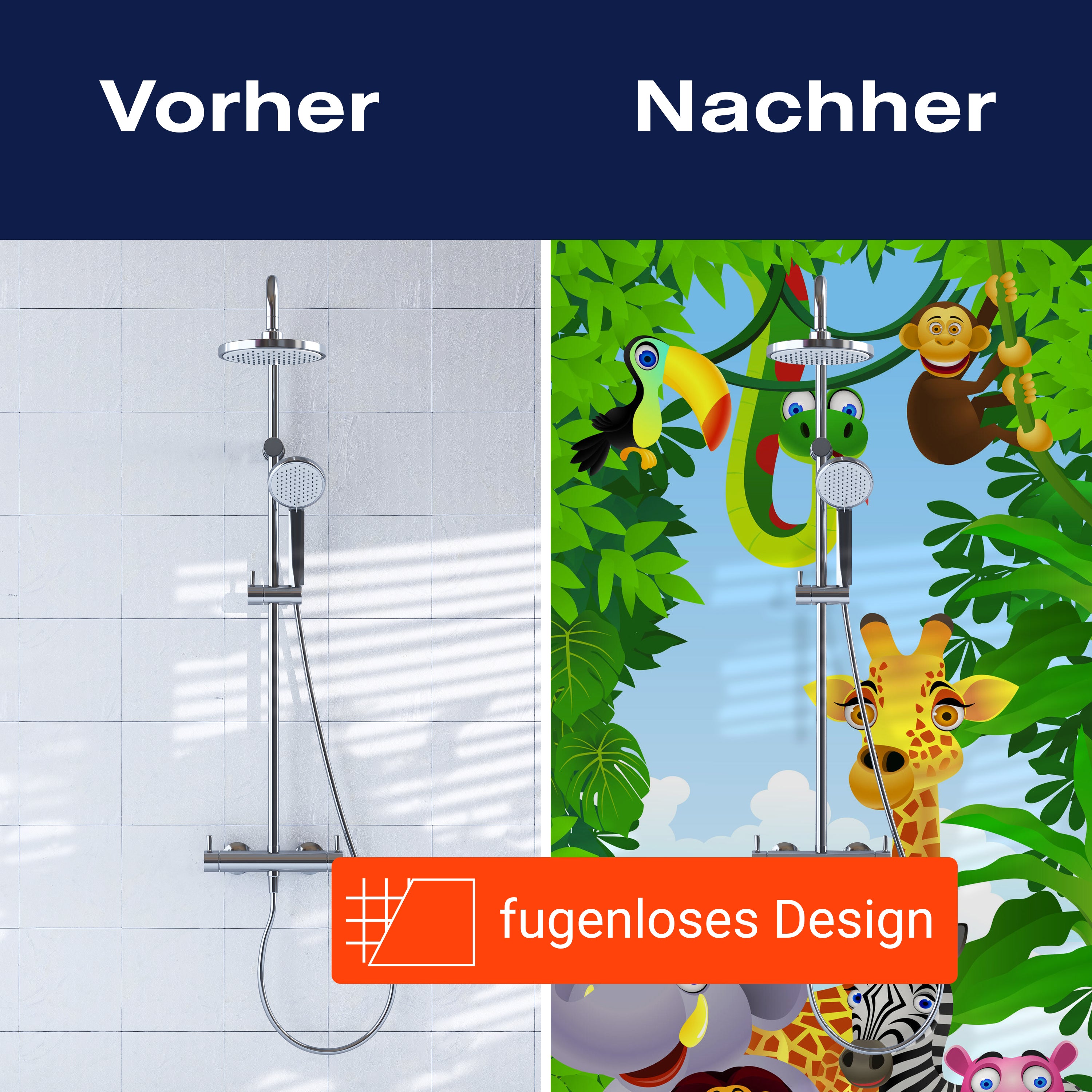 Bist du es leid, auf die langweiligen, schwer zu reinigende Fliesen in deiner Dusche zu schauen? Stell dir vor, wie dein Bad mit einer stilvollen, modernen Rückwand zum Leben erwacht! Unsere Duschwand 'Dschungelfreunde' ist nicht nur ein optisches Highlight, sondern auch praktisch und pflegeleicht.