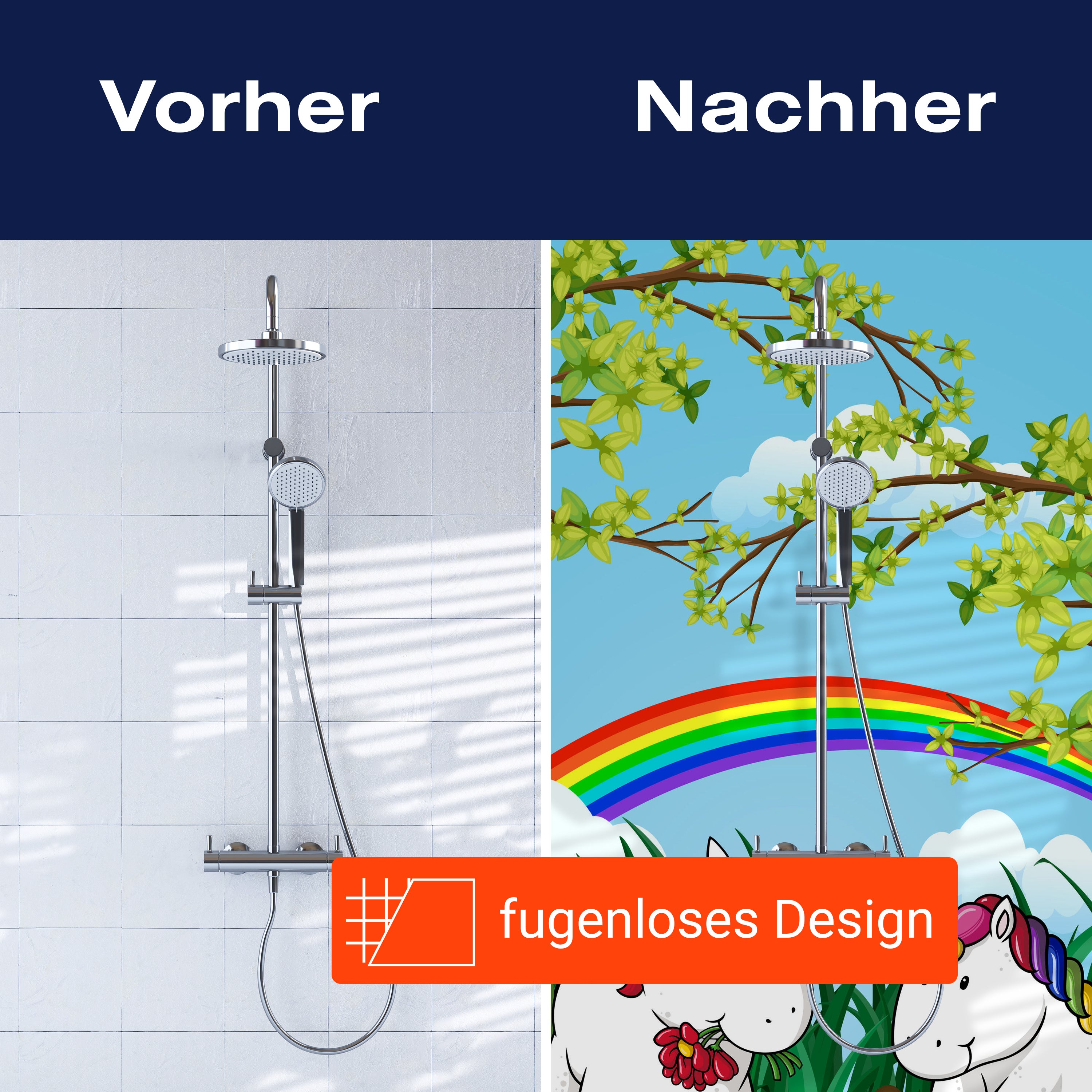 Vergiss die Tage, an denen Spritzer und Flecken deine Dusche ruiniert haben. Mit der Duschrückwand 'Einhörner' gehören solche Sorgen der Vergangenheit an. Das hochwertige Material sorgt dafür, dass deine Dusche gegen Wasser und andere alltägliche Missgeschicke resistent ist. Ein einfacher Wisch, und sie sieht aus wie neu – ohne den Einsatz von aggressiven Reinigungsmitteln.