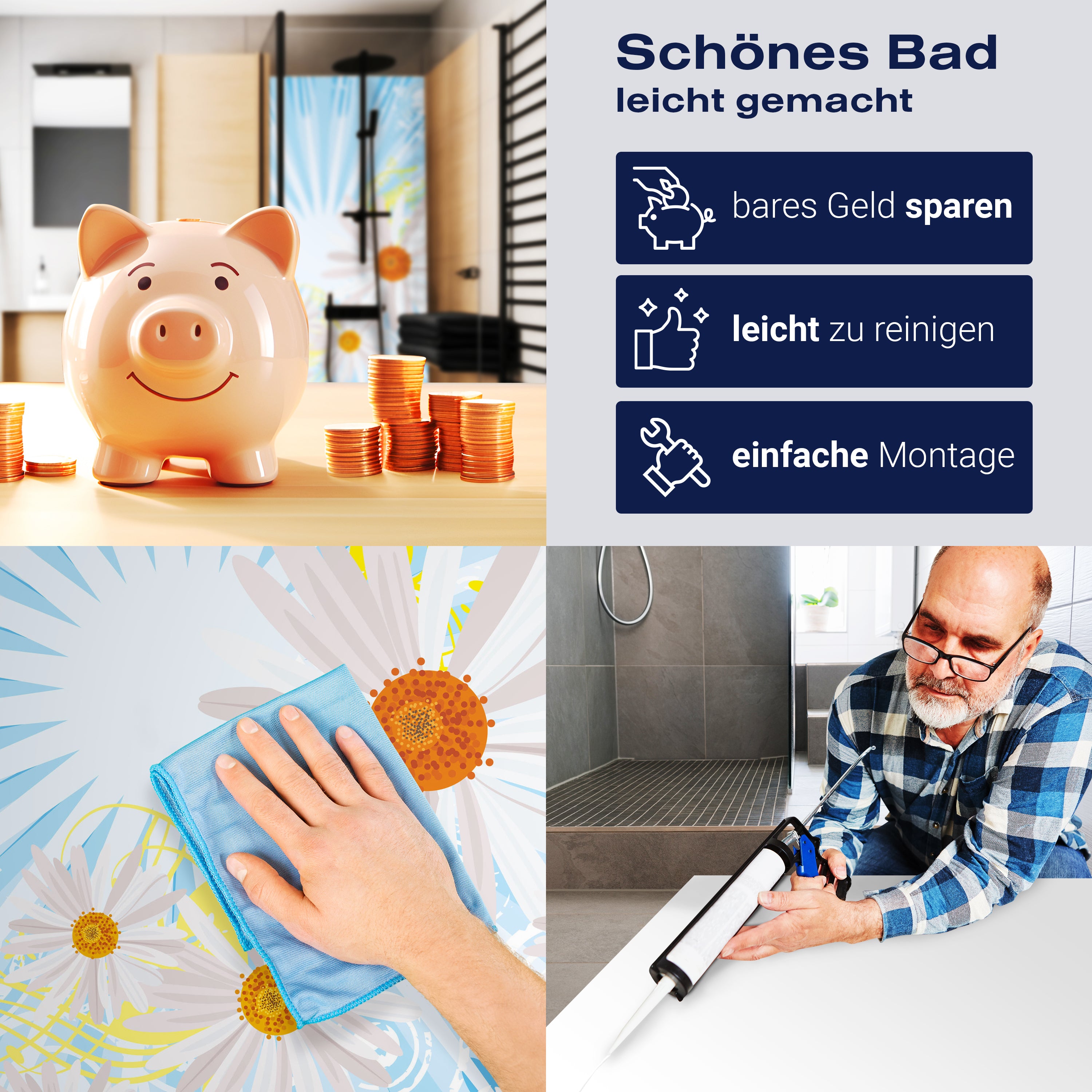 Die Reinigung Deiner Duschwand war noch nie so einfach. In einer Welt, in der Zeit ein kostbares Gut ist, verstehen wir, wie wichtig es ist, Reinigungsprozesse so effizient und mühelos wie möglich zu gestalten. Unsere Duschwände sind speziell dafür entworfen, Dein Leben leichter zu machen. Dank der glatten Oberfläche und der widerstandsfähigen Beschichtung lassen sich Spritzer und Flecken ohne großen Aufwand entfernen – ein schneller Wisch mit einem handelsüblichen Lappen, Spül- oder Wischtuch, und Deine Rückwand sieht aus wie neu.