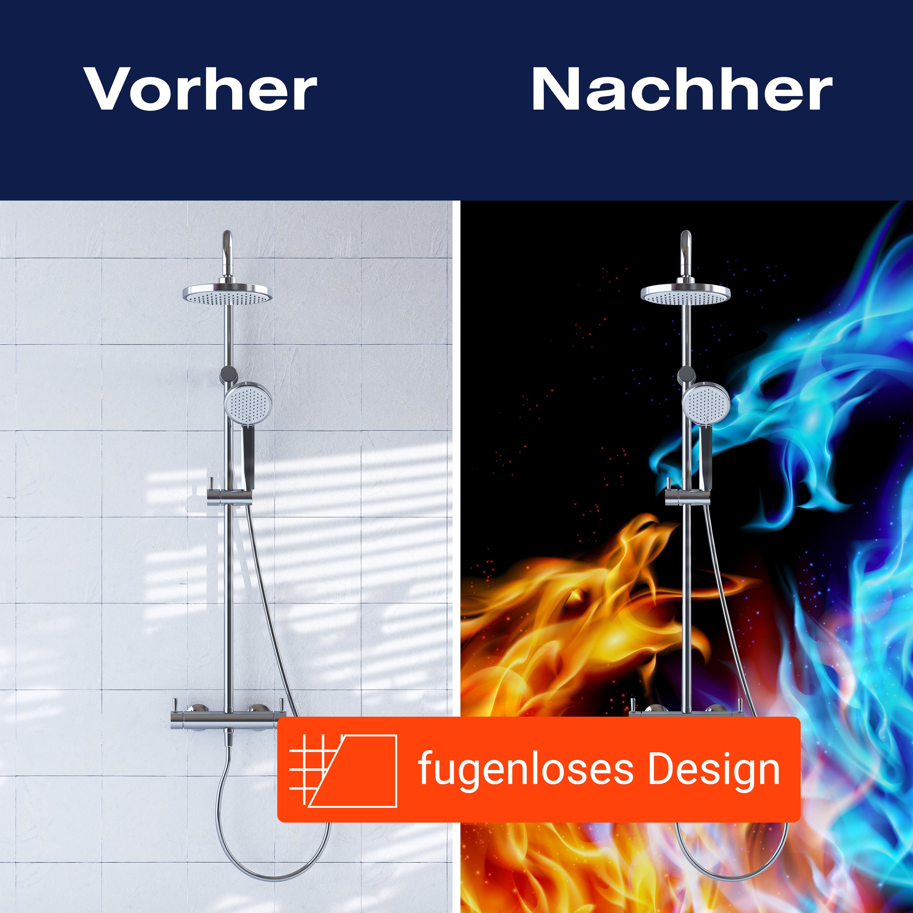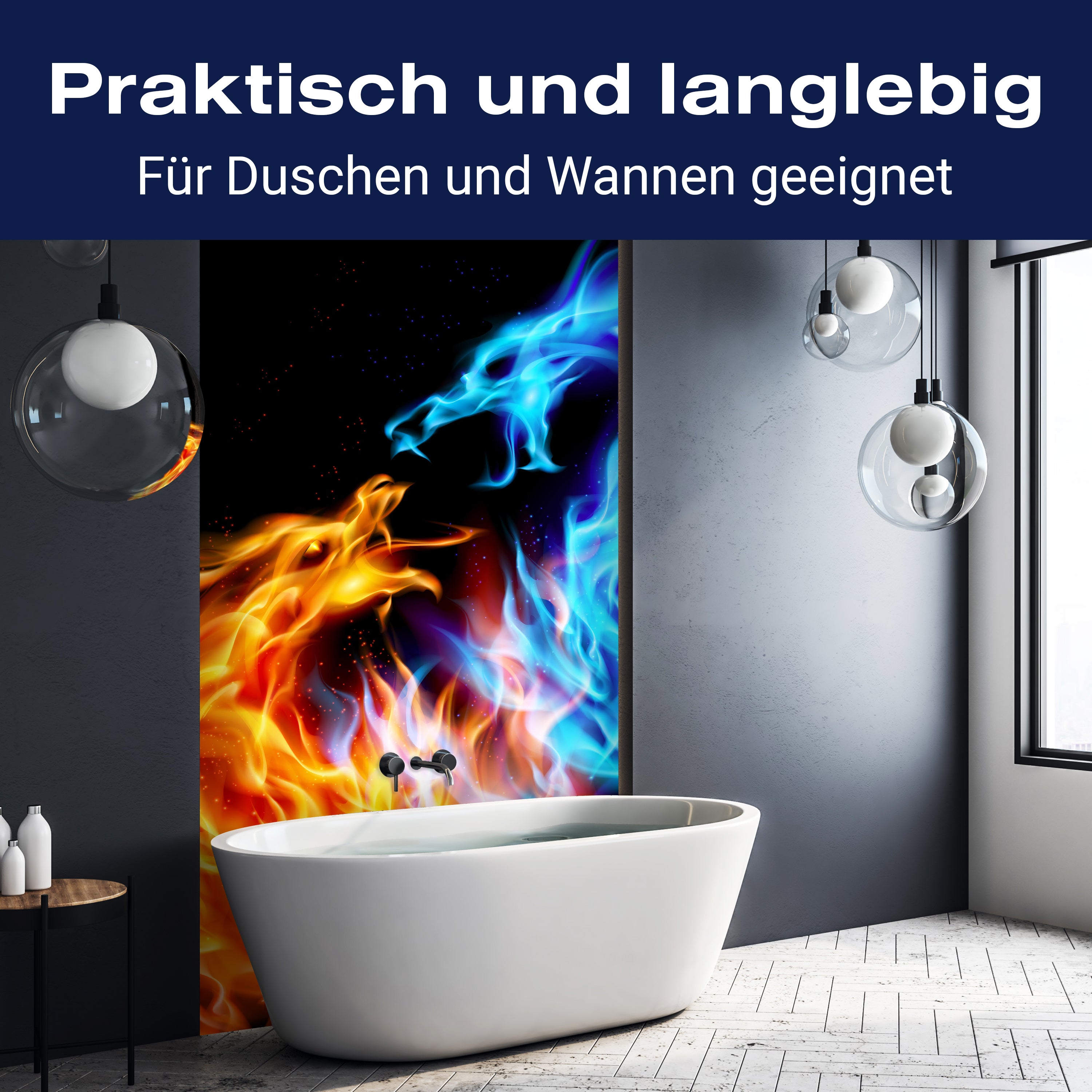 Bist du es leid, auf die langweiligen, schwer zu reinigende Fliesen in deiner Dusche zu schauen? Stell dir vor, wie dein Bad mit einer stilvollen, modernen Rückwand zum Leben erwacht! Unsere Duschwand 'Feuerdrachen' ist nicht nur ein optisches Highlight, sondern auch praktisch und pflegeleicht.