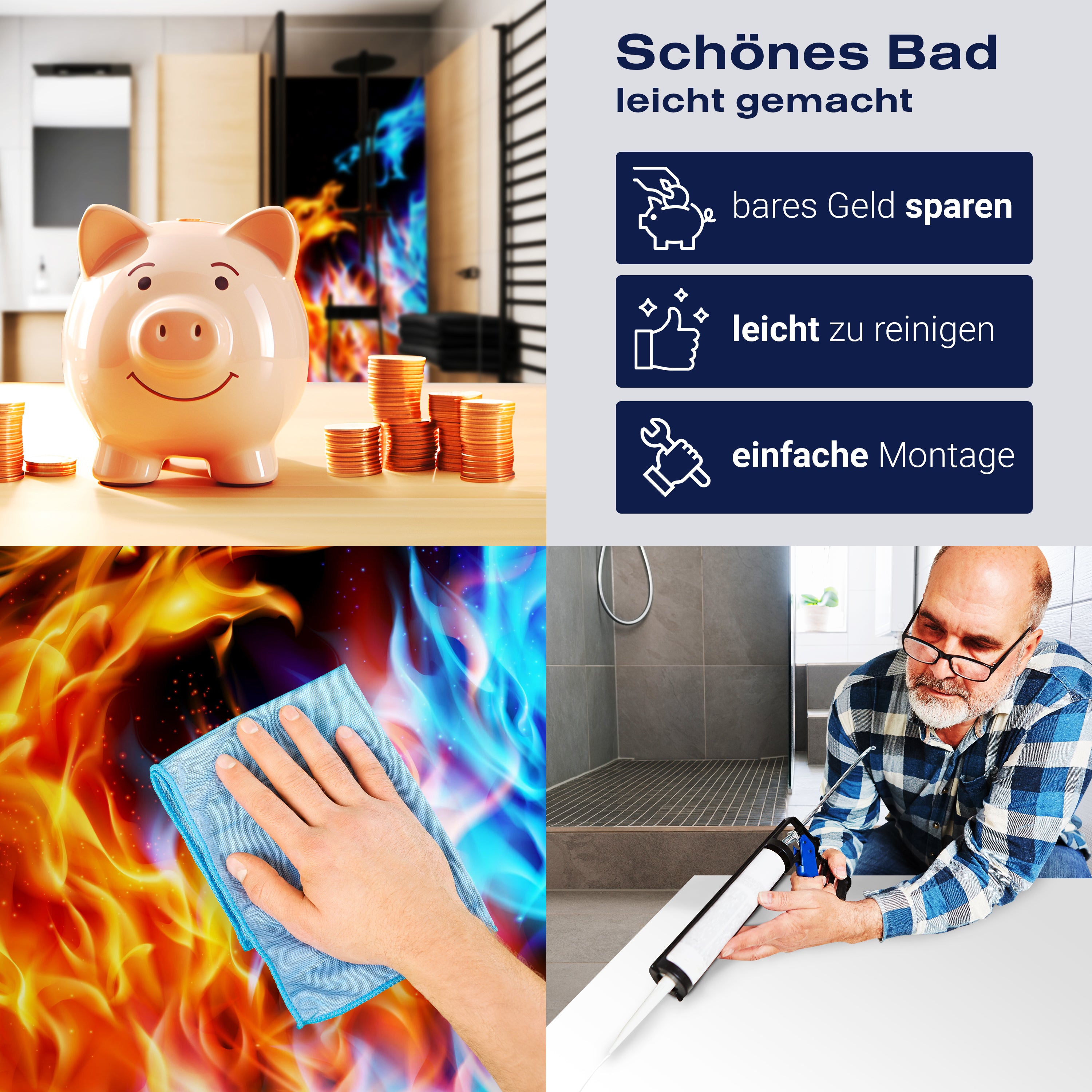 Die Reinigung Deiner Duschwand war noch nie so einfach. In einer Welt, in der Zeit ein kostbares Gut ist, verstehen wir, wie wichtig es ist, Reinigungsprozesse so effizient und mühelos wie möglich zu gestalten. Unsere Duschwände sind speziell dafür entworfen, Dein Leben leichter zu machen. Dank der glatten Oberfläche und der widerstandsfähigen Beschichtung lassen sich Spritzer und Flecken ohne großen Aufwand entfernen – ein schneller Wisch mit einem handelsüblichen Lappen, Spül- oder Wischtuch, und Deine Rückwand sieht aus wie neu.
