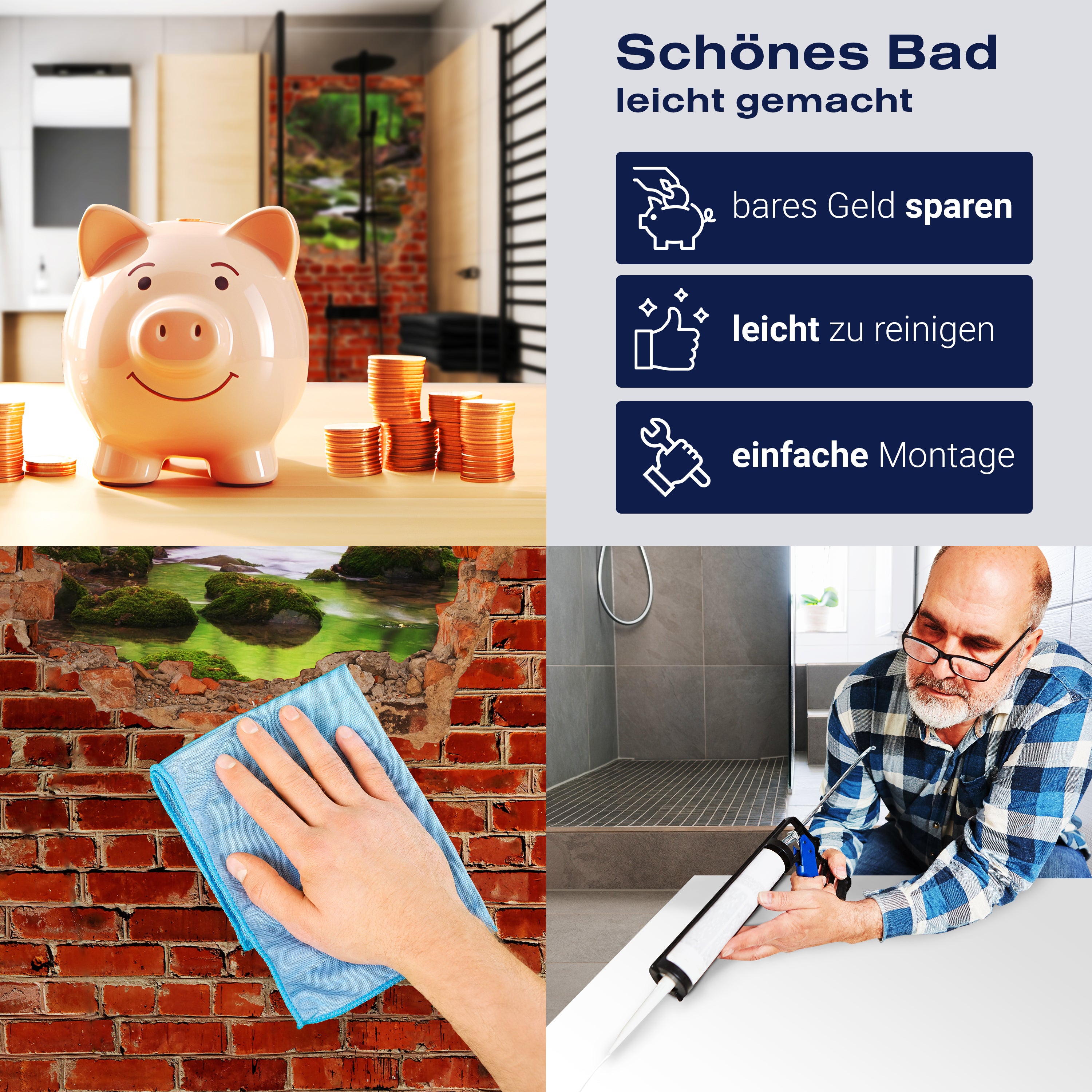 Die Reinigung Deiner Duschwand war noch nie so einfach. In einer Welt, in der Zeit ein kostbares Gut ist, verstehen wir, wie wichtig es ist, Reinigungsprozesse so effizient und mühelos wie möglich zu gestalten. Unsere Duschwände sind speziell dafür entworfen, Dein Leben leichter zu machen. Dank der glatten Oberfläche und der widerstandsfähigen Beschichtung lassen sich Spritzer und Flecken ohne großen Aufwand entfernen – ein schneller Wisch mit einem handelsüblichen Lappen, Spül- oder Wischtuch, und Deine Rückwand sieht aus wie neu.