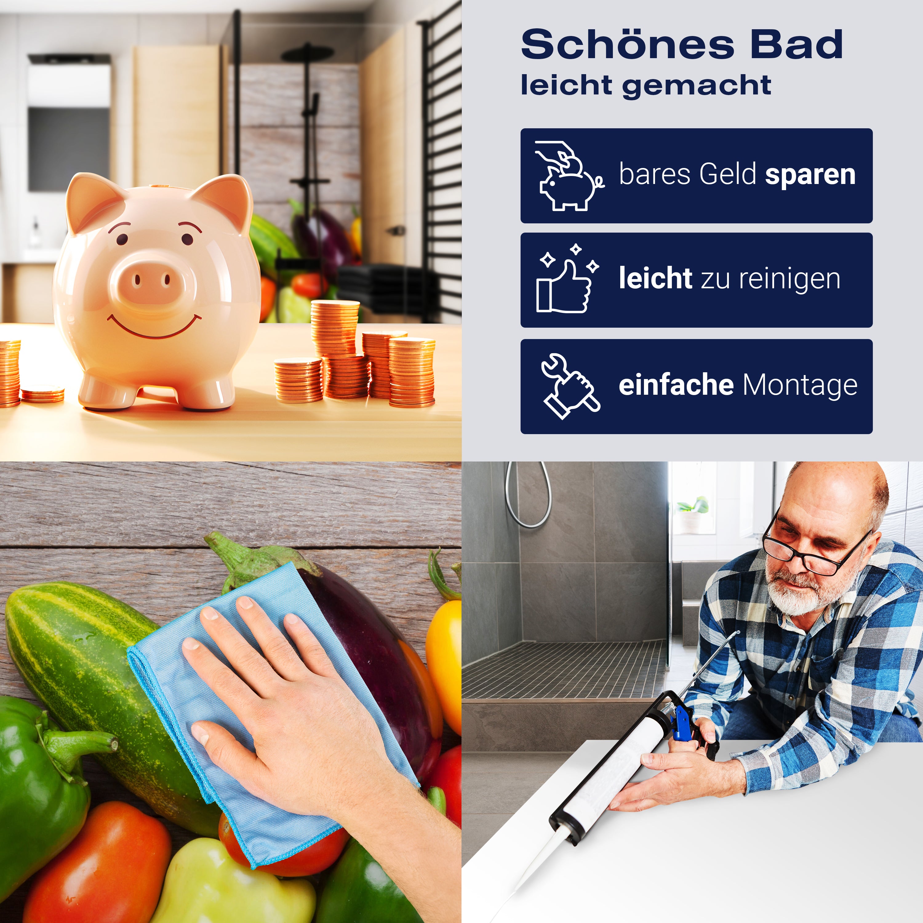 Die Reinigung Deiner Duschwand war noch nie so einfach. In einer Welt, in der Zeit ein kostbares Gut ist, verstehen wir, wie wichtig es ist, Reinigungsprozesse so effizient und mühelos wie möglich zu gestalten. Unsere Duschwände sind speziell dafür entworfen, Dein Leben leichter zu machen. Dank der glatten Oberfläche und der widerstandsfähigen Beschichtung lassen sich Spritzer und Flecken ohne großen Aufwand entfernen – ein schneller Wisch mit einem handelsüblichen Lappen, Spül- oder Wischtuch, und Deine Rückwand sieht aus wie neu.