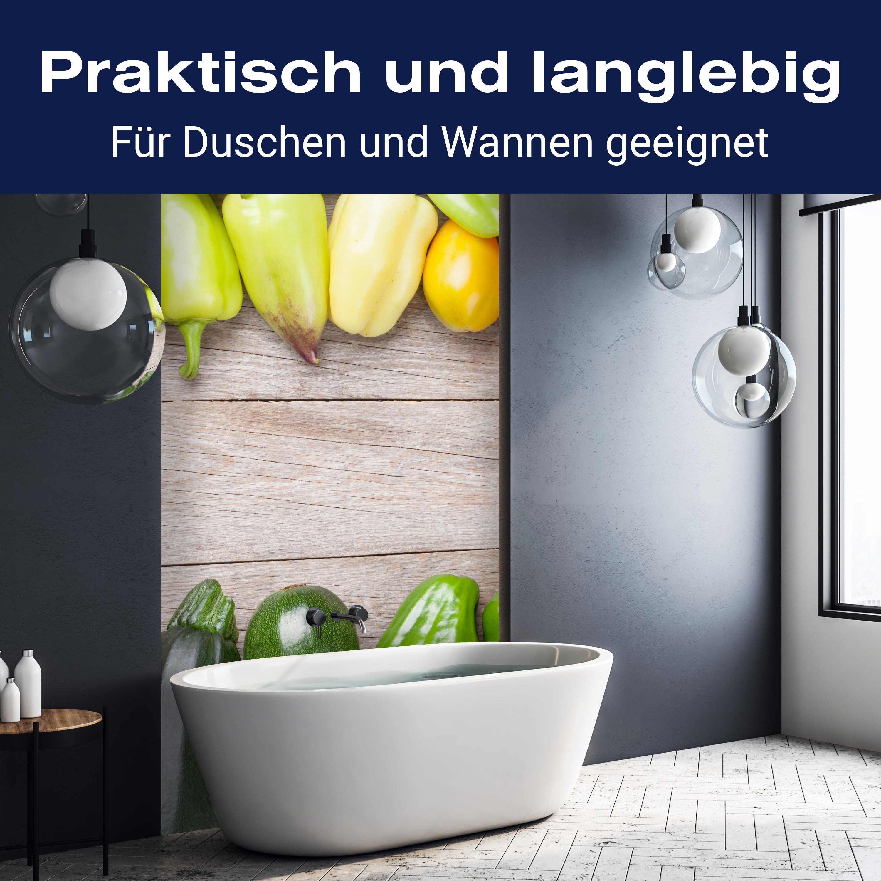 Vergiss die Tage, an denen Spritzer und Flecken deine Dusche ruiniert haben. Mit der Duschrückwand 'Frischgemüse, Holztisch' gehören solche Sorgen der Vergangenheit an. Das hochwertige Material sorgt dafür, dass deine Dusche gegen Wasser und andere alltägliche Missgeschicke resistent ist. Ein einfacher Wisch, und sie sieht aus wie neu – ohne den Einsatz von aggressiven Reinigungsmitteln.