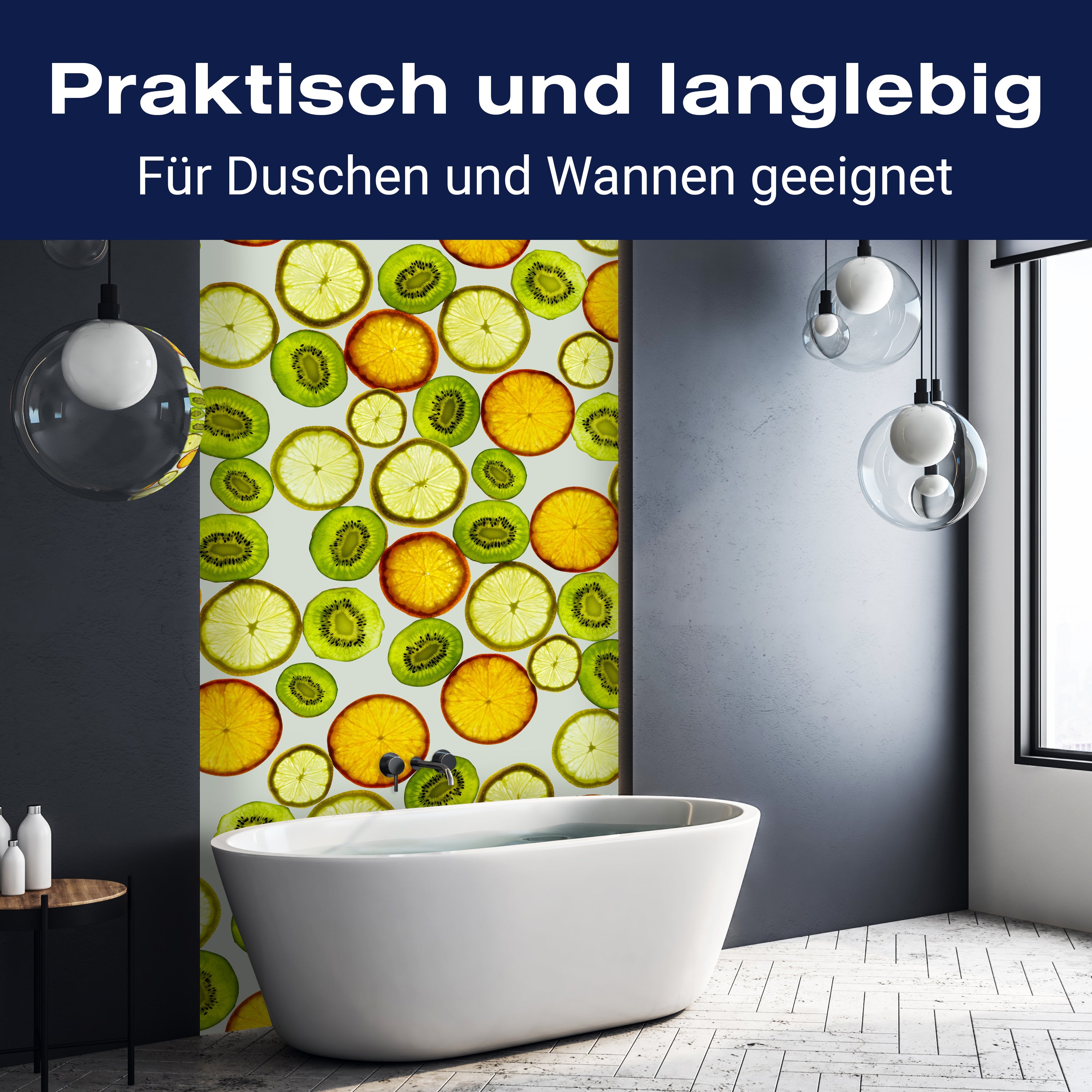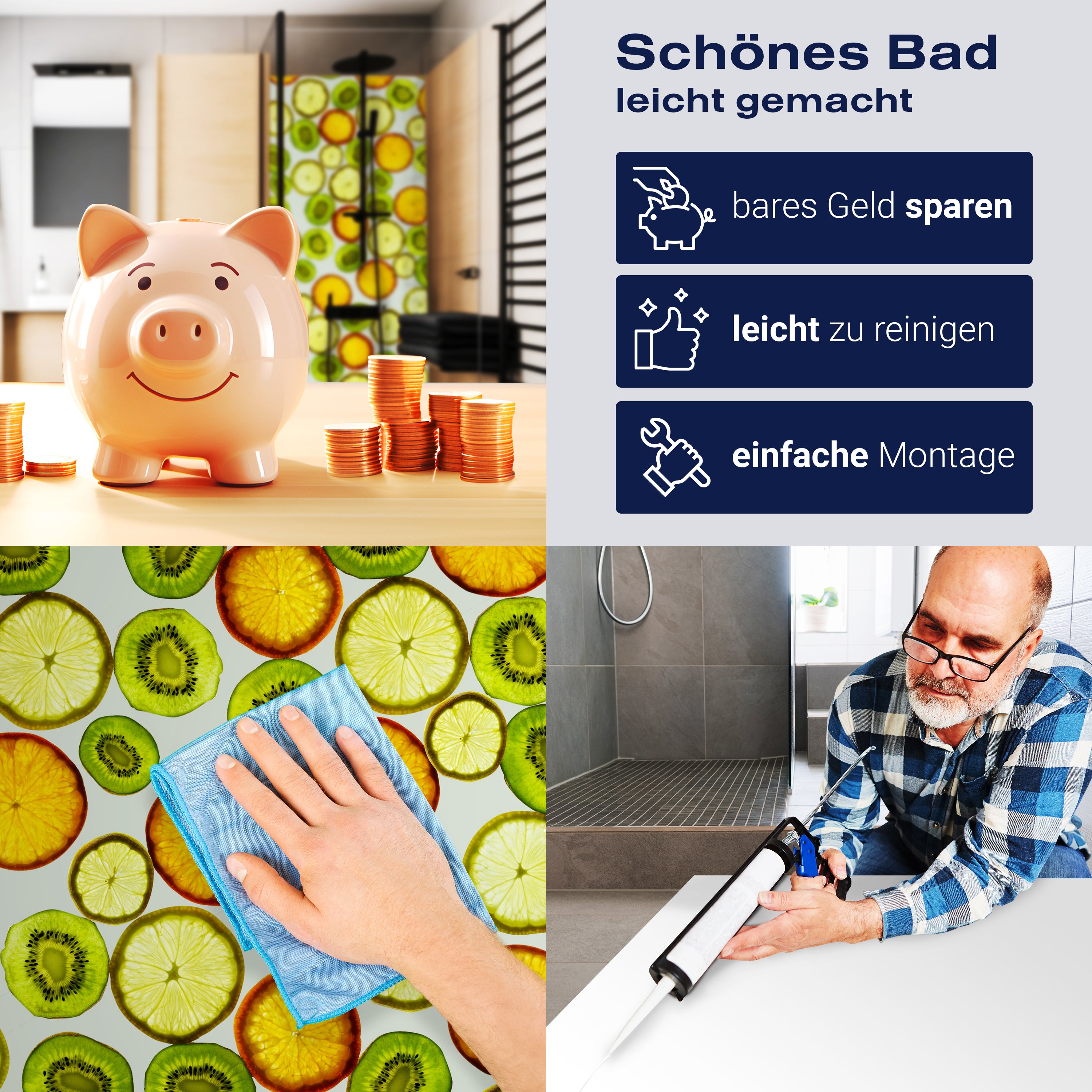 Bist du es leid, auf die langweiligen, schwer zu reinigende Fliesen in deiner Dusche zu schauen? Stell dir vor, wie dein Bad mit einer stilvollen, modernen Rückwand zum Leben erwacht! Unsere Duschwand 'Früchte Hintergrund' ist nicht nur ein optisches Highlight, sondern auch praktisch und pflegeleicht.