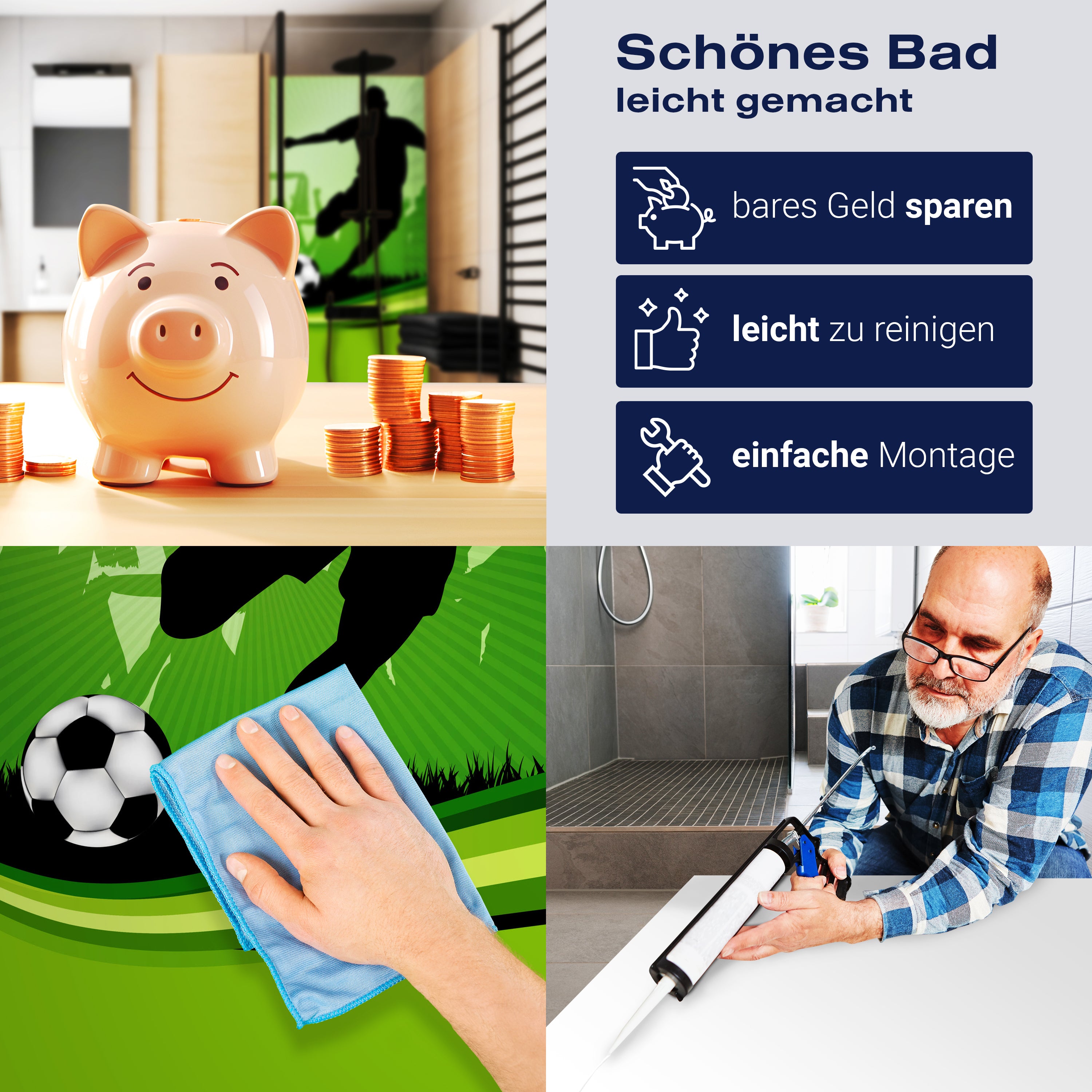 Vergiss die Tage, an denen Spritzer und Flecken deine Dusche ruiniert haben. Mit der Duschrückwand 'Fussball' gehören solche Sorgen der Vergangenheit an. Das hochwertige Material sorgt dafür, dass deine Dusche gegen Wasser und andere alltägliche Missgeschicke resistent ist. Ein einfacher Wisch, und sie sieht aus wie neu – ohne den Einsatz von aggressiven Reinigungsmitteln.