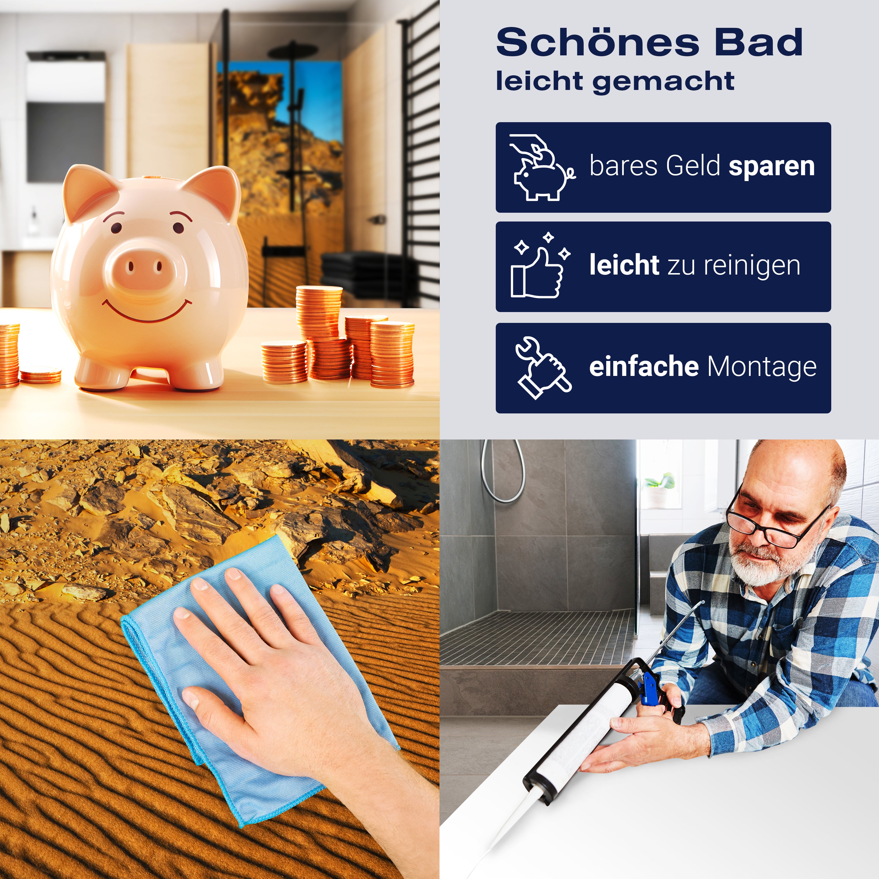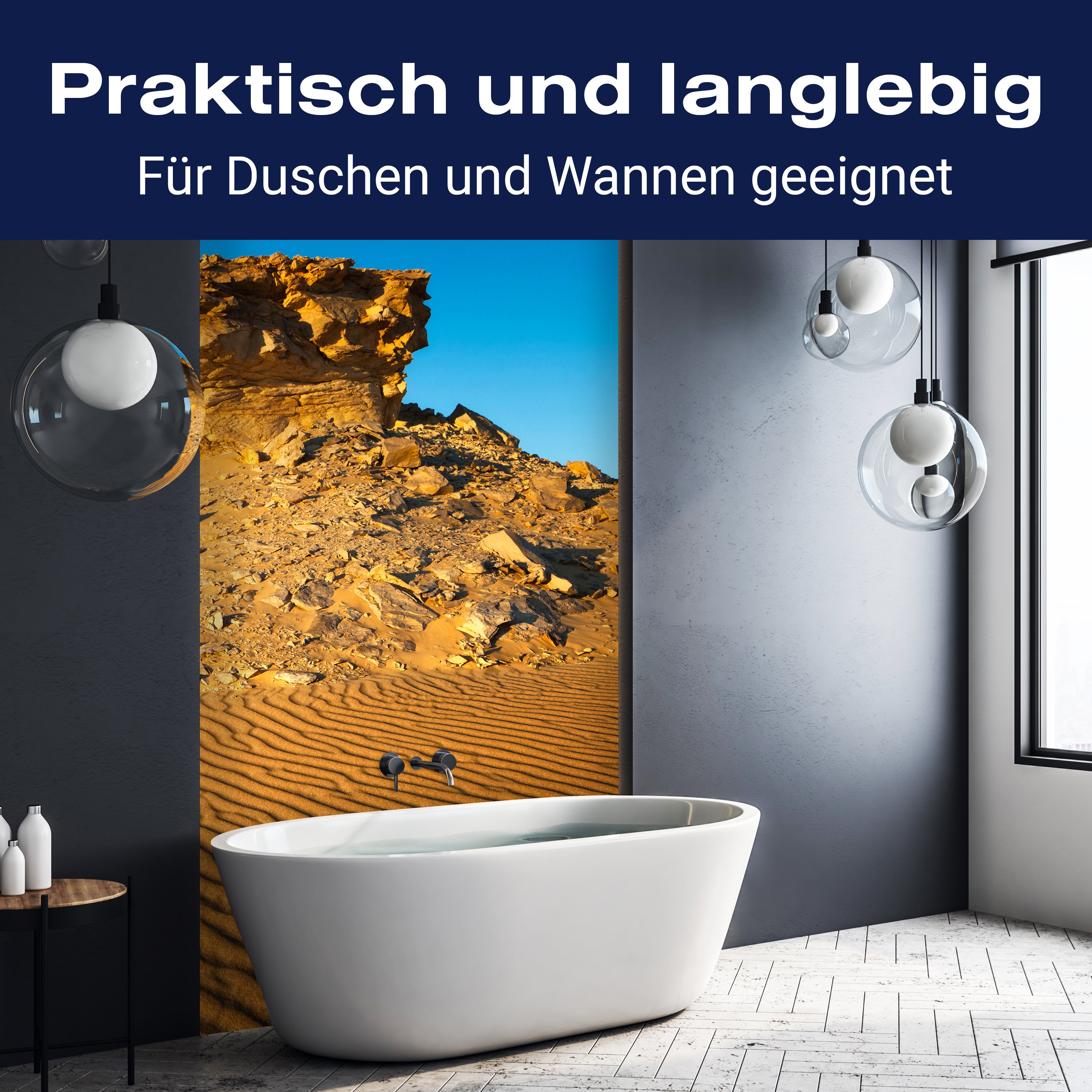 Bist du es leid, auf die langweiligen, schwer zu reinigende Fliesen in deiner Dusche zu schauen? Stell dir vor, wie dein Bad mit einer stilvollen, modernen Rückwand zum Leben erwacht! Unsere Duschwand 'Goldene Wüste' ist nicht nur ein optisches Highlight, sondern auch praktisch und pflegeleicht.