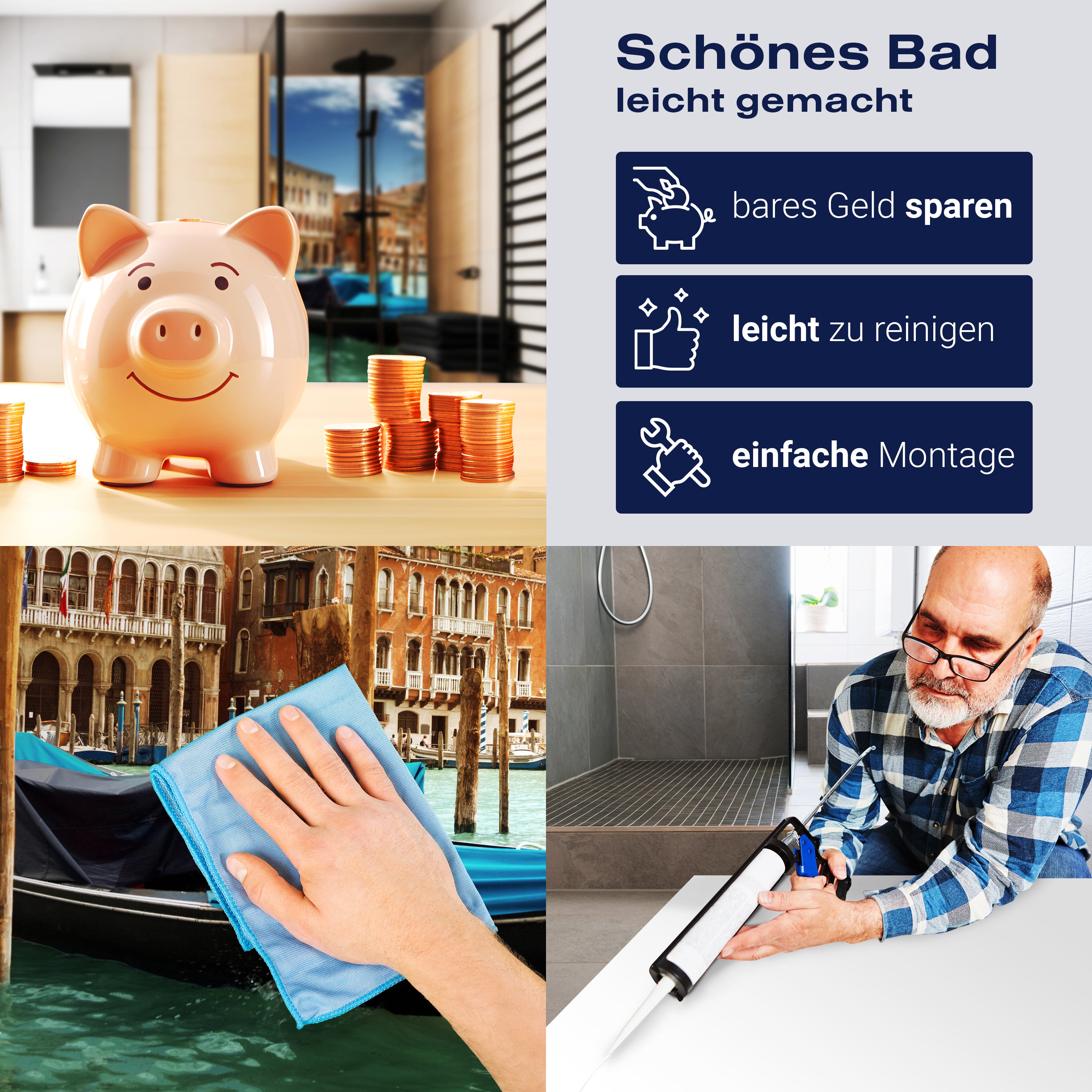 Bist du es leid, auf die langweiligen, schwer zu reinigende Fliesen in deiner Dusche zu schauen? Stell dir vor, wie dein Bad mit einer stilvollen, modernen Rückwand zum Leben erwacht! Unsere Duschwand 'Gondeln Venedig' ist nicht nur ein optisches Highlight, sondern auch praktisch und pflegeleicht.