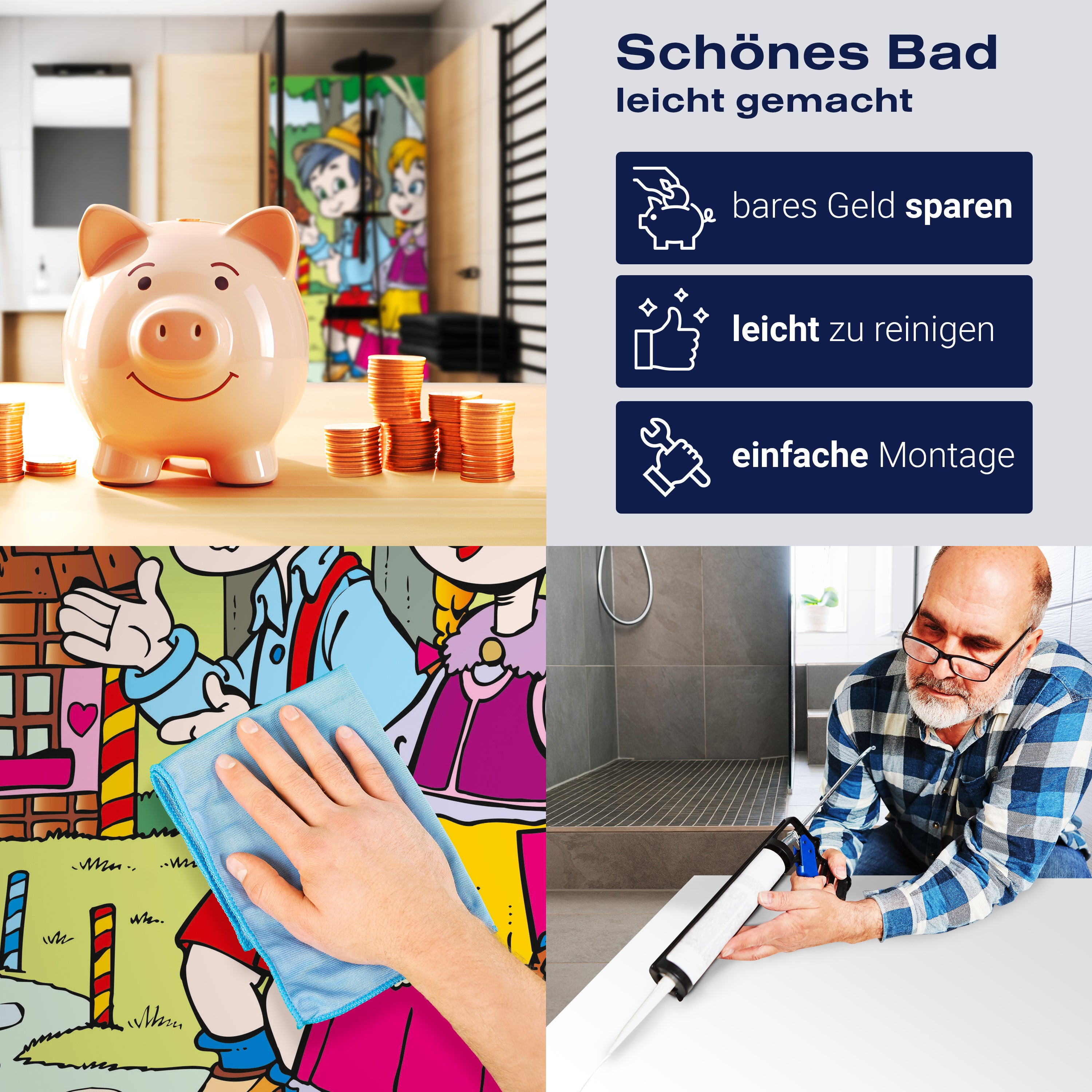 Bist du es leid, auf die langweiligen, schwer zu reinigende Fliesen in deiner Dusche zu schauen? Stell dir vor, wie dein Bad mit einer stilvollen, modernen Rückwand zum Leben erwacht! Unsere Duschwand 'Hänsel und Gretel' ist nicht nur ein optisches Highlight, sondern auch praktisch und pflegeleicht.