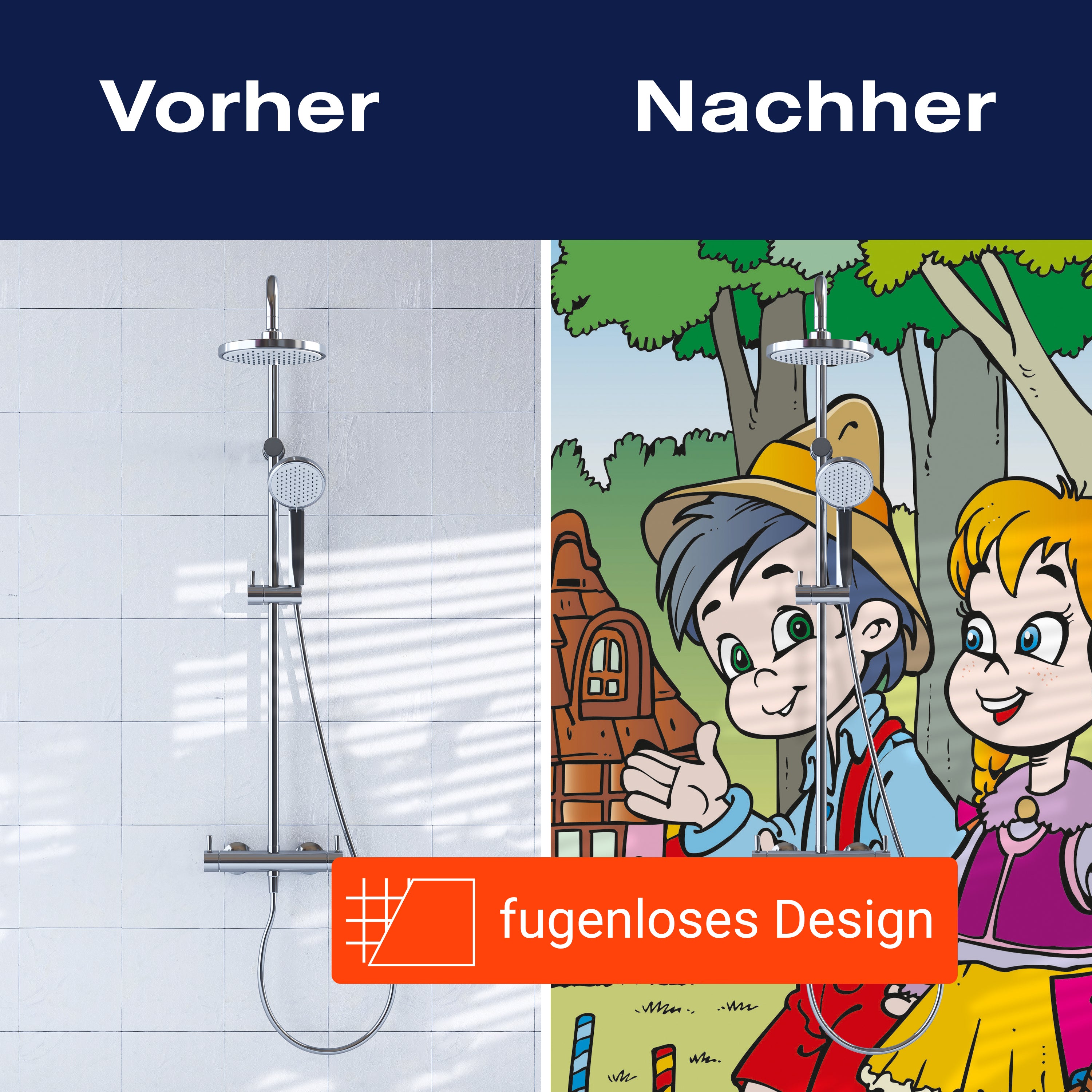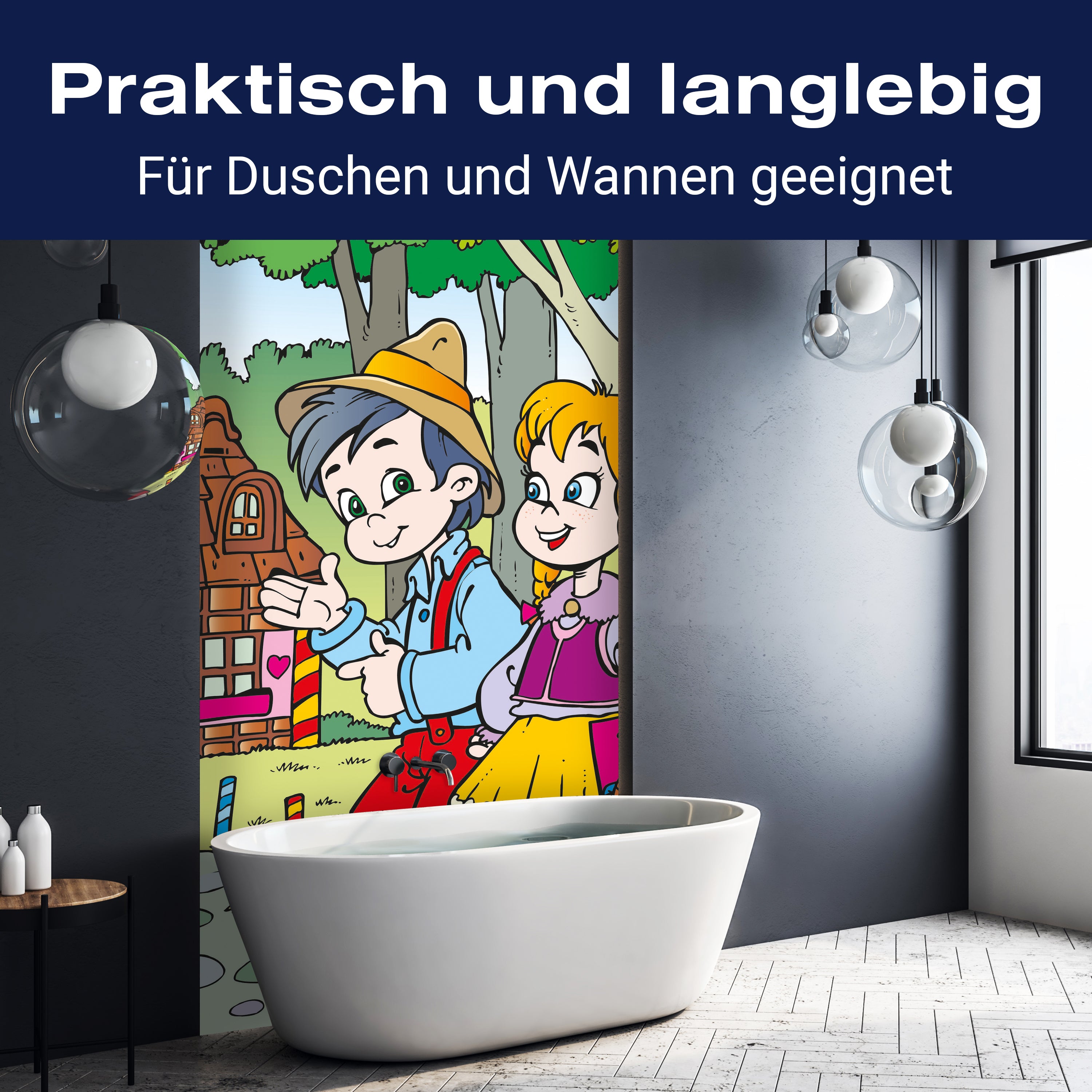 Vergiss die Tage, an denen Spritzer und Flecken deine Dusche ruiniert haben. Mit der Duschrückwand 'Hänsel und Gretel' gehören solche Sorgen der Vergangenheit an. Das hochwertige Material sorgt dafür, dass deine Dusche gegen Wasser und andere alltägliche Missgeschicke resistent ist. Ein einfacher Wisch, und sie sieht aus wie neu – ohne den Einsatz von aggressiven Reinigungsmitteln.