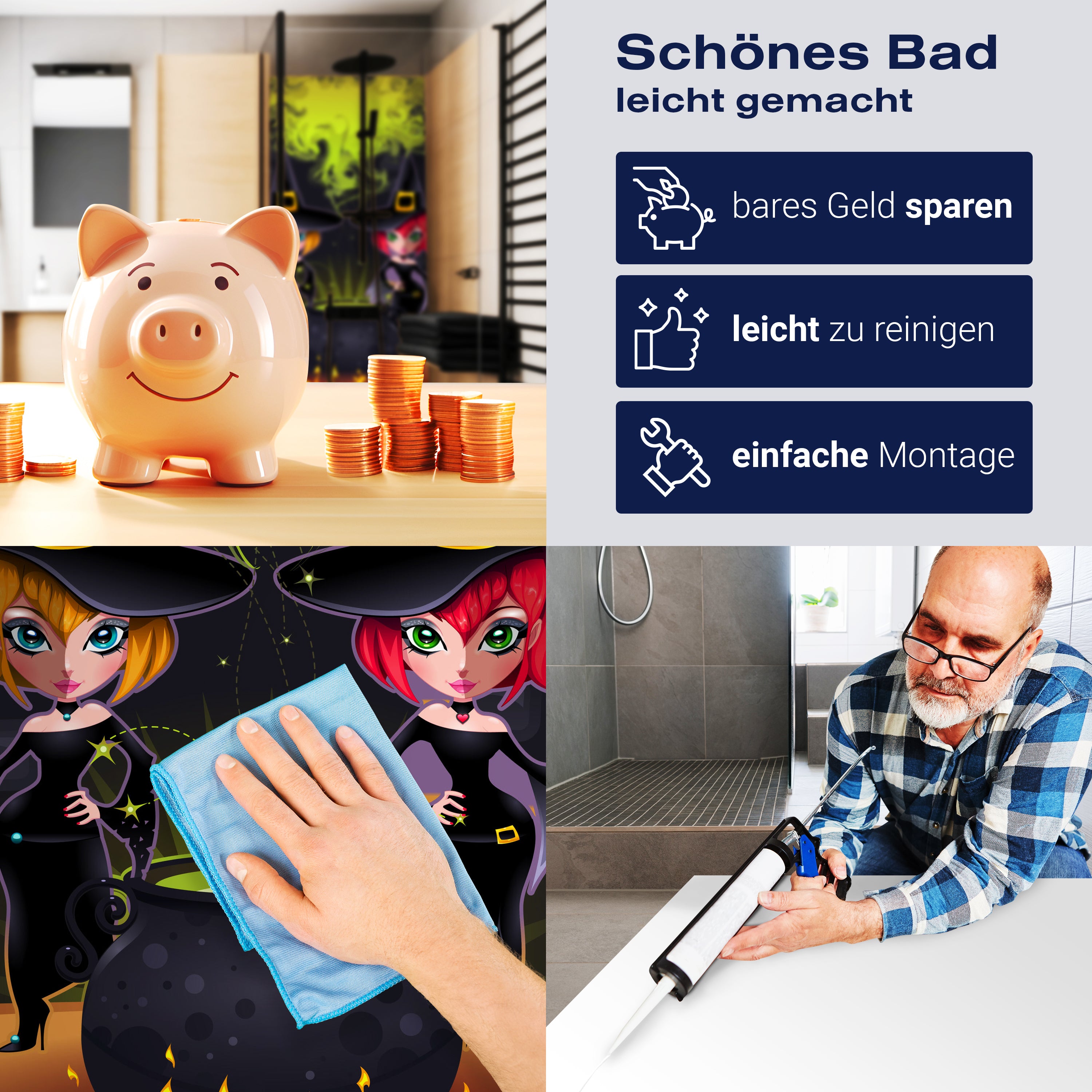 Vergiss die Tage, an denen Spritzer und Flecken deine Dusche ruiniert haben. Mit der Duschrückwand 'Hexen' gehören solche Sorgen der Vergangenheit an. Das hochwertige Material sorgt dafür, dass deine Dusche gegen Wasser und andere alltägliche Missgeschicke resistent ist. Ein einfacher Wisch, und sie sieht aus wie neu – ohne den Einsatz von aggressiven Reinigungsmitteln.