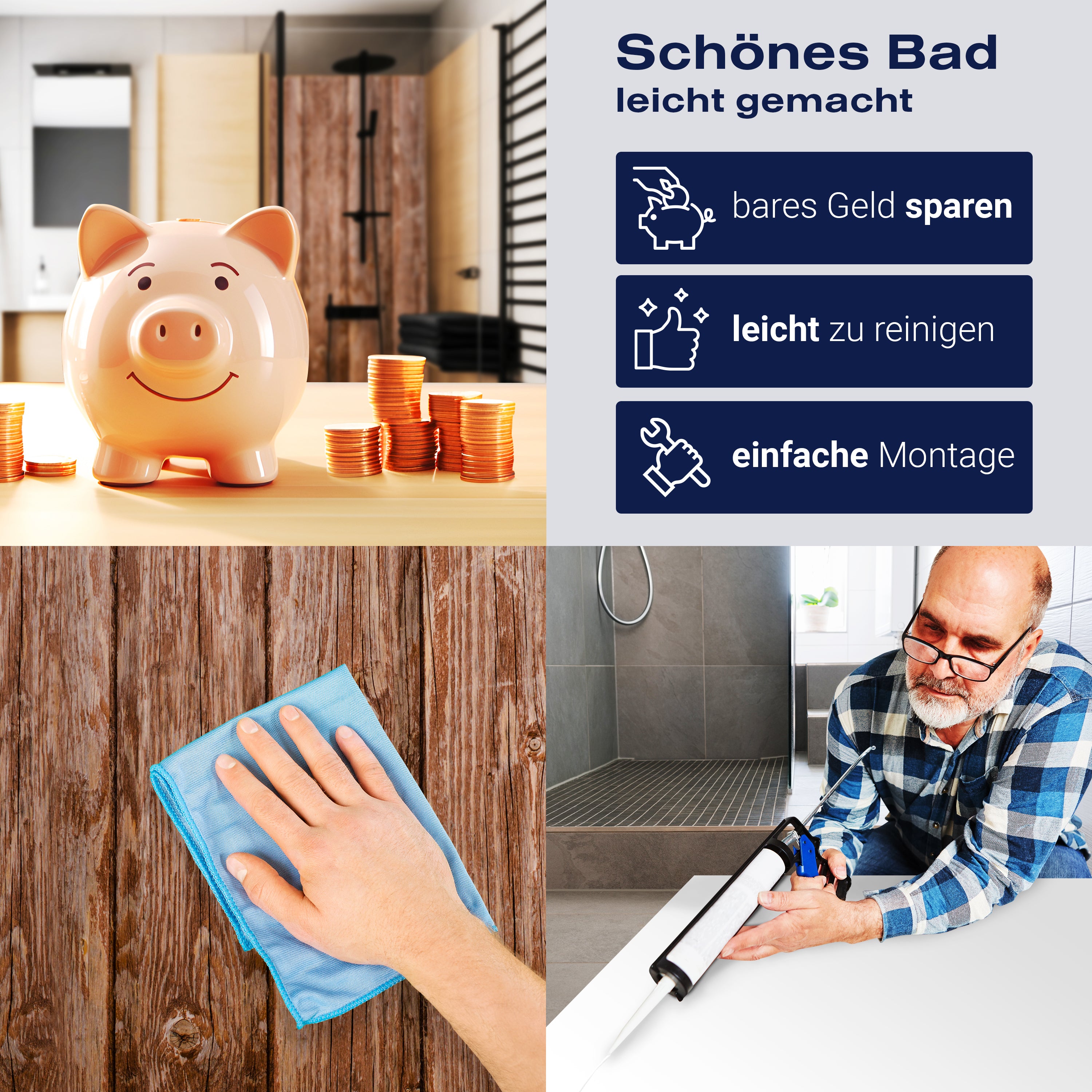 Diese Materialien bieten im Vergleich zu traditionellen Fliesen mehrere Vorteile. Sie haben eine fugenlose Oberfläche, was bedeutet, dass sie weniger anfällig für Schimmelbildung und leichter zu reinigen sind, da sich Schmutz und Kalk nicht in Fugen festsetzen können. Darüber hinaus ermöglichen sie eine schnelle und einfache Renovierung, da sie direkt über bestehenden Fliesen montiert werden können, was Zeit und Kosten spart