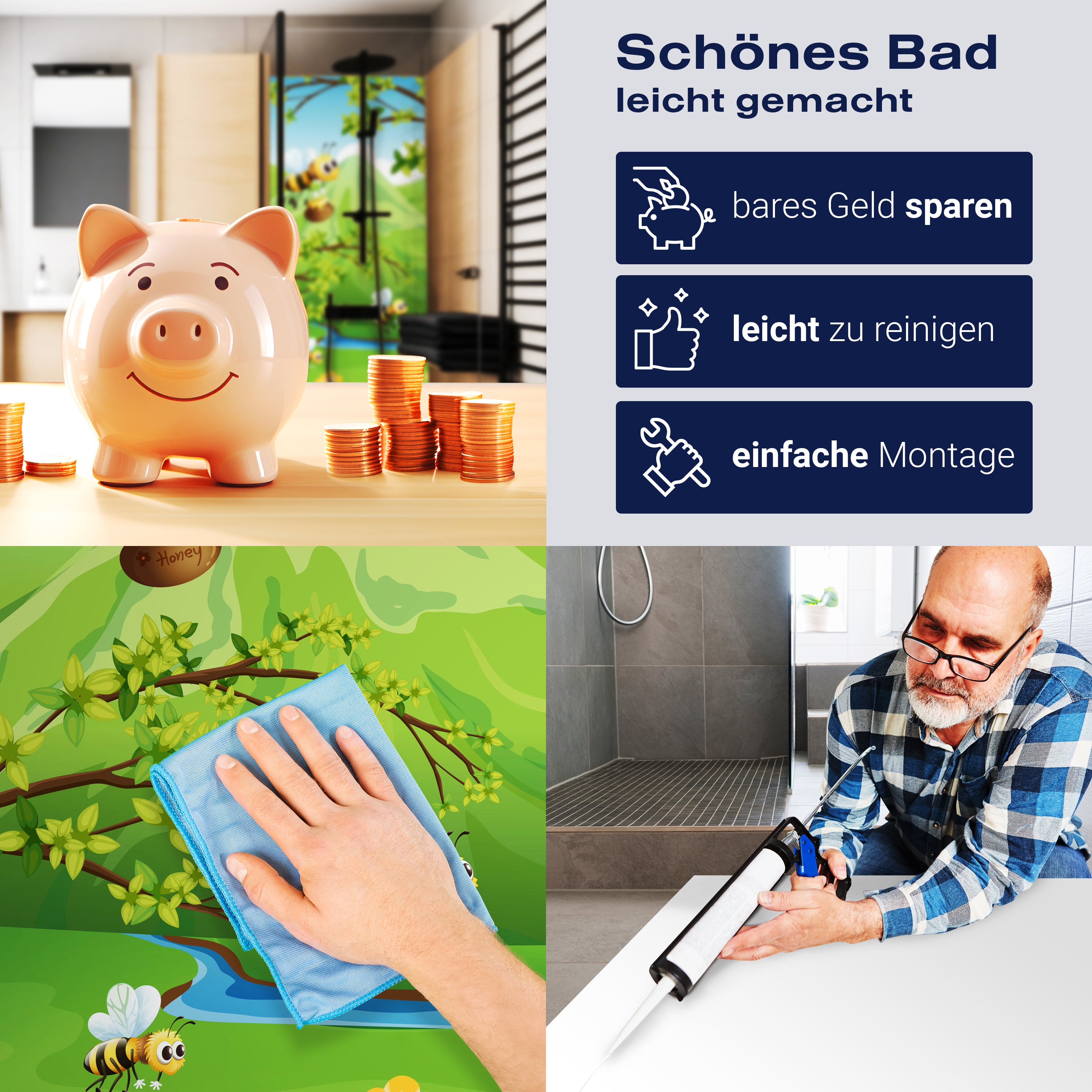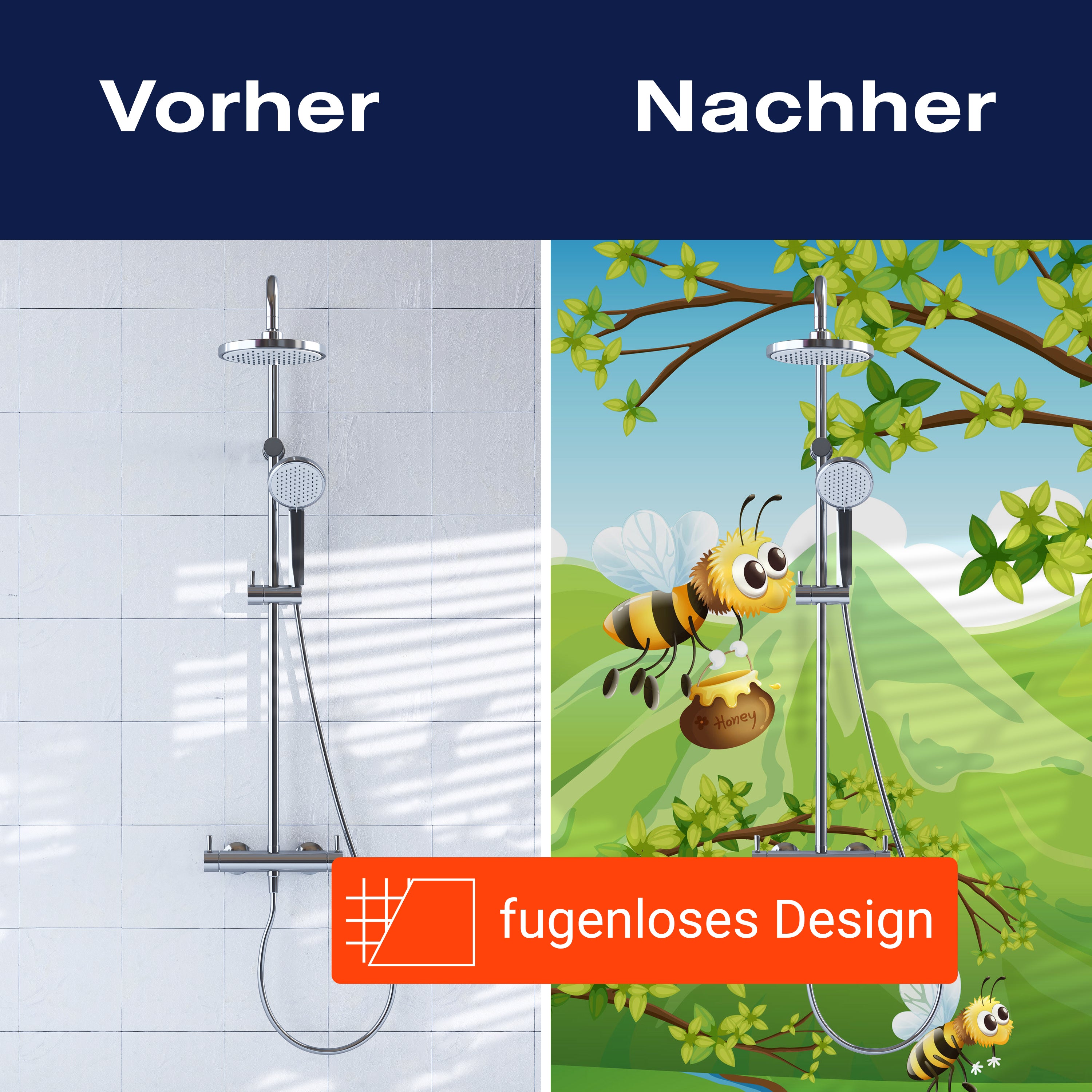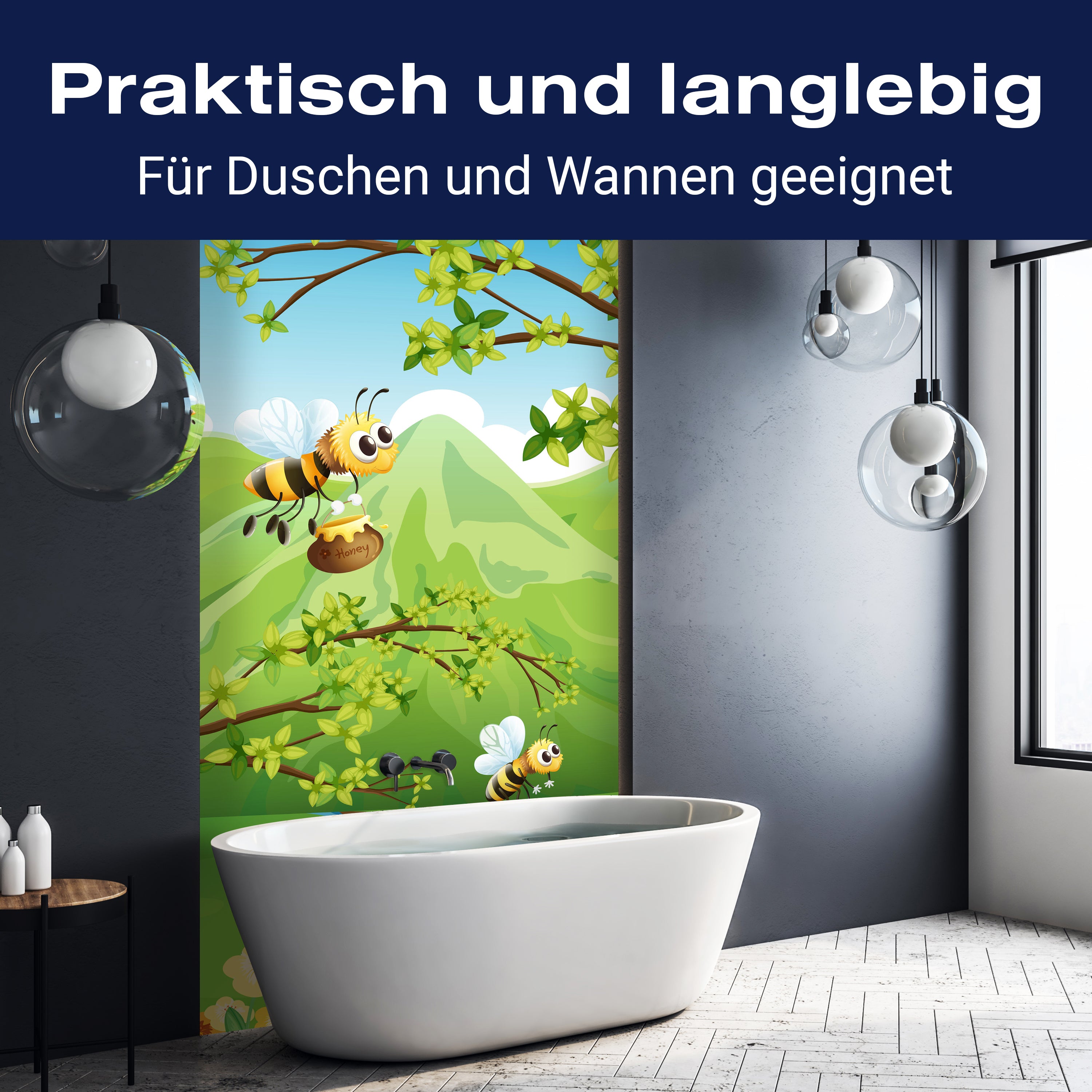 Bist du es leid, auf die langweiligen, schwer zu reinigende Fliesen in deiner Dusche zu schauen? Stell dir vor, wie dein Bad mit einer stilvollen, modernen Rückwand zum Leben erwacht! Unsere Duschwand 'Honigbienen' ist nicht nur ein optisches Highlight, sondern auch praktisch und pflegeleicht.