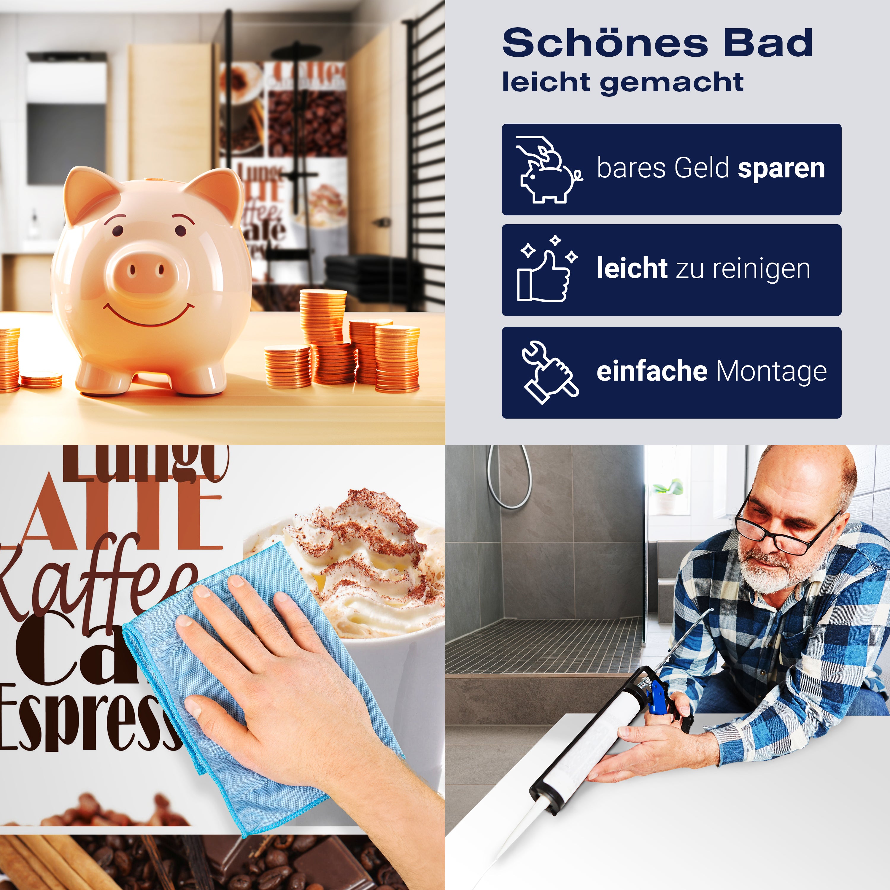 Die Reinigung Deiner Duschwand war noch nie so einfach. In einer Welt, in der Zeit ein kostbares Gut ist, verstehen wir, wie wichtig es ist, Reinigungsprozesse so effizient und mühelos wie möglich zu gestalten. Unsere Duschwände sind speziell dafür entworfen, Dein Leben leichter zu machen. Dank der glatten Oberfläche und der widerstandsfähigen Beschichtung lassen sich Spritzer und Flecken ohne großen Aufwand entfernen – ein schneller Wisch mit einem handelsüblichen Lappen, Spül- oder Wischtuch, und Deine Rückwand sieht aus wie neu.