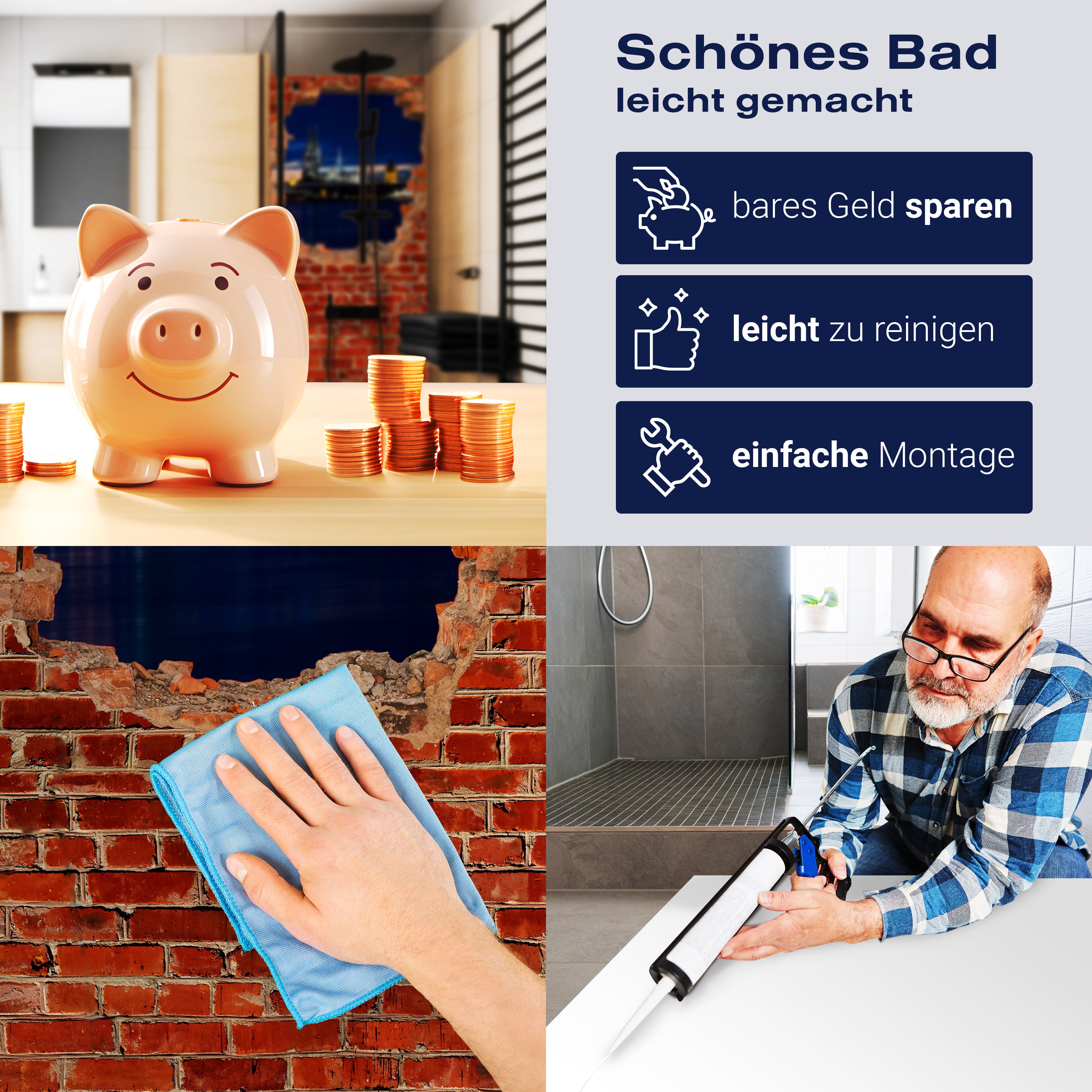 Die Reinigung Deiner Duschwand war noch nie so einfach. In einer Welt, in der Zeit ein kostbares Gut ist, verstehen wir, wie wichtig es ist, Reinigungsprozesse so effizient und mühelos wie möglich zu gestalten. Unsere Duschwände sind speziell dafür entworfen, Dein Leben leichter zu machen. Dank der glatten Oberfläche und der widerstandsfähigen Beschichtung lassen sich Spritzer und Flecken ohne großen Aufwand entfernen – ein schneller Wisch mit einem handelsüblichen Lappen, Spül- oder Wischtuch, und Deine Rückwand sieht aus wie neu.