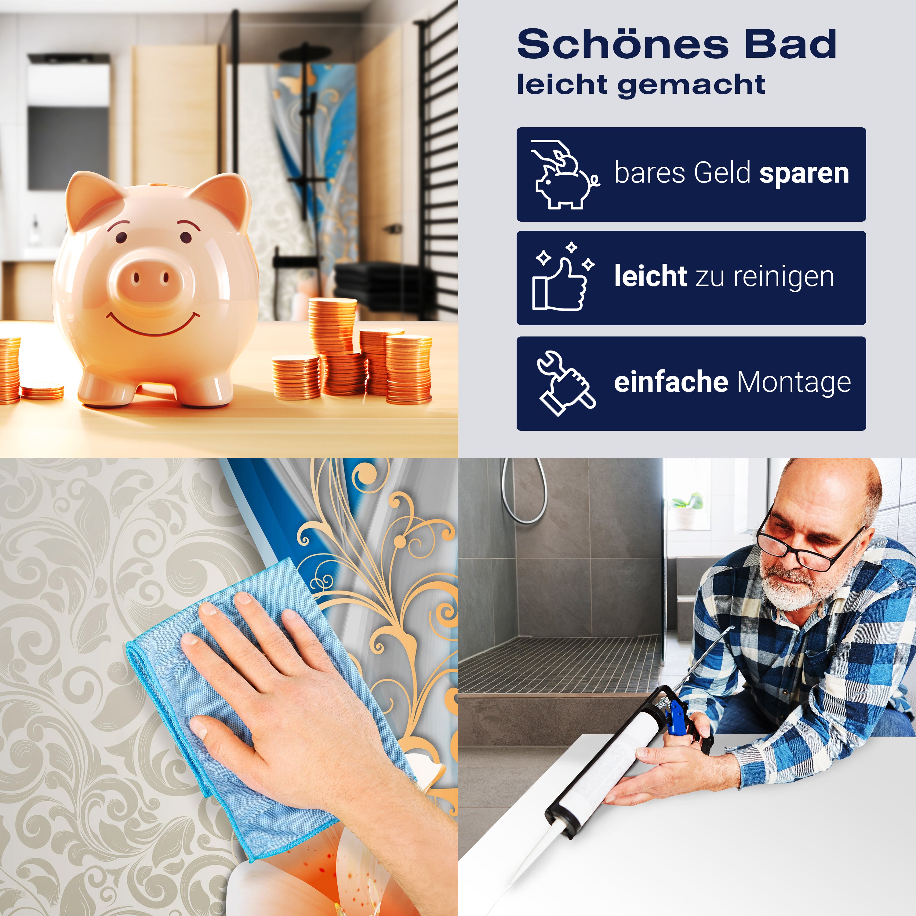 Die Reinigung Deiner Duschwand war noch nie so einfach. In einer Welt, in der Zeit ein kostbares Gut ist, verstehen wir, wie wichtig es ist, Reinigungsprozesse so effizient und mühelos wie möglich zu gestalten. Unsere Duschwände sind speziell dafür entworfen, Dein Leben leichter zu machen. Dank der glatten Oberfläche und der widerstandsfähigen Beschichtung lassen sich Spritzer und Flecken ohne großen Aufwand entfernen – ein schneller Wisch mit einem handelsüblichen Lappen, Spül- oder Wischtuch, und Deine Rückwand sieht aus wie neu.
