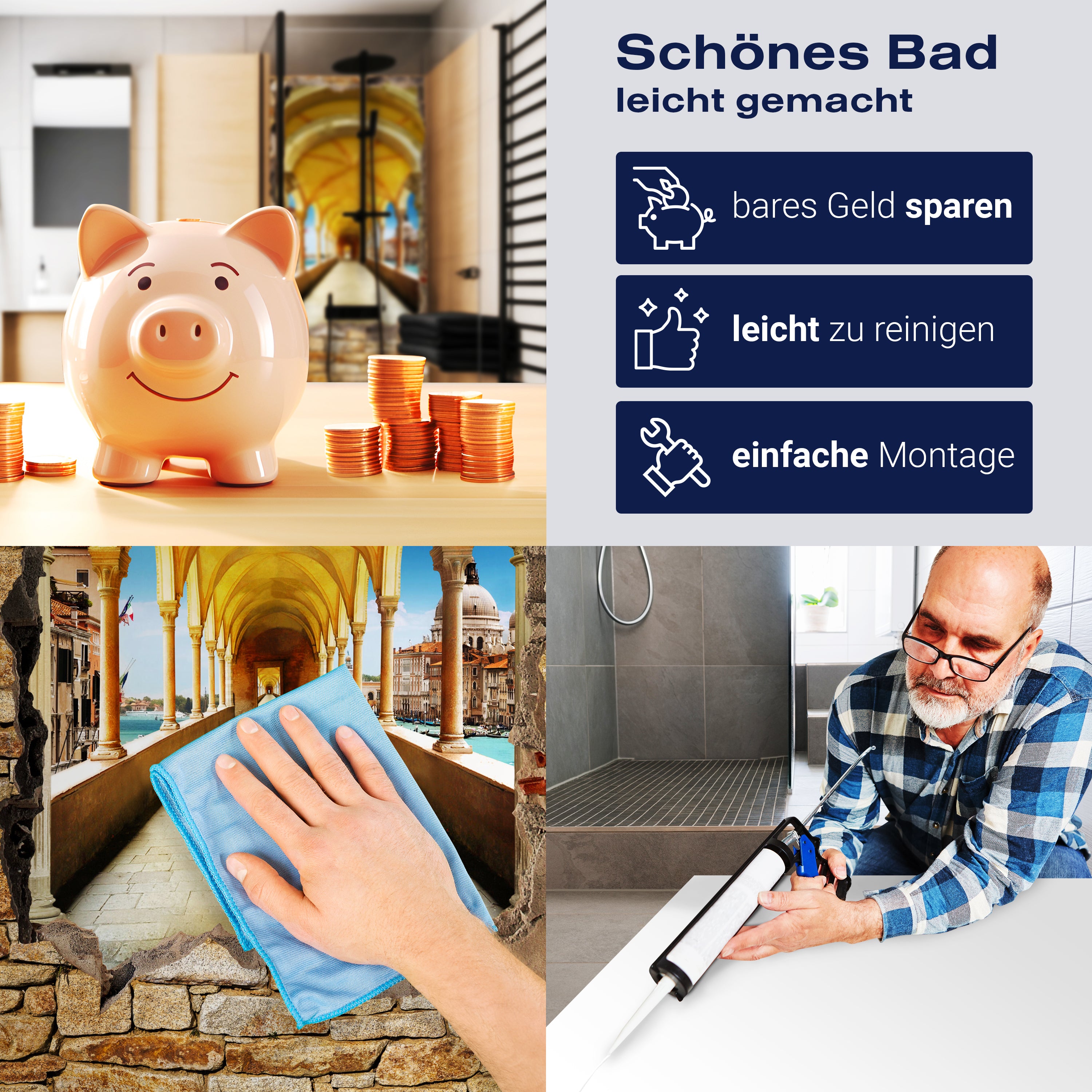 ür eine optimale Langlebigkeit ist es wichtig, die Duschrückwände richtig zu pflegen. Sie sollten regelmäßig mit einem weichen Tuch und milden Reinigungsmitteln gereinigt werden, um Kalk- und Seifenrückstände zu entfernen. Scheuermittel oder aggressive Chemikalien sollten vermieden werden, da diese die Oberfläche beschädigen können. Die fugenlose Oberfläche vereinfacht die Reinigung erheblich und trägt dazu bei, dass die Wandverkleidung hygienisch und ansprechend bleibt