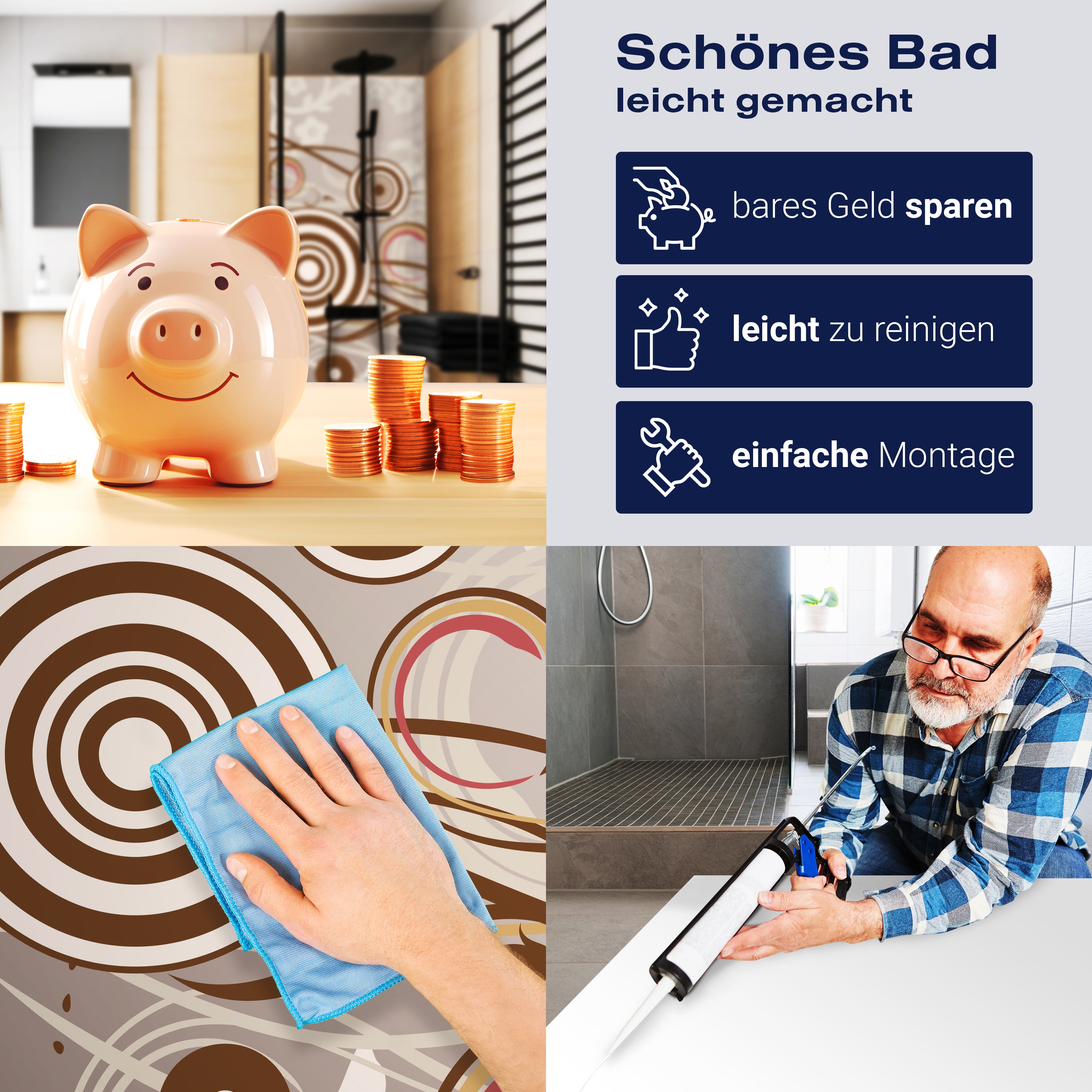 Die Reinigung Deiner Duschwand war noch nie so einfach. In einer Welt, in der Zeit ein kostbares Gut ist, verstehen wir, wie wichtig es ist, Reinigungsprozesse so effizient und mühelos wie möglich zu gestalten. Unsere Duschwände sind speziell dafür entworfen, Dein Leben leichter zu machen. Dank der glatten Oberfläche und der widerstandsfähigen Beschichtung lassen sich Spritzer und Flecken ohne großen Aufwand entfernen – ein schneller Wisch mit einem handelsüblichen Lappen, Spül- oder Wischtuch, und Deine Rückwand sieht aus wie neu.