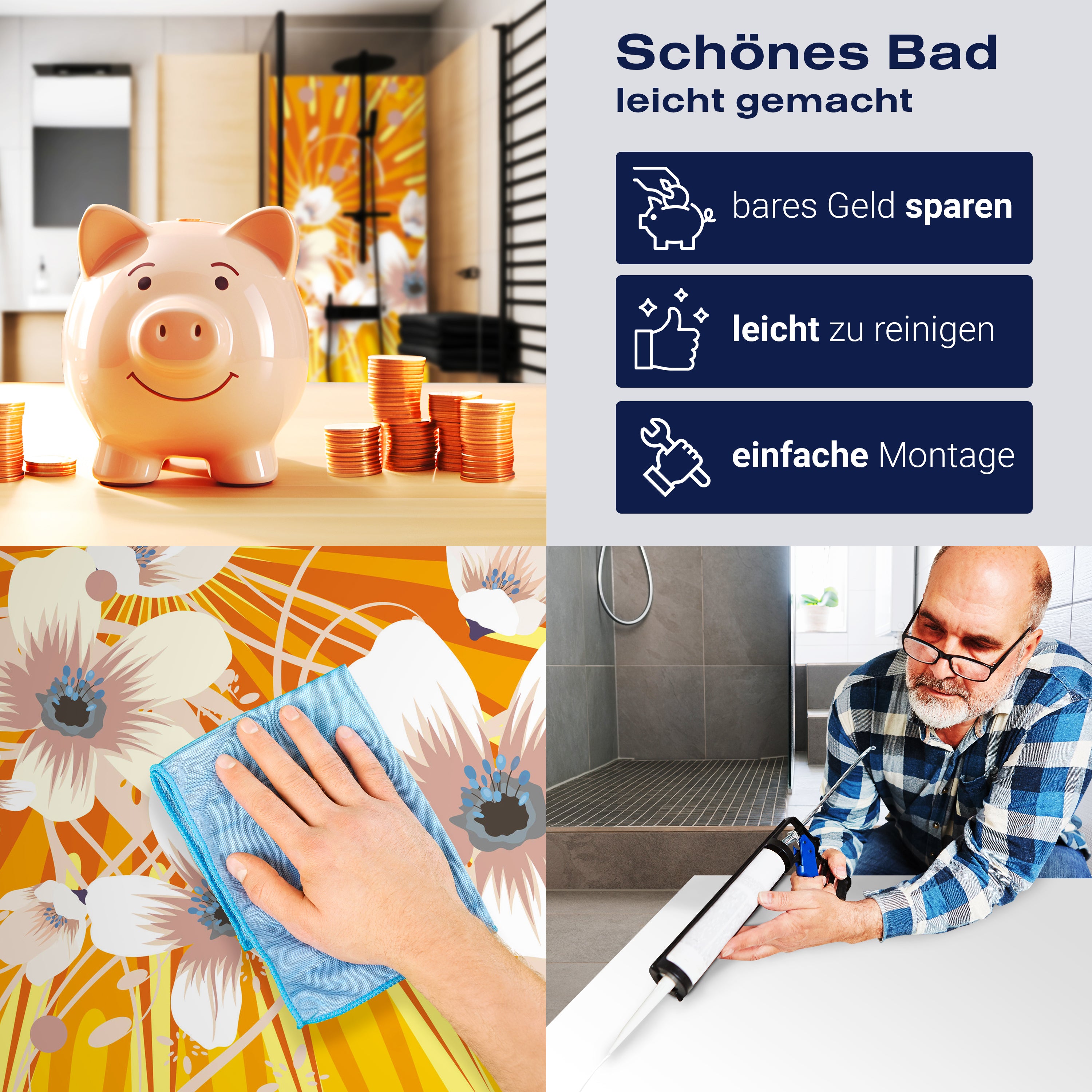 Die Reinigung Deiner Duschwand war noch nie so einfach. In einer Welt, in der Zeit ein kostbares Gut ist, verstehen wir, wie wichtig es ist, Reinigungsprozesse so effizient und mühelos wie möglich zu gestalten. Unsere Duschwände sind speziell dafür entworfen, Dein Leben leichter zu machen. Dank der glatten Oberfläche und der widerstandsfähigen Beschichtung lassen sich Spritzer und Flecken ohne großen Aufwand entfernen – ein schneller Wisch mit einem handelsüblichen Lappen, Spül- oder Wischtuch, und Deine Rückwand sieht aus wie neu.