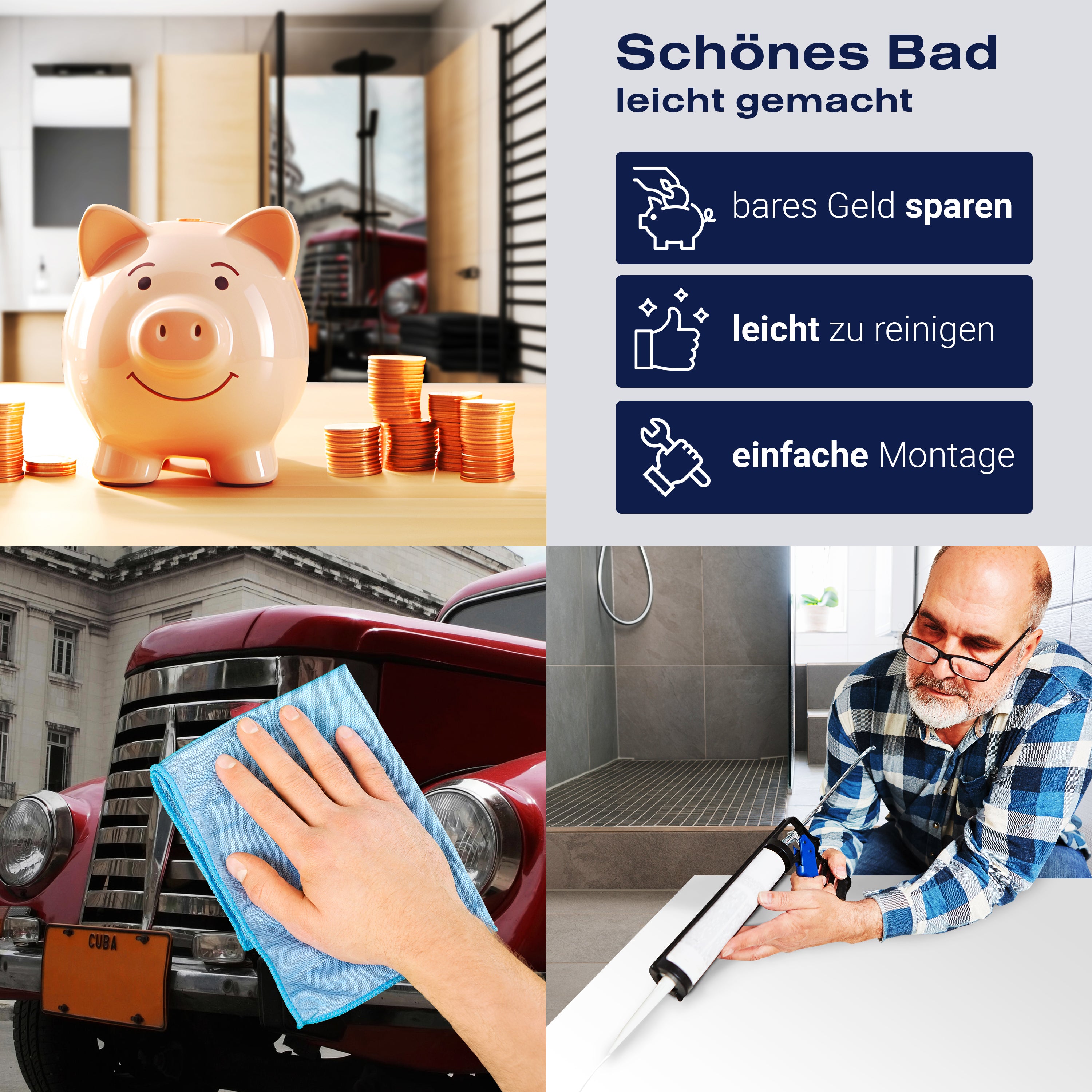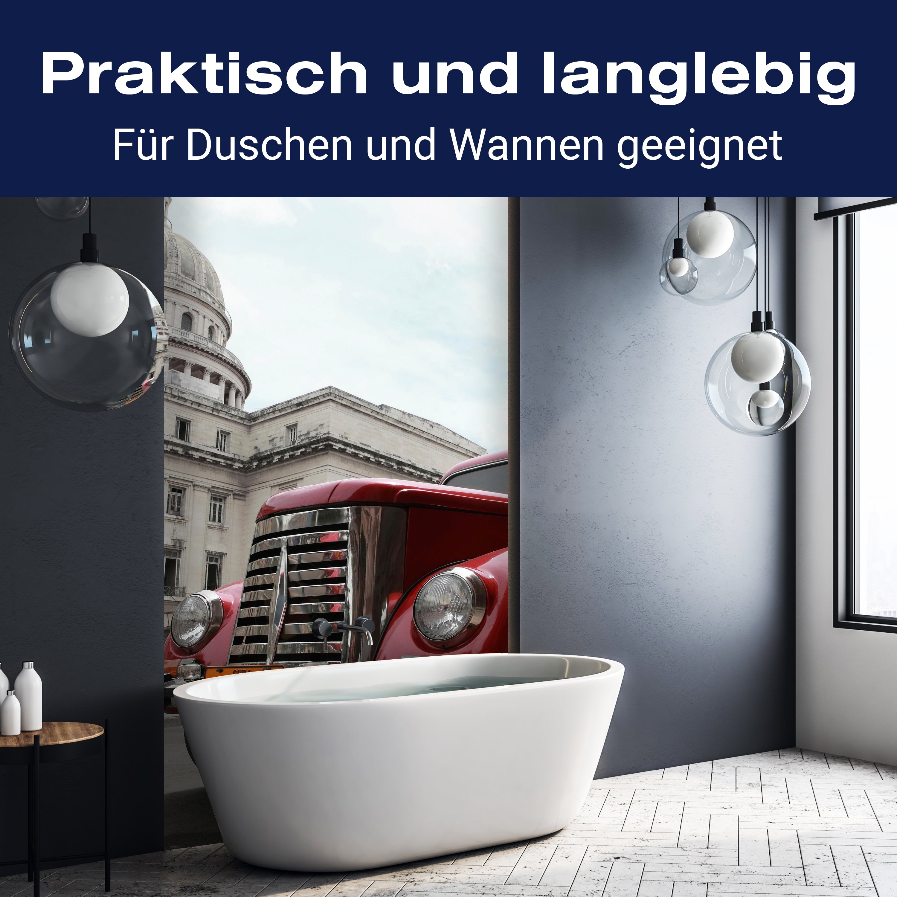 Bist du es leid, auf die langweiligen, schwer zu reinigende Fliesen in deiner Dusche zu schauen? Stell dir vor, wie dein Bad mit einer stilvollen, modernen Rückwand zum Leben erwacht! Unsere Duschwand 'Oldtimer' ist nicht nur ein optisches Highlight, sondern auch praktisch und pflegeleicht.