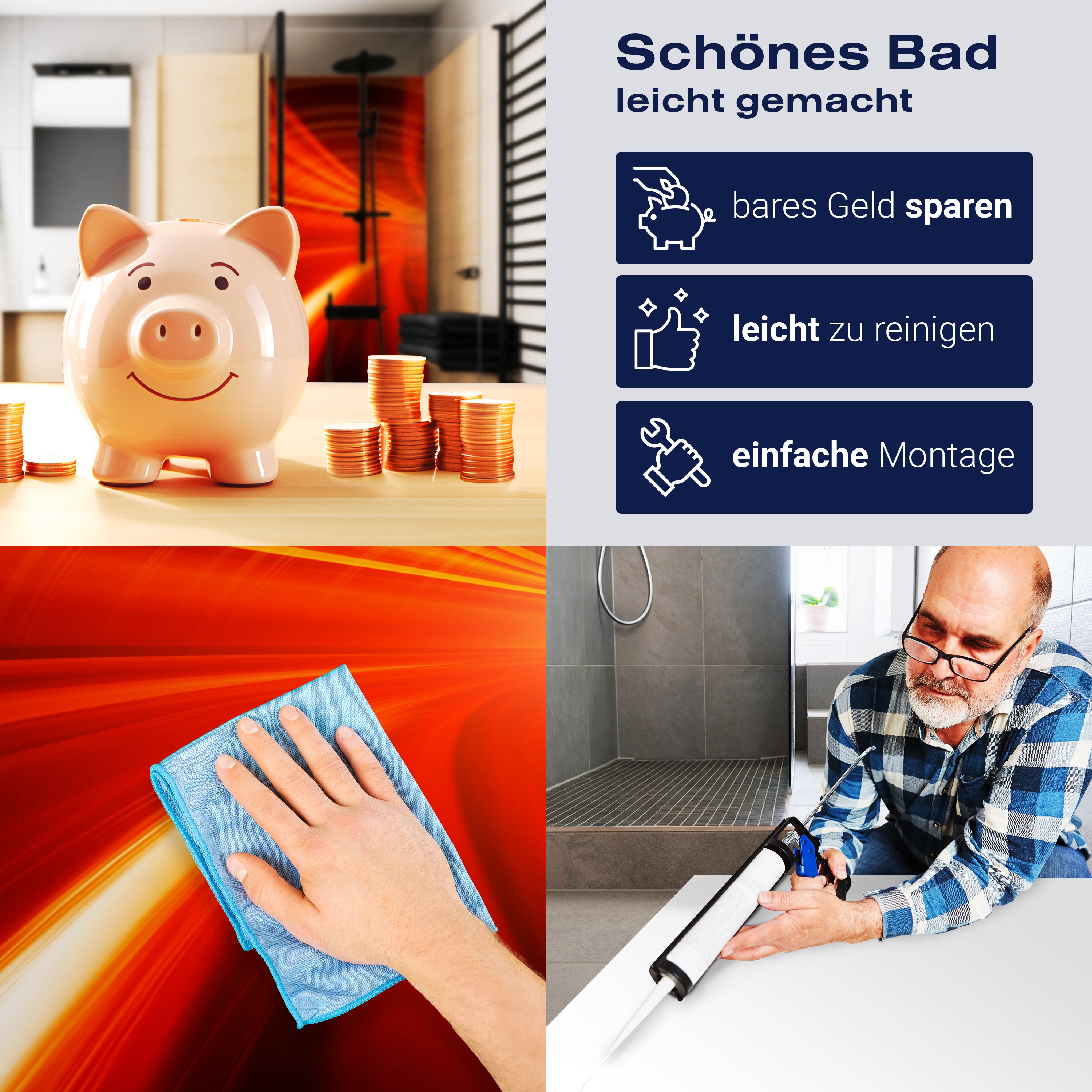 Die Reinigung Deiner Duschwand war noch nie so einfach. In einer Welt, in der Zeit ein kostbares Gut ist, verstehen wir, wie wichtig es ist, Reinigungsprozesse so effizient und mühelos wie möglich zu gestalten. Unsere Duschwände sind speziell dafür entworfen, Dein Leben leichter zu machen. Dank der glatten Oberfläche und der widerstandsfähigen Beschichtung lassen sich Spritzer und Flecken ohne großen Aufwand entfernen – ein schneller Wisch mit einem handelsüblichen Lappen, Spül- oder Wischtuch, und Deine Rückwand sieht aus wie neu.