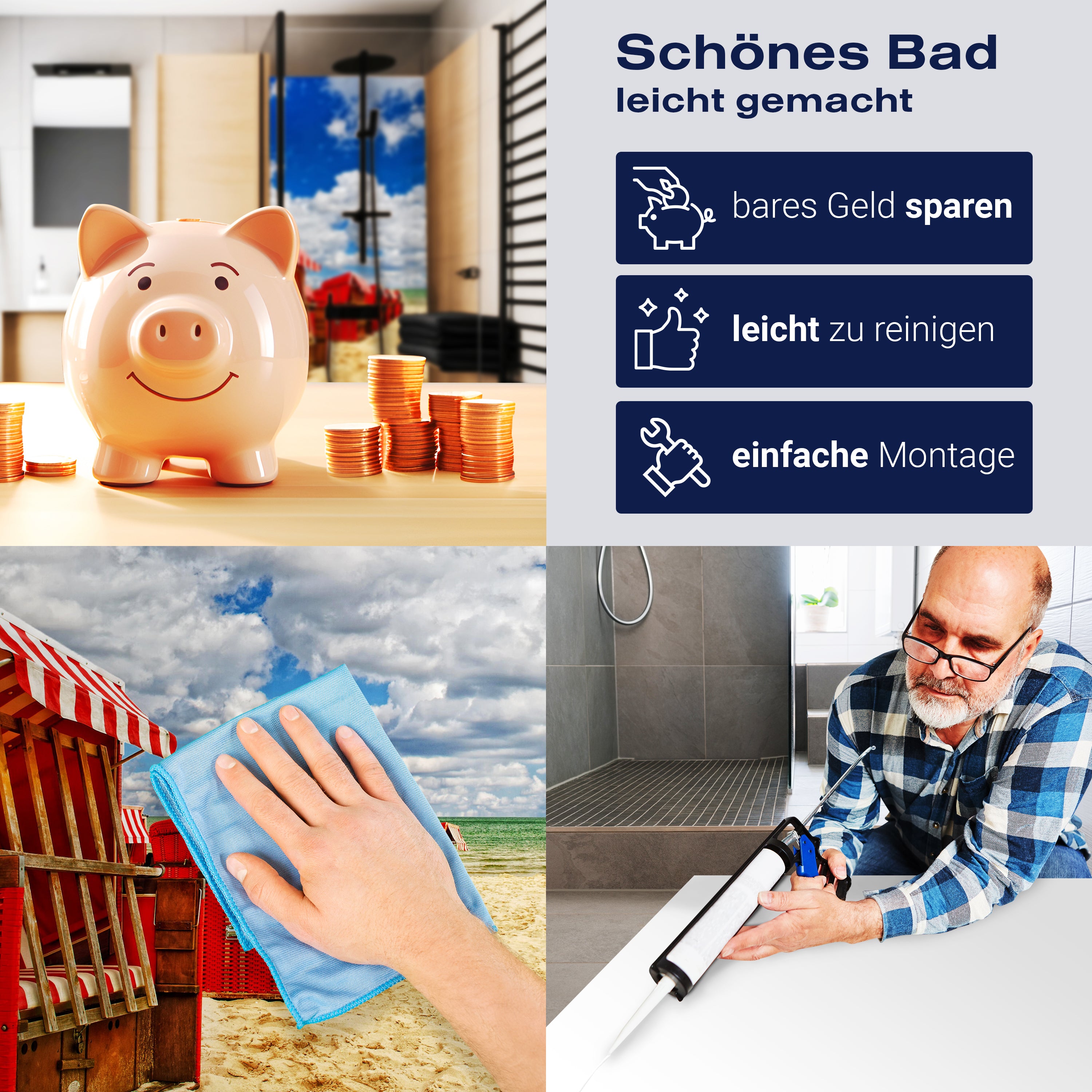 Die Reinigung Deiner Duschwand war noch nie so einfach. In einer Welt, in der Zeit ein kostbares Gut ist, verstehen wir, wie wichtig es ist, Reinigungsprozesse so effizient und mühelos wie möglich zu gestalten. Unsere Duschwände sind speziell dafür entworfen, Dein Leben leichter zu machen. Dank der glatten Oberfläche und der widerstandsfähigen Beschichtung lassen sich Spritzer und Flecken ohne großen Aufwand entfernen – ein schneller Wisch mit einem handelsüblichen Lappen, Spül- oder Wischtuch, und Deine Rückwand sieht aus wie neu.
