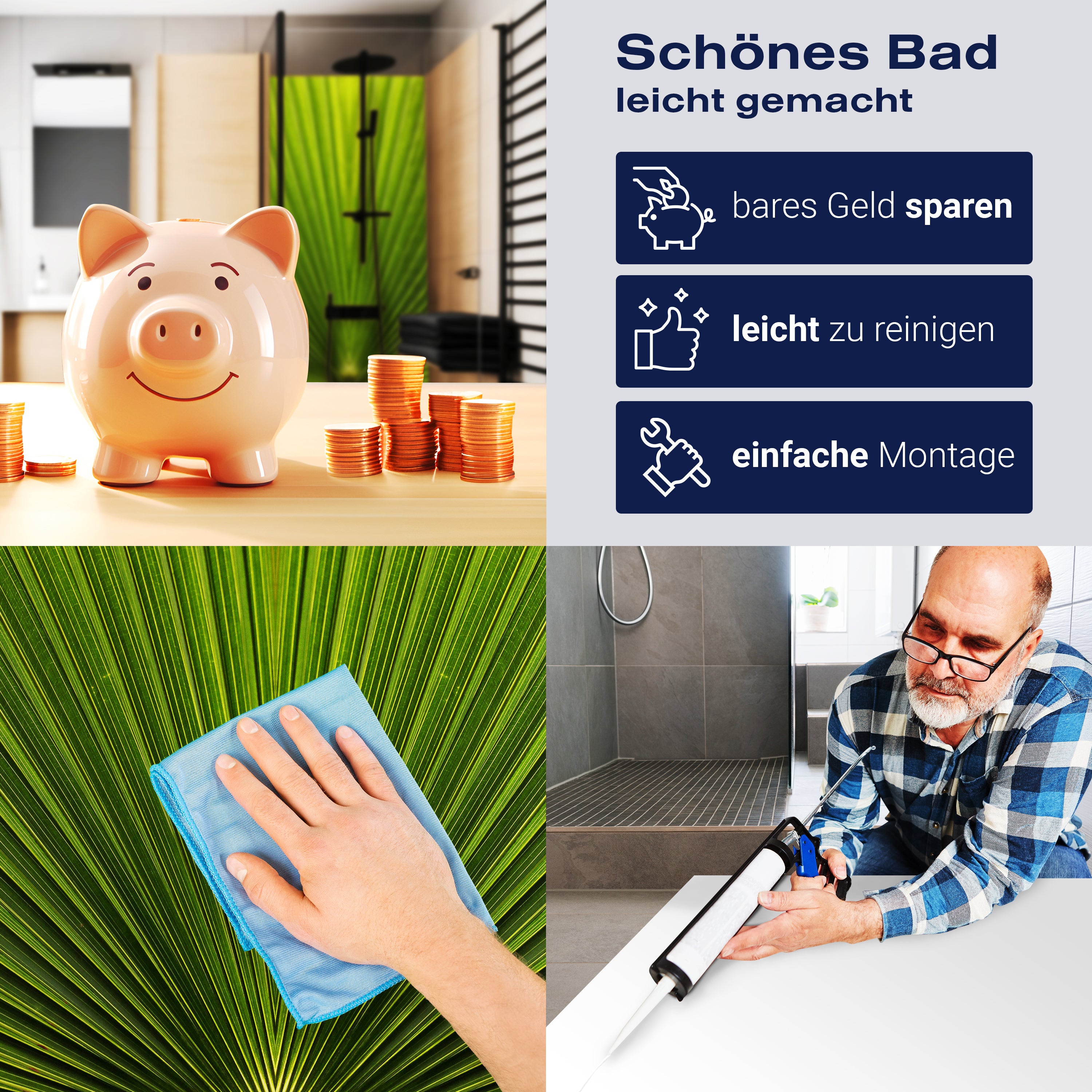 Die Reinigung Deiner Duschwand war noch nie so einfach. In einer Welt, in der Zeit ein kostbares Gut ist, verstehen wir, wie wichtig es ist, Reinigungsprozesse so effizient und mühelos wie möglich zu gestalten. Unsere Duschwände sind speziell dafür entworfen, Dein Leben leichter zu machen. Dank der glatten Oberfläche und der widerstandsfähigen Beschichtung lassen sich Spritzer und Flecken ohne großen Aufwand entfernen – ein schneller Wisch mit einem handelsüblichen Lappen, Spül- oder Wischtuch, und Deine Rückwand sieht aus wie neu.
