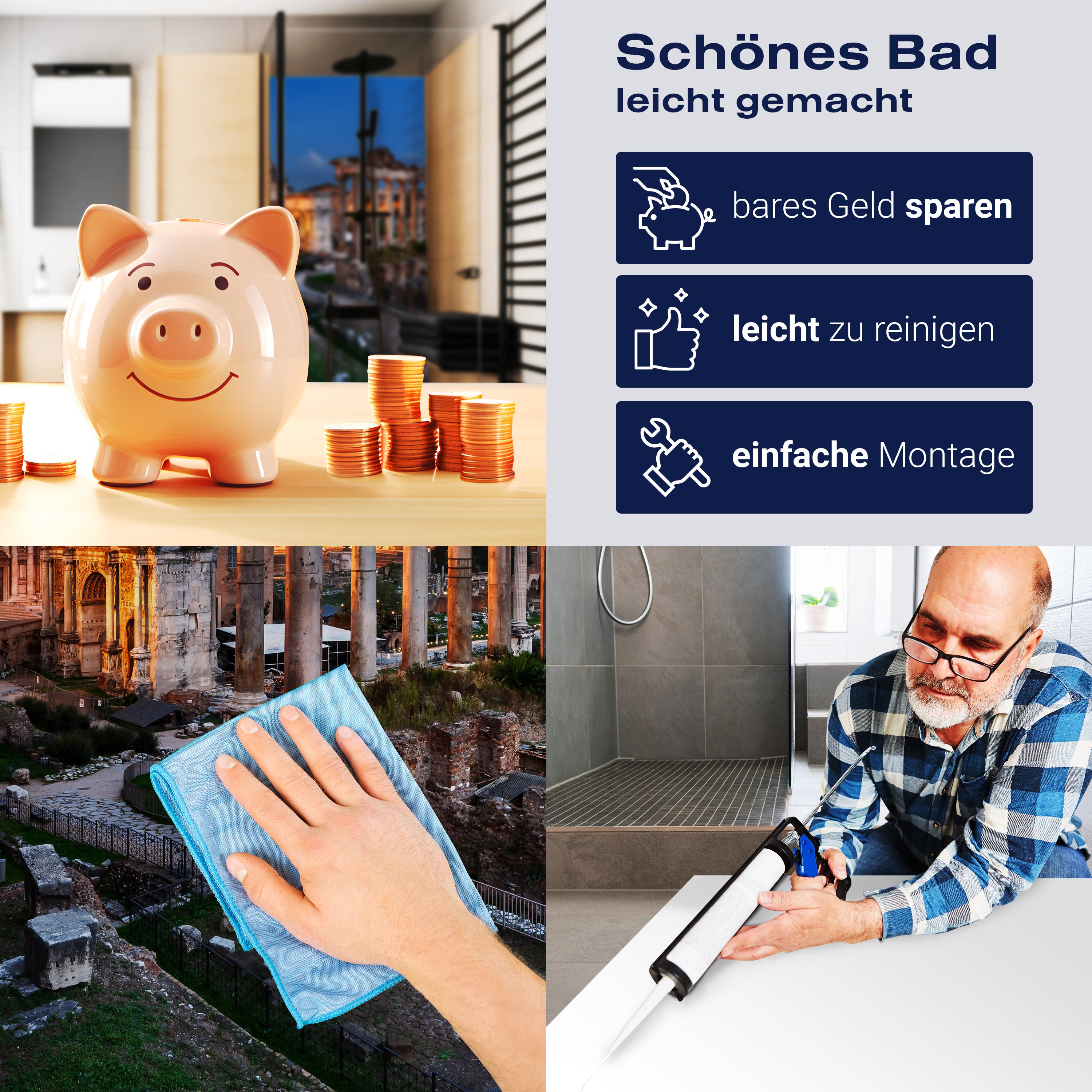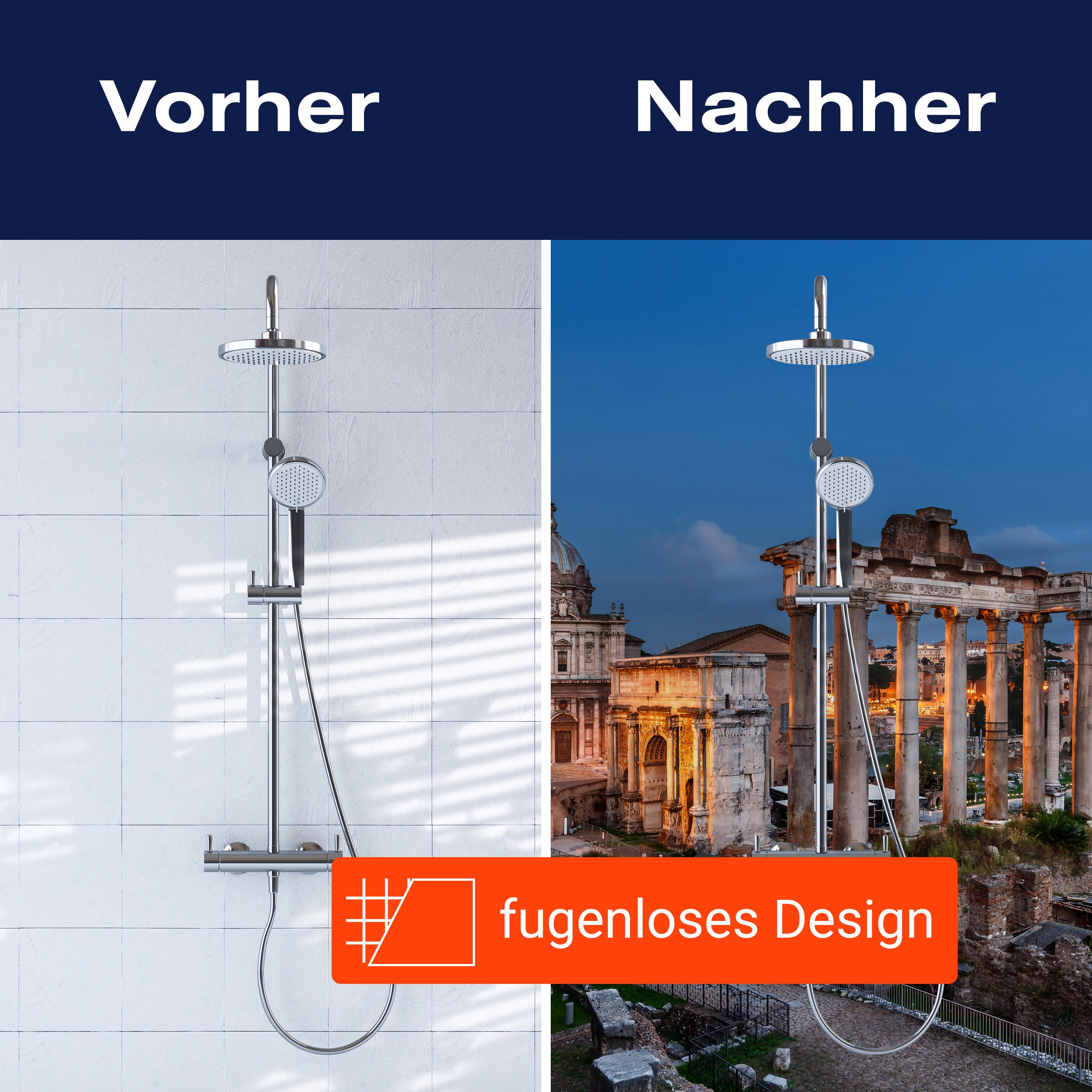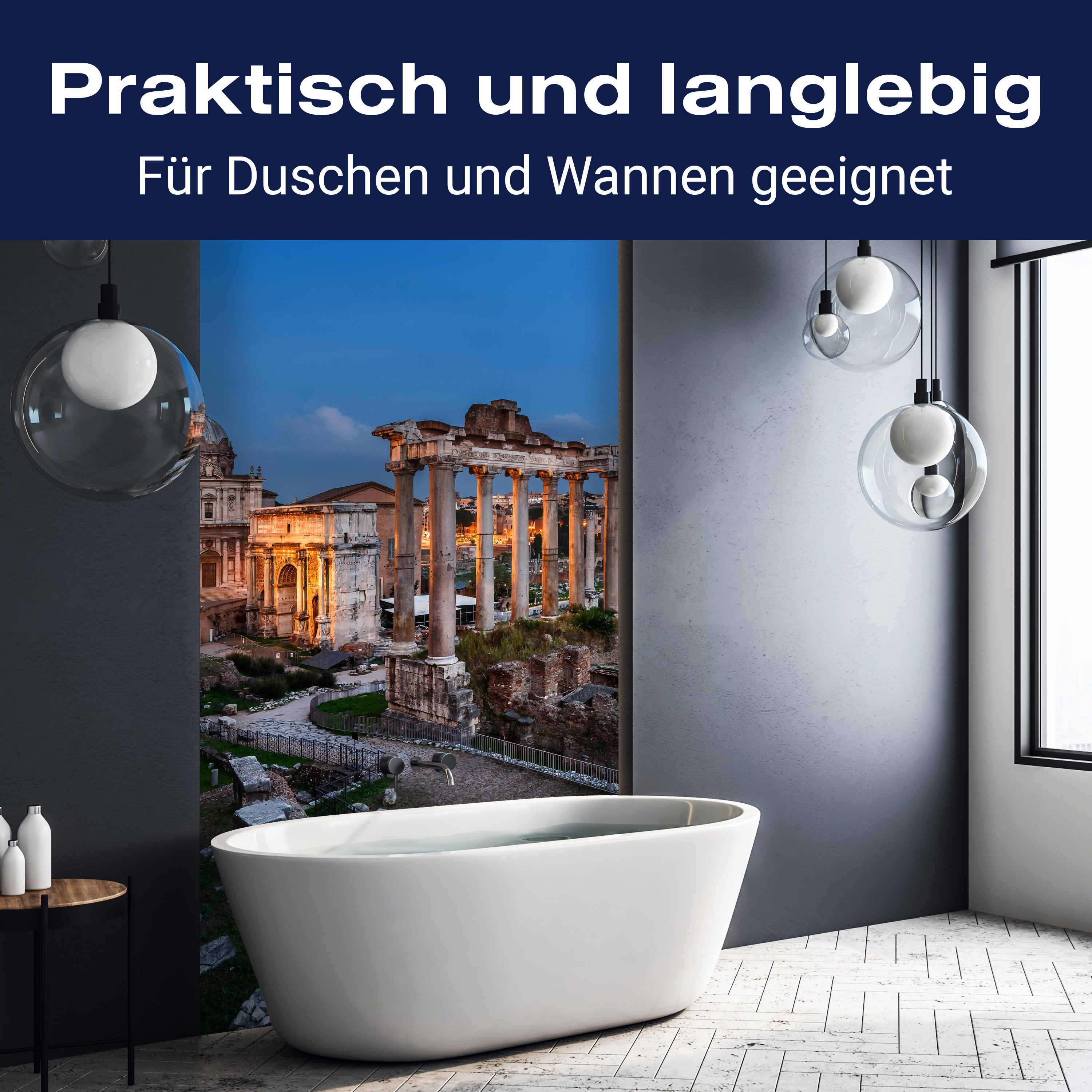 Bist du es leid, auf die langweiligen, schwer zu reinigende Fliesen in deiner Dusche zu schauen? Stell dir vor, wie dein Bad mit einer stilvollen, modernen Rückwand zum Leben erwacht! Unsere Duschwand 'Panorama des römischen Forums' ist nicht nur ein optisches Highlight, sondern auch praktisch und pflegeleicht.