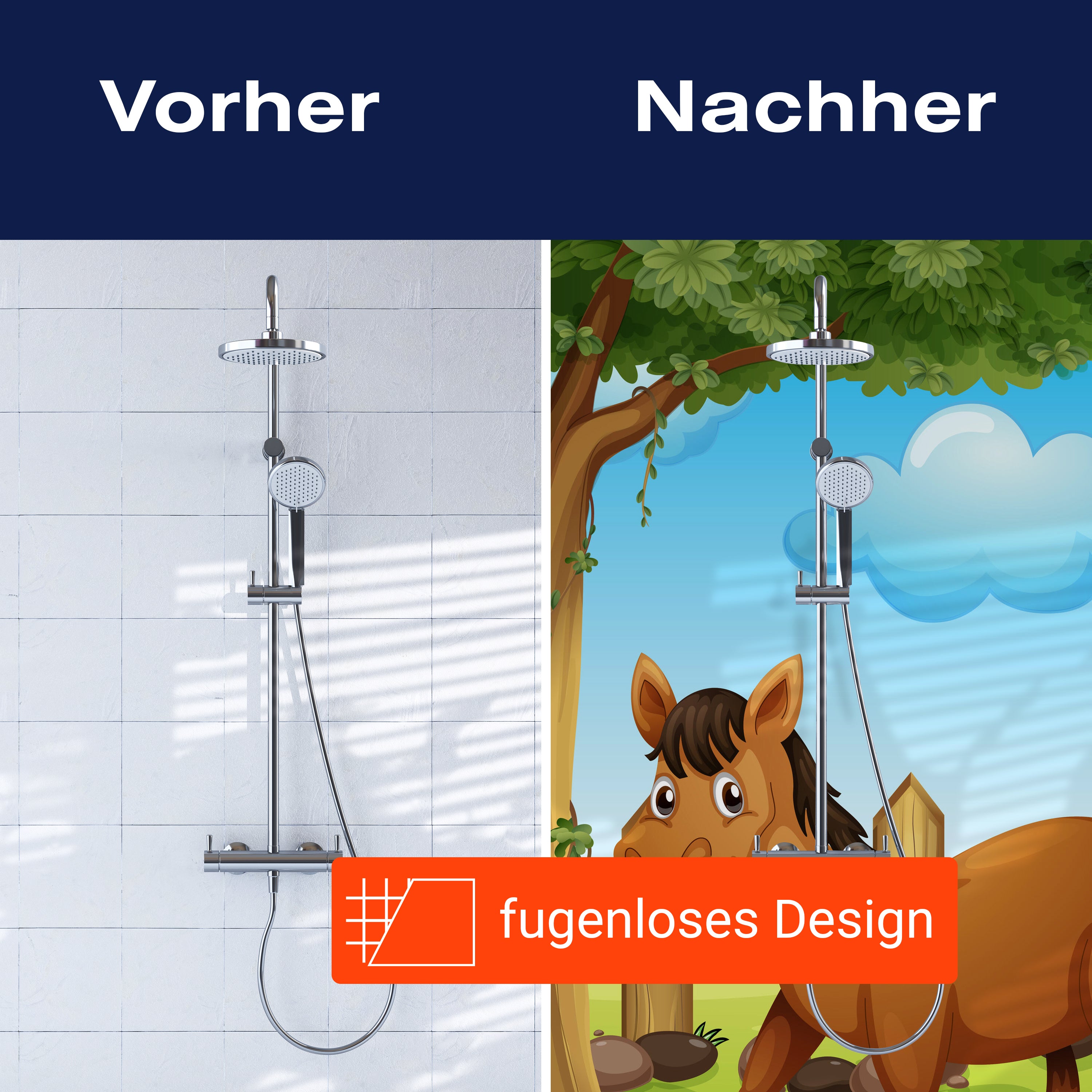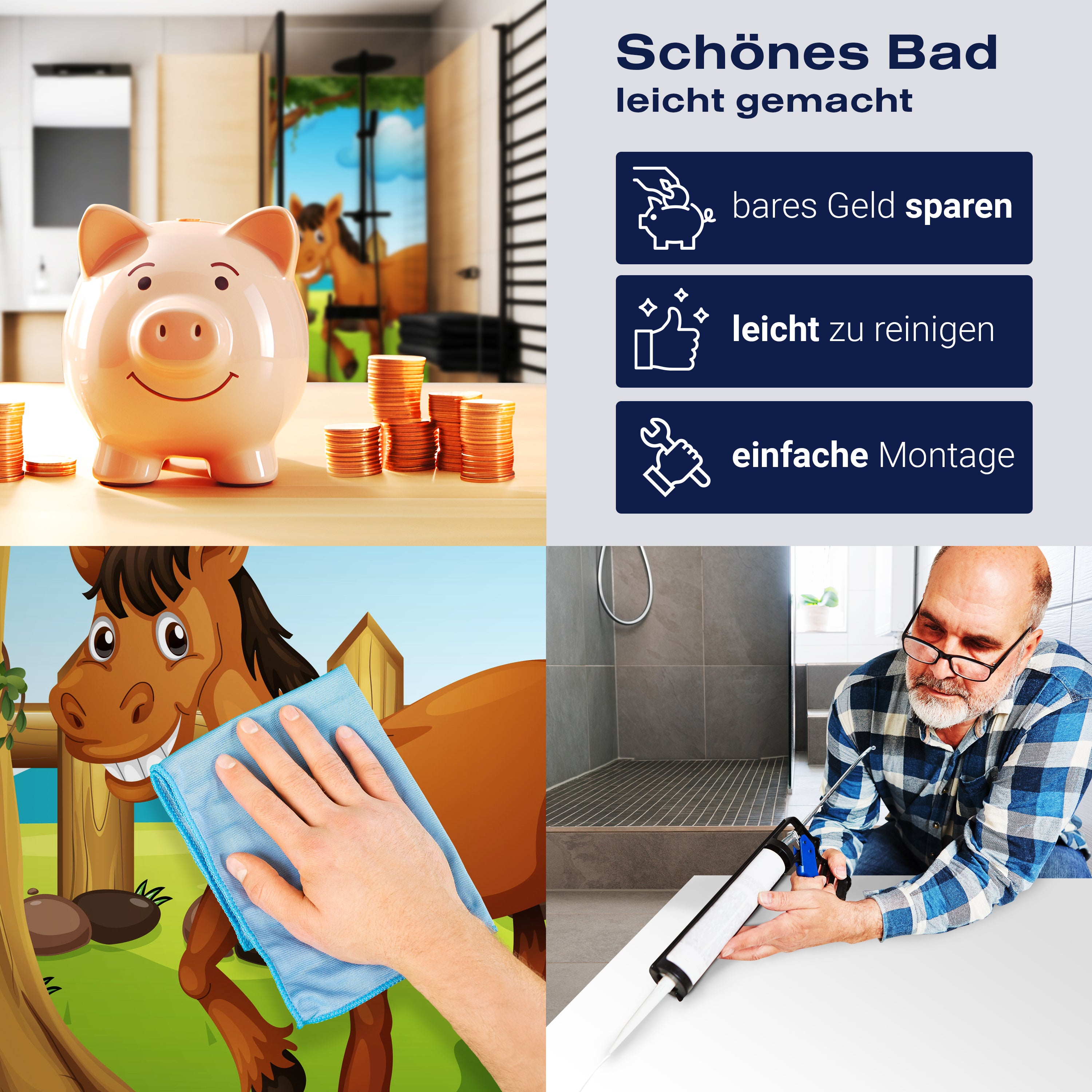 Bist du es leid, auf die langweiligen, schwer zu reinigende Fliesen in deiner Dusche zu schauen? Stell dir vor, wie dein Bad mit einer stilvollen, modernen Rückwand zum Leben erwacht! Unsere Duschwand 'Pferde auf der Wiese' ist nicht nur ein optisches Highlight, sondern auch praktisch und pflegeleicht.